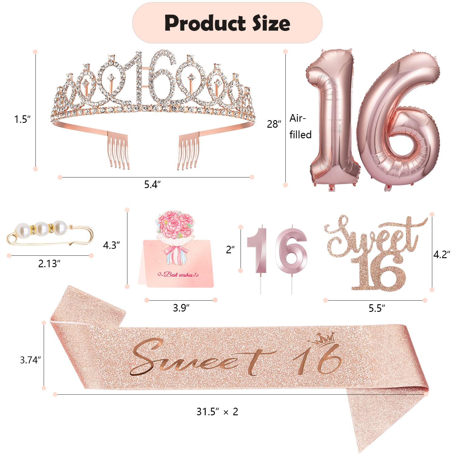 16th Birthday Decorations for Girls: Glittery 16th tiara/crown *1pc, “Sweet 16” sash *1pc, Happy 16th birthday cake topper *1pc, pearl pin*1pc, 1+6 numeral candles *1set, 1+6 numeral balloons *1set, they are exquisitely packaged in the carton.