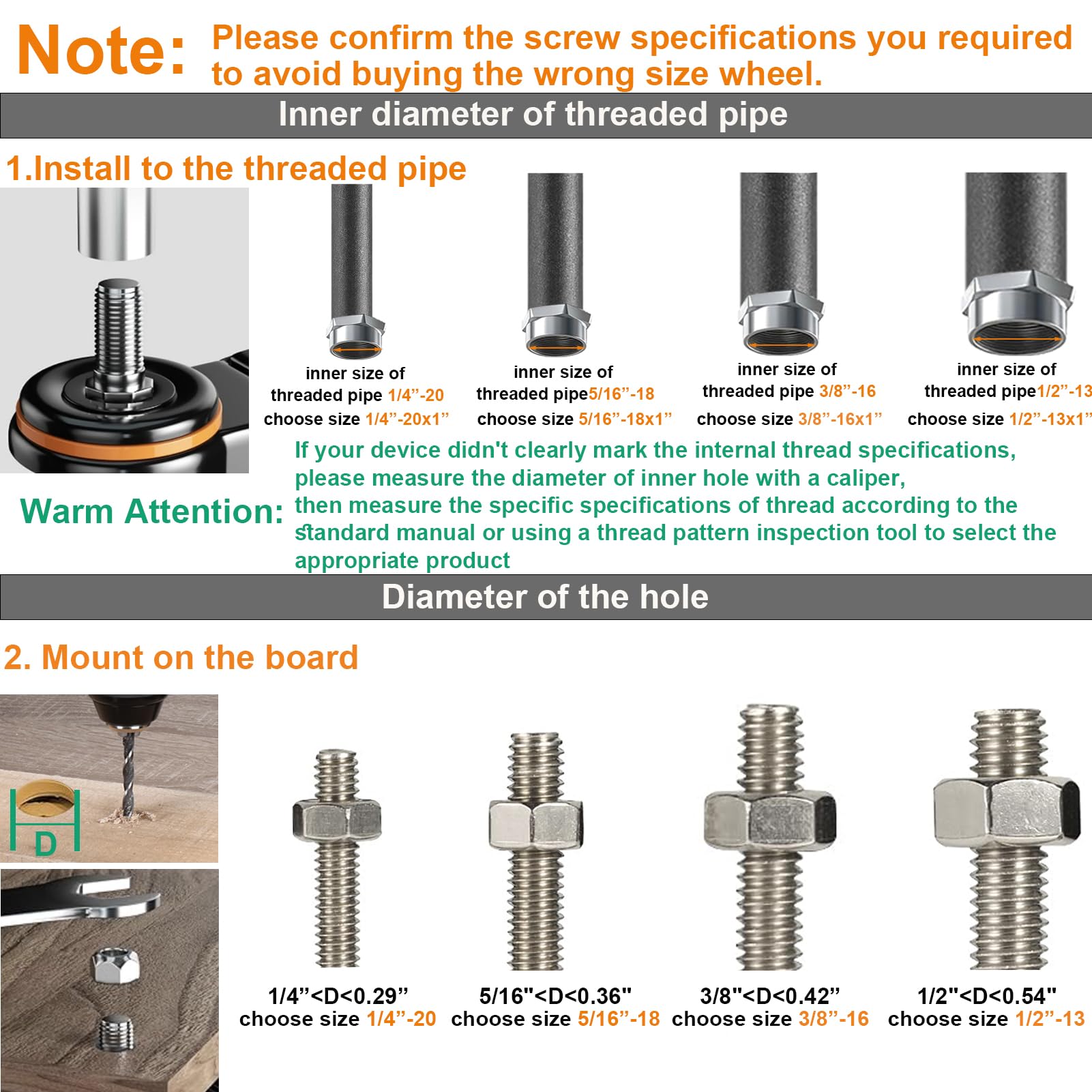 STANDARD AMERICAN SIZE 1/2" -13UNC x 1": Please measure the stem size of your old thread dual locking caster wheel with Brakes before purchasing. Our cart wheels screw size is 1/2" -13x1" (Screw Diameter 1/2", Screw Length 1"). The castors are quickly attached to medium and large equipment like workbench, trolley, carts.