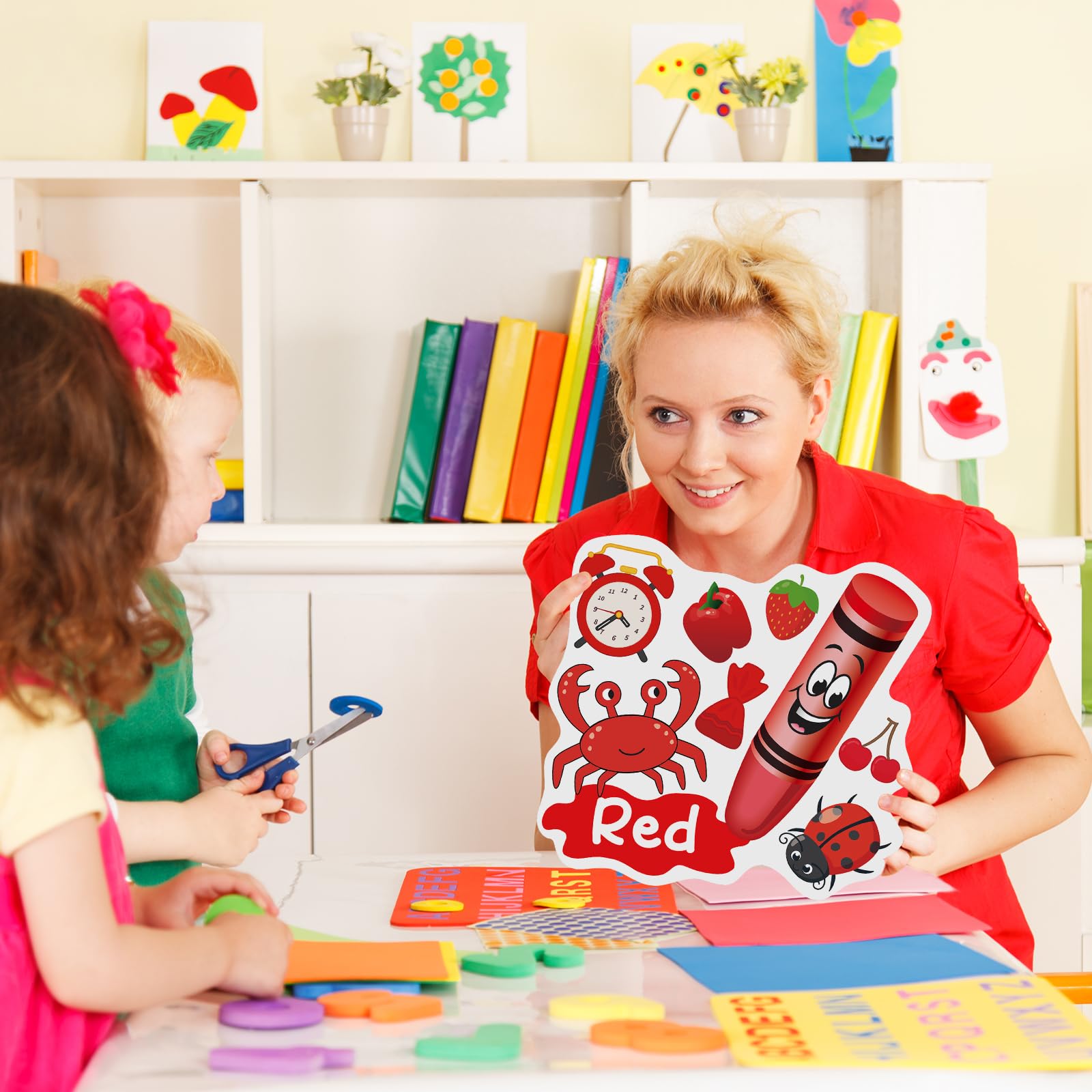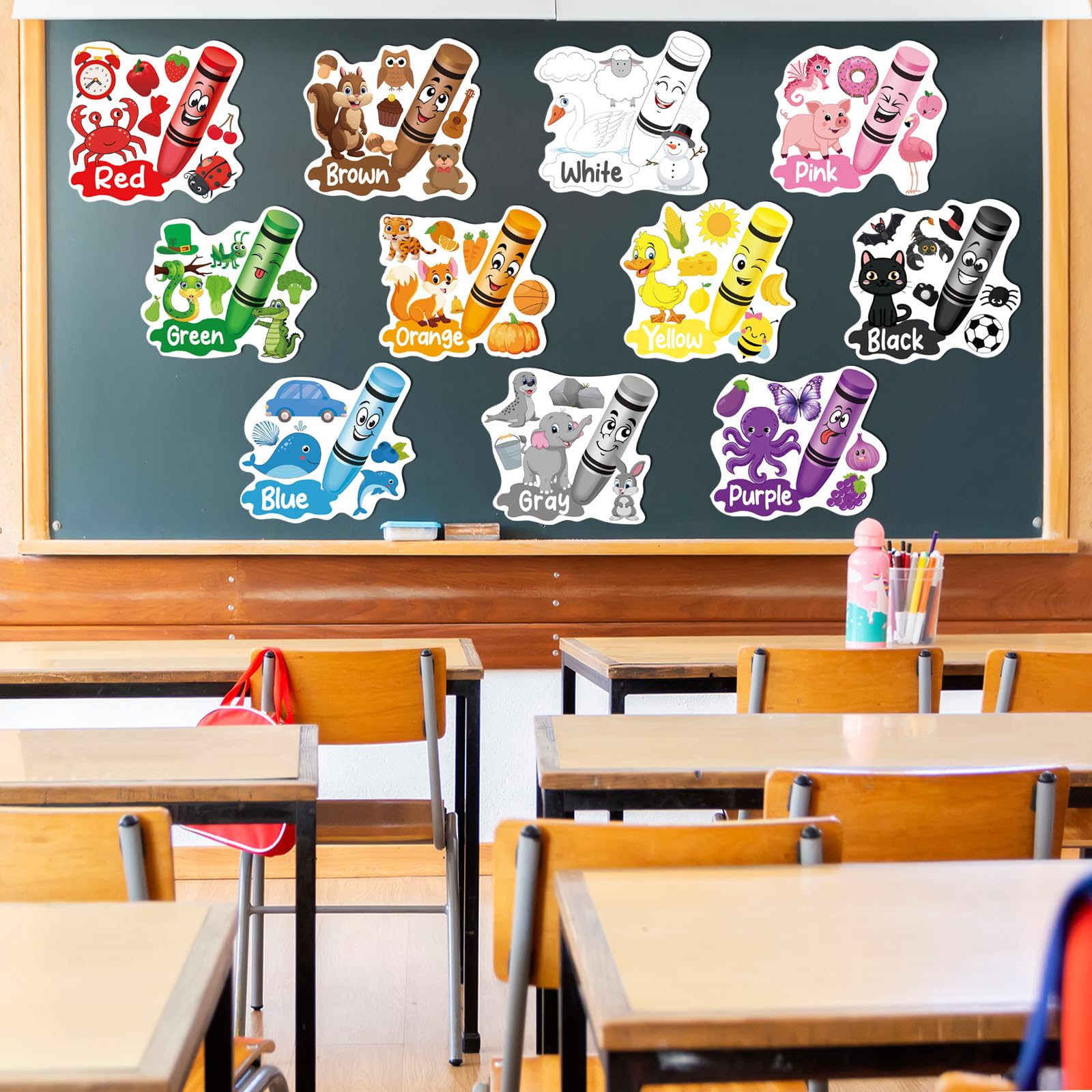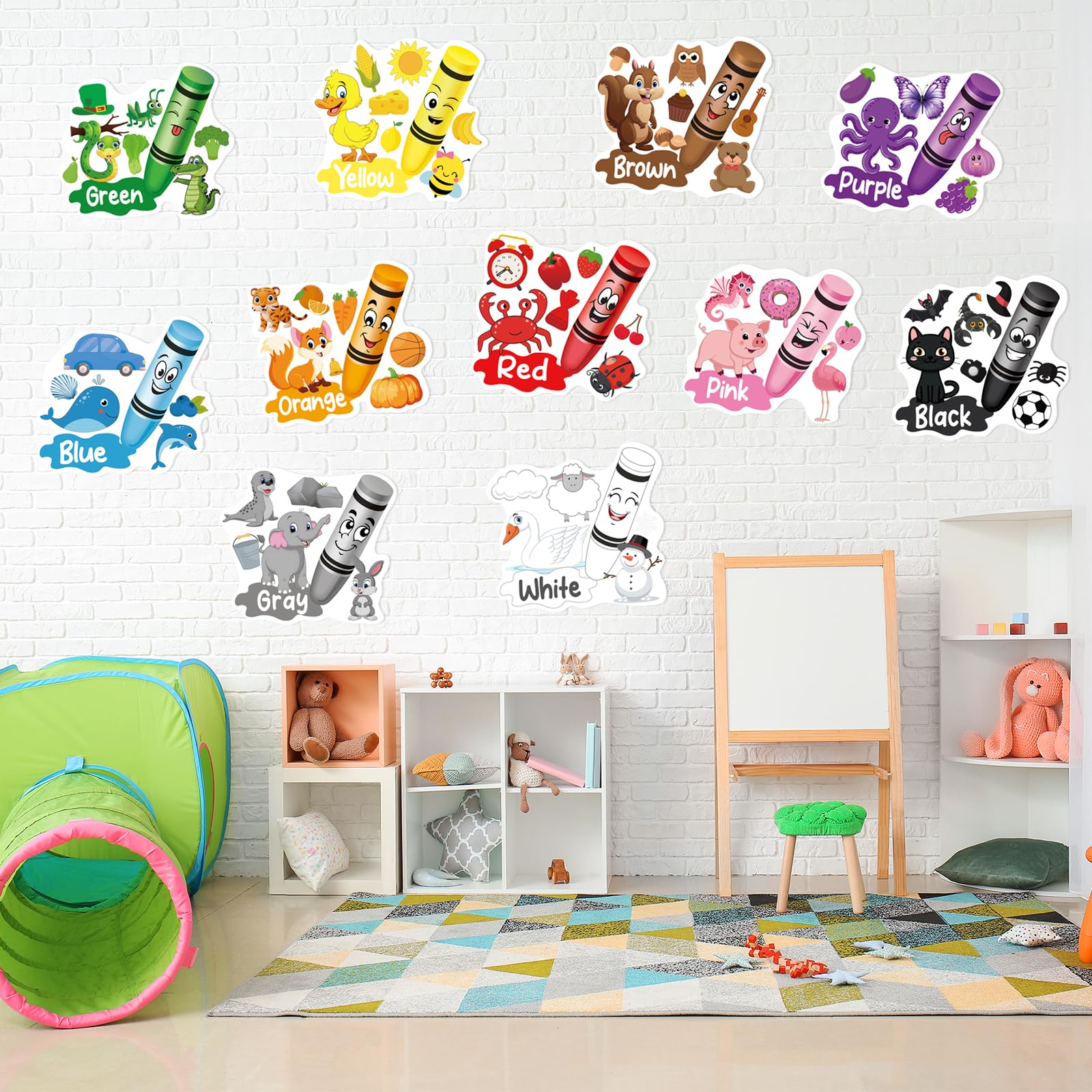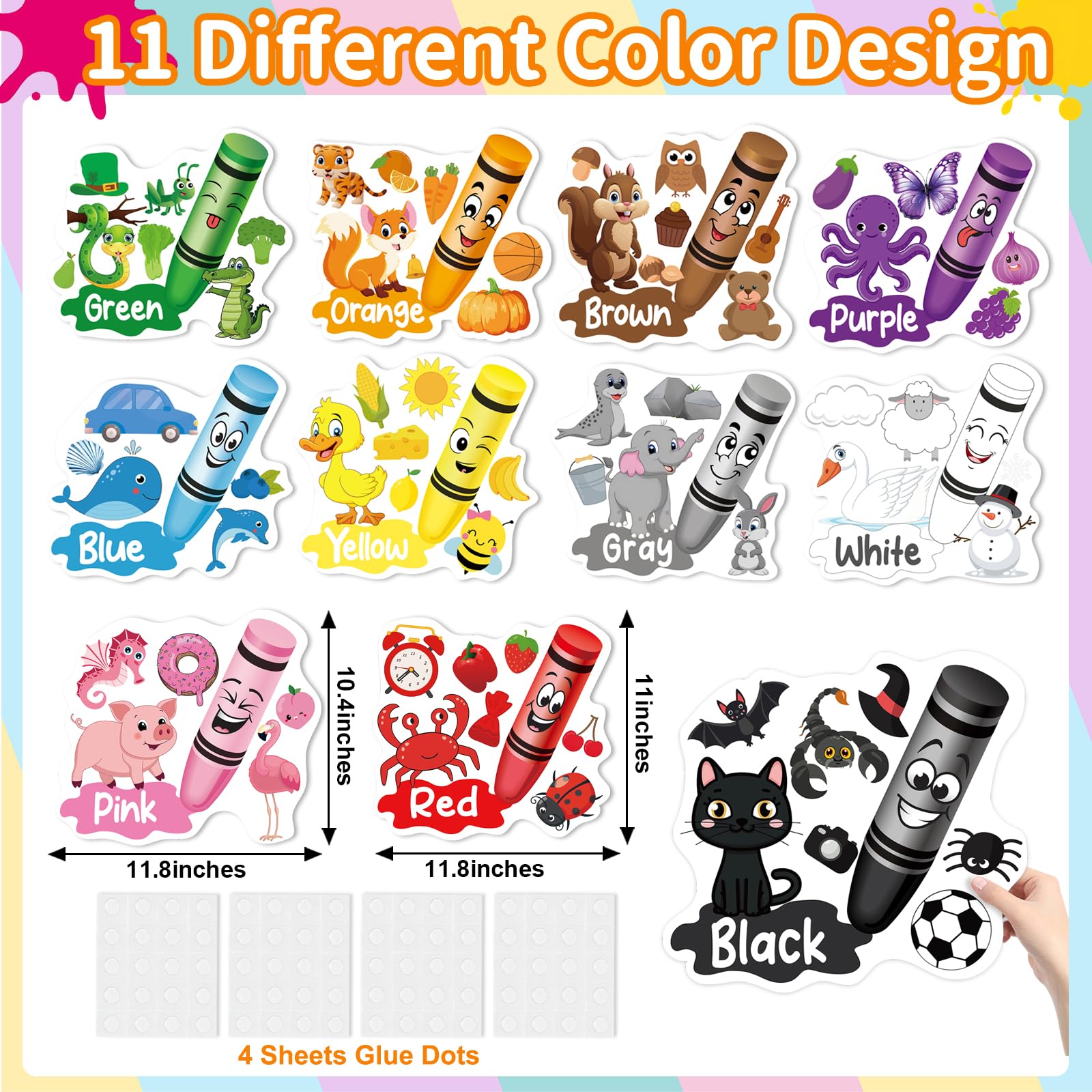What You Will Get: You will receive 11 pieces of crayon bulletin board cutouts with different colors and 80 glue dots to stick the charts, which includes Red, Blue, Black, Gray, White Green, Yellow, Orange, Purple, Brown and Pink as well as various object patterns related to colors, it will deepen kidsβ learning memory.