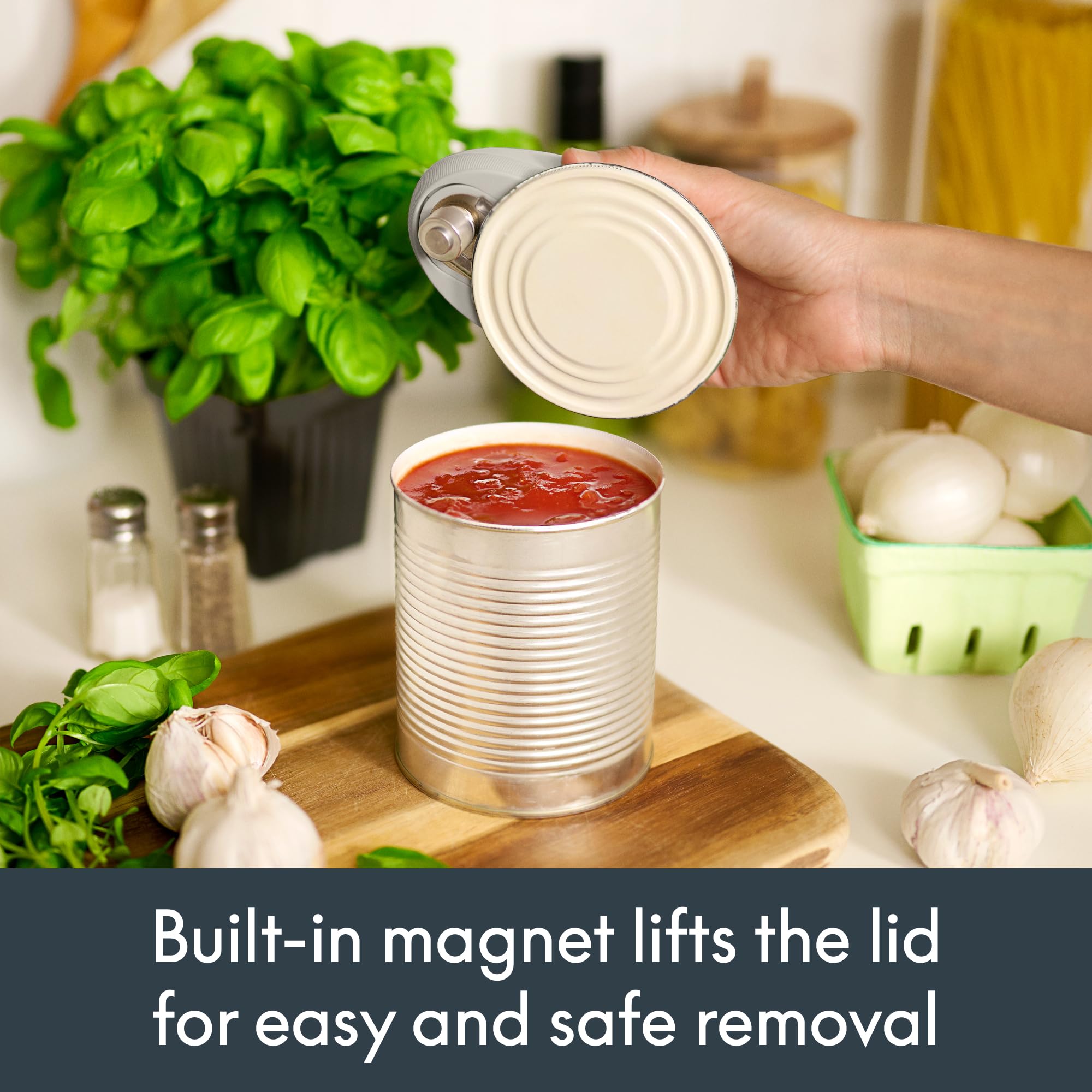 Smooth 360° Cuts + Magnetic Lid Lift: Auto-turn technology cuts cleanly along the lid's edge, leaving smooth edges. The built-in magnet lifts the lid for easy, safe removal.