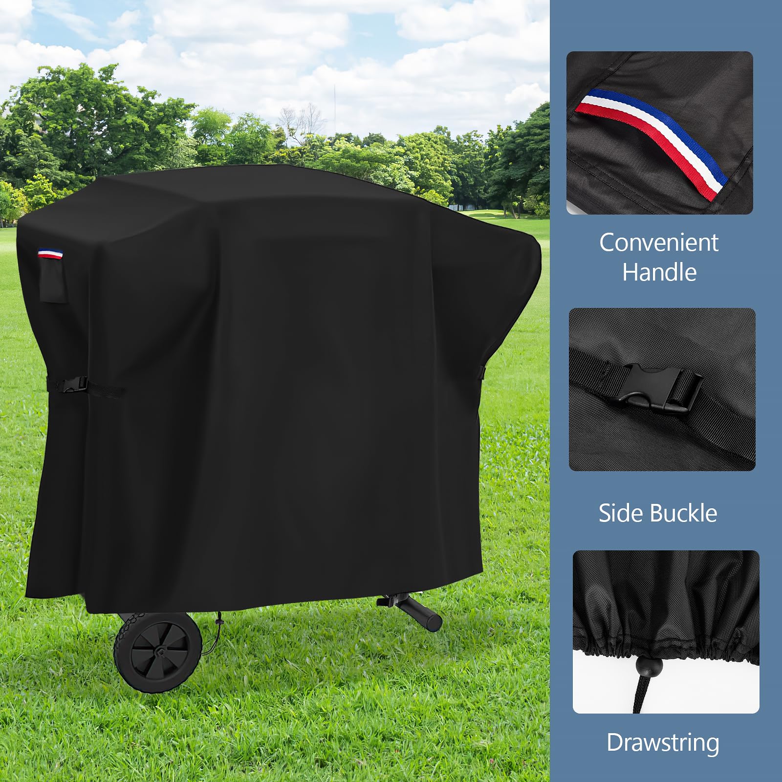Drawstrings & Buckle & Handle: Elastic cord allows the cover to fit better with the grill. Adjustable buckle on the grill egs for better extra stability, so you don't have to worry about the impact of windy weather.The handle is convenient for your daily use