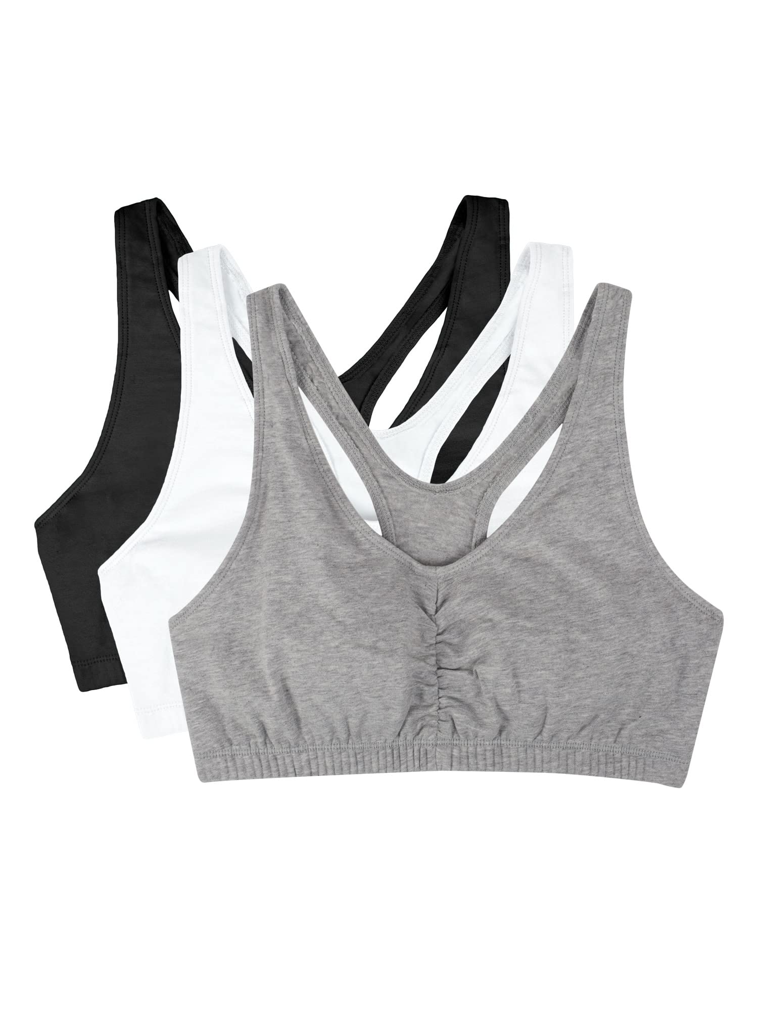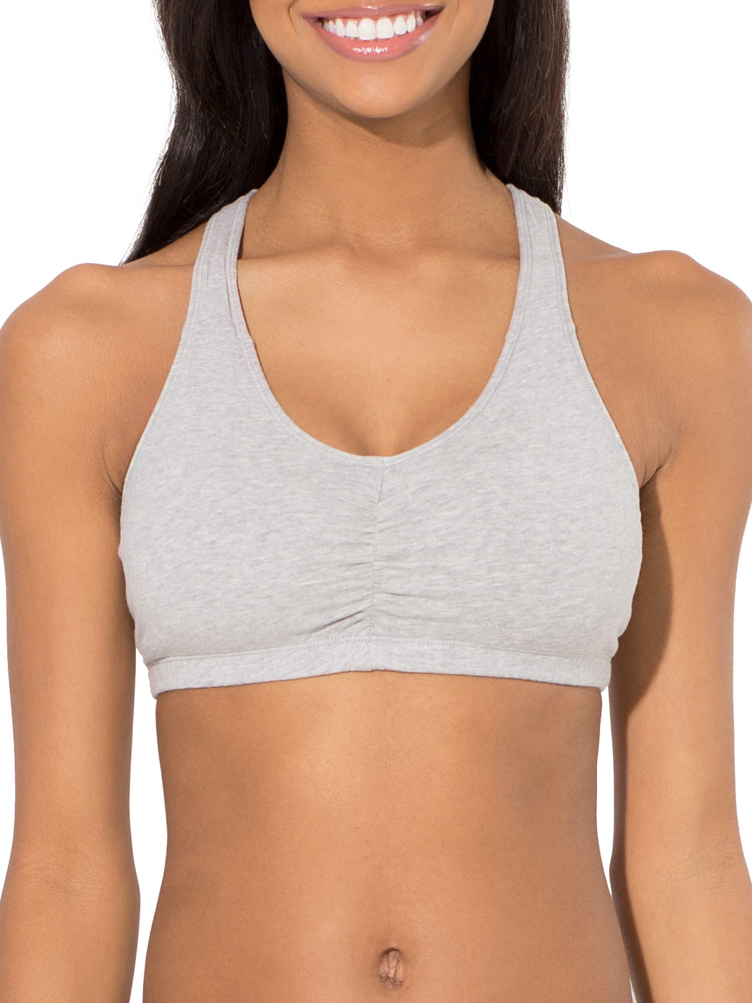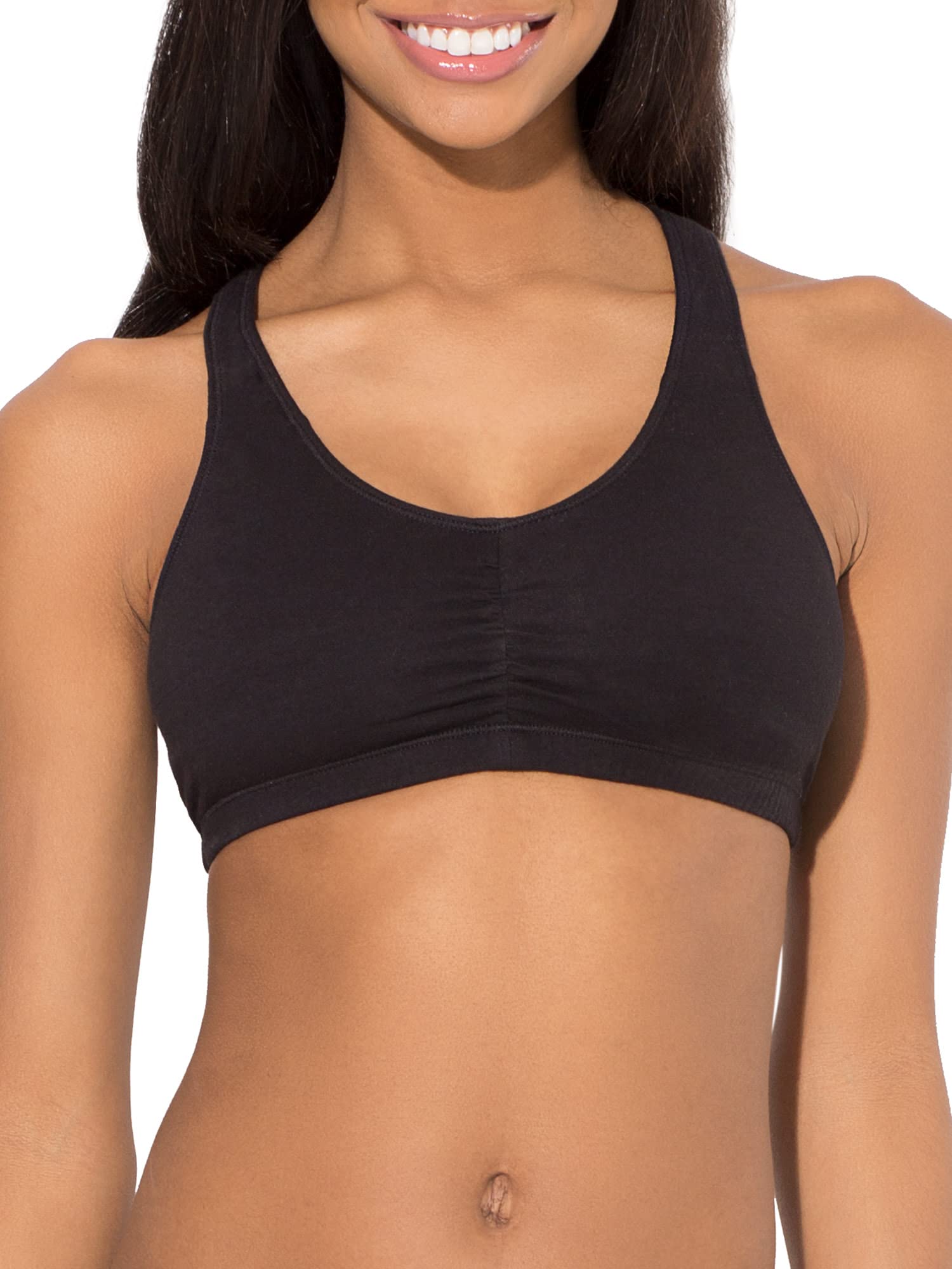 Description The bras you can count on, the classic Fruit of the Loom Women’s Shirred Front Racerback Sports Bras will have you looking and feeling your best. The sports bra is designed with soft, stretch cotton that gives the most breathable and flexible fit and is constructed with an elastic bottom band to lend you support along the way. Full coverage, shirred front helps with shaping and 2-ply construction comfortably hugs the natural figure while offering modesty without padding. This cotton sports bra has a racerback design that gives plenty of room to move and adjustable straps for best fit. Comfy when you need it most and great for low-impact activities, it’s a bra you’ll be reaching for the most and can be layered underneath tank tops, shirts and sweaters. An active lifestyle requires a brand that can give support and comfort. Fruit of the Loom has been one of America’ s most trusted brands for over 200 years. Our Unconditional Guarantee insures that you get the best product every time or your money back. We promise to deliver quality undergarments at an affordable price…always. Start everyday happy with Fruit of the Loom.