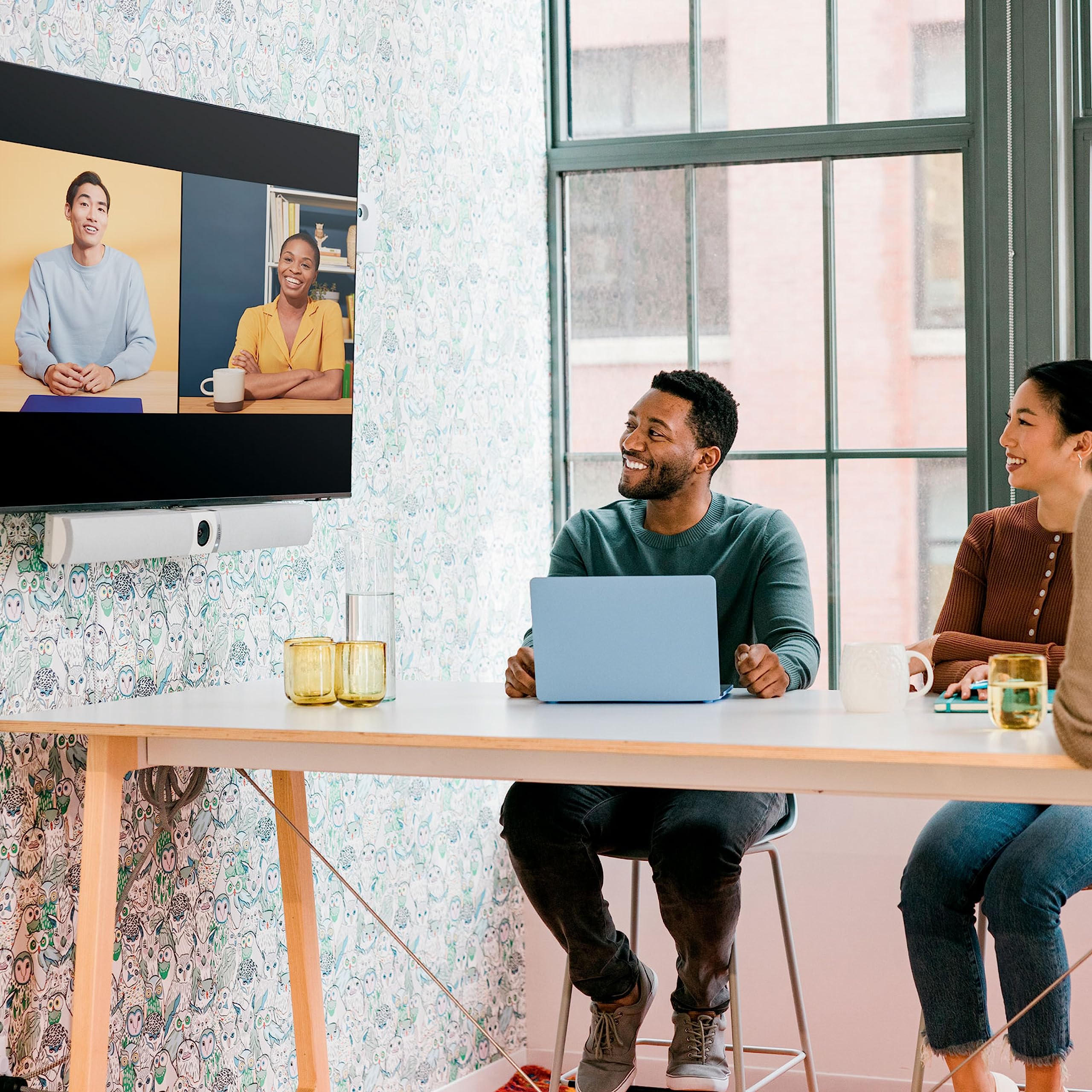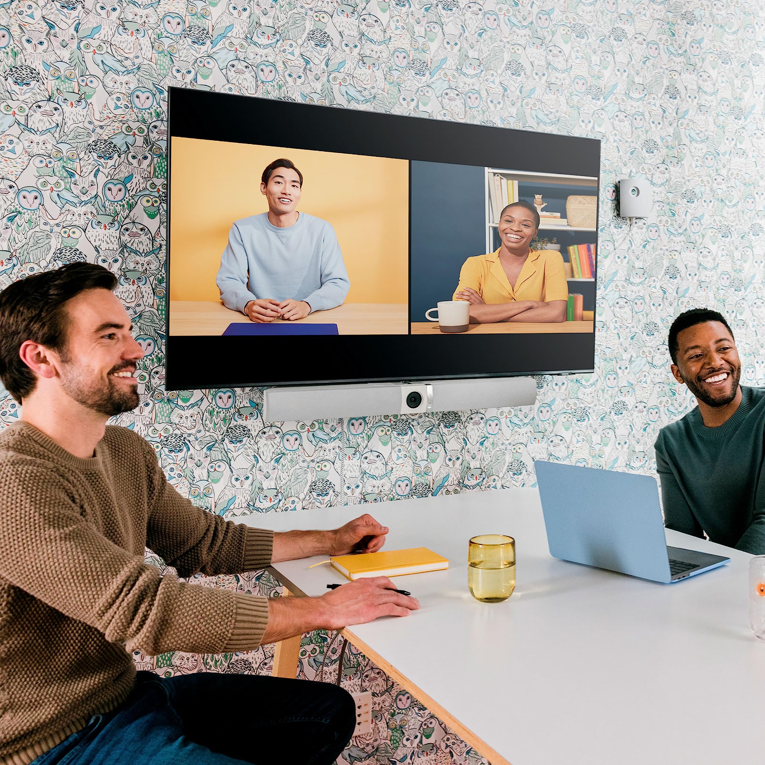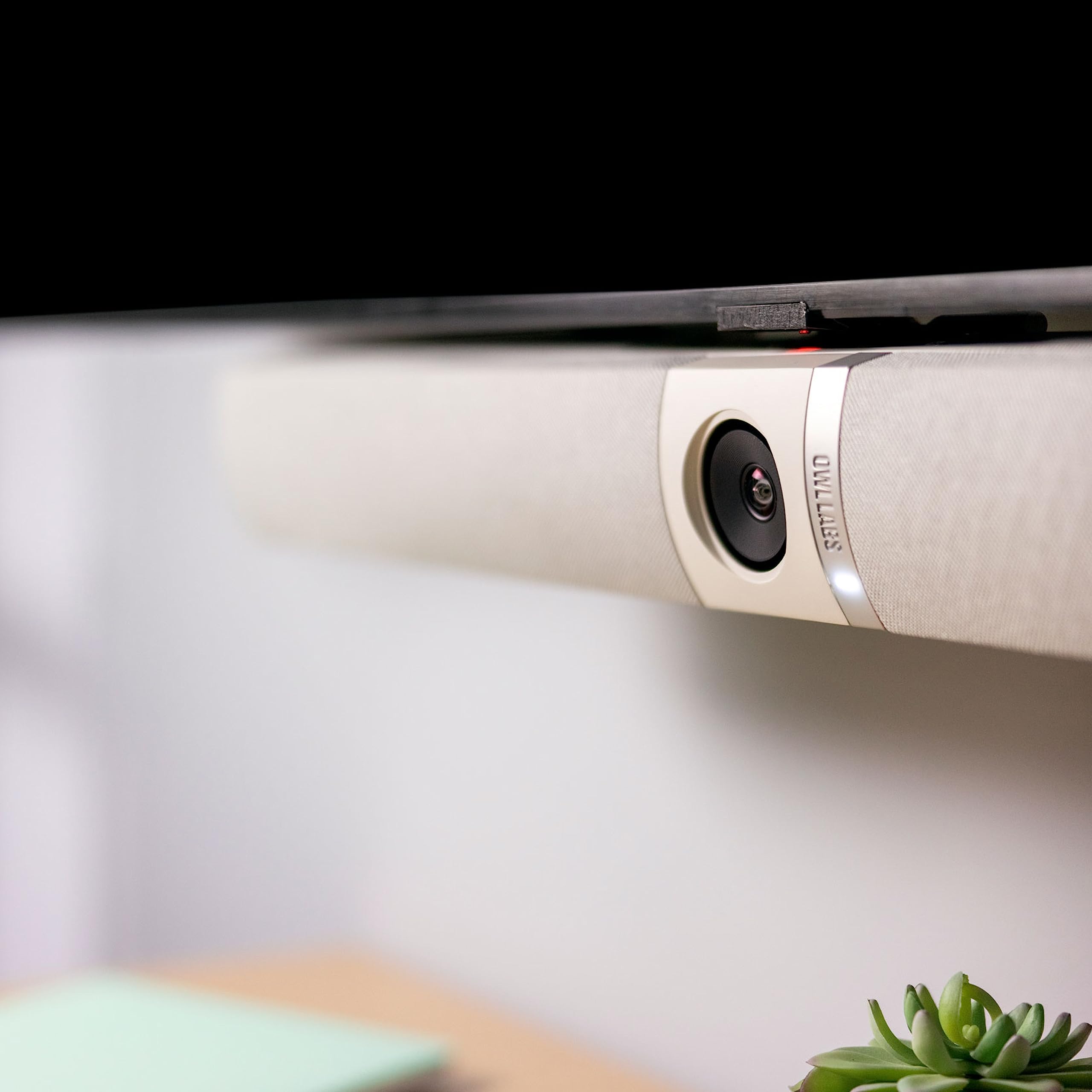 The Owl Bar video conferencing camera provides high quality 4K video with automatic speaker tracking and expanded coverage when paired with a Meeting Owl camera.