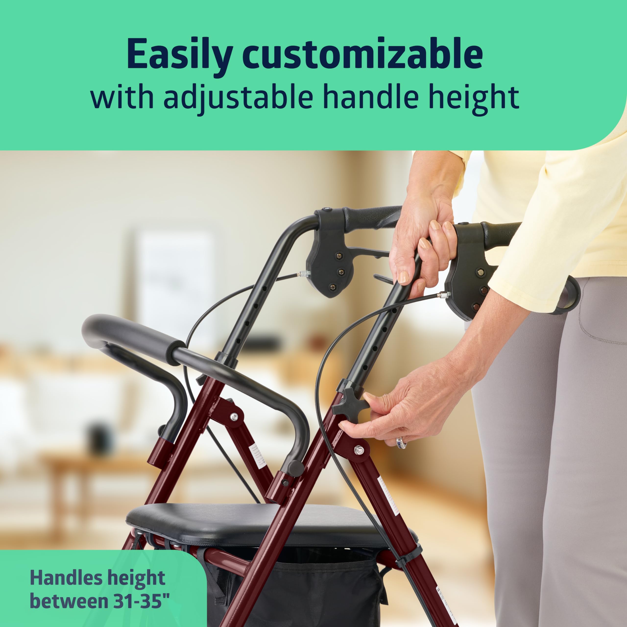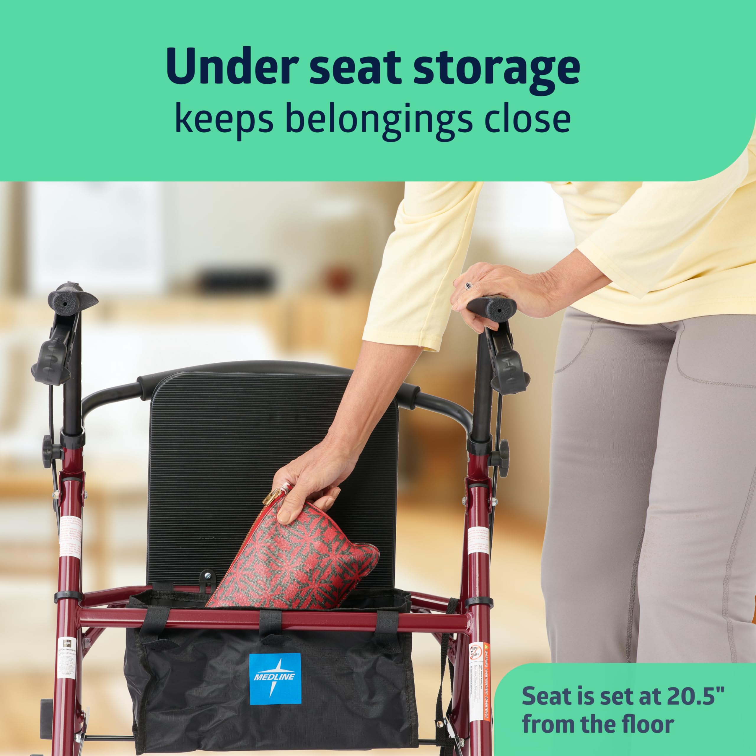 Trusted by healthcare workers and hospitals everywhere, Medline’s lightweight rollator walker is the perfect support for adults and those who have mobility impairments. Available at a great value, this rollator is equipped with 6" wheels to easily move from indoors to outdoors. Features 12x12" black padded seat and backrest. Weighs just 19 lbs., and supports up to 350 lbs. in a burgundy steel frame. Fit with spacious under bag storage, this rollator transports you and your essentials safely and conveniently. To engage brakes, simply squeeze the easy-grip handles. To keep wheels in a safe, locked position, push grip handles to the down position. This prevents the rollator from moving when standing still, sitting down or standing up. Effortlessly adjust the height of the handles (31-35”) to your perfect fit.