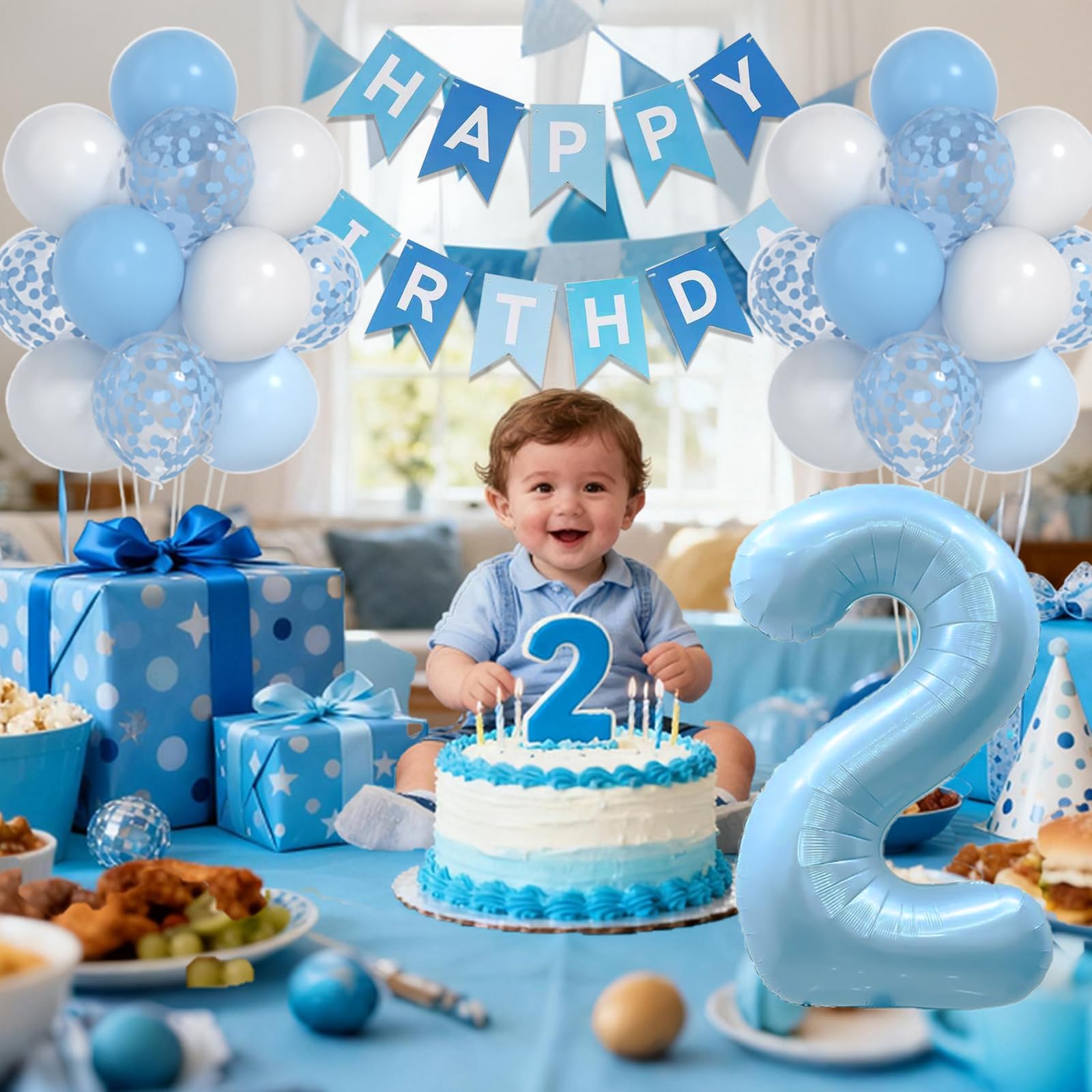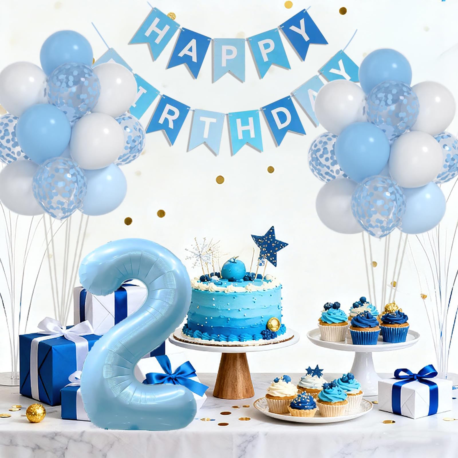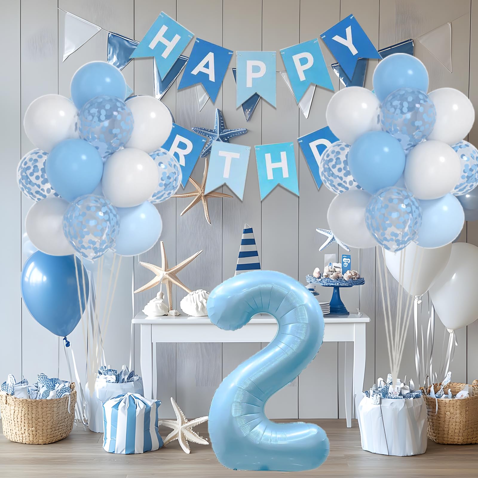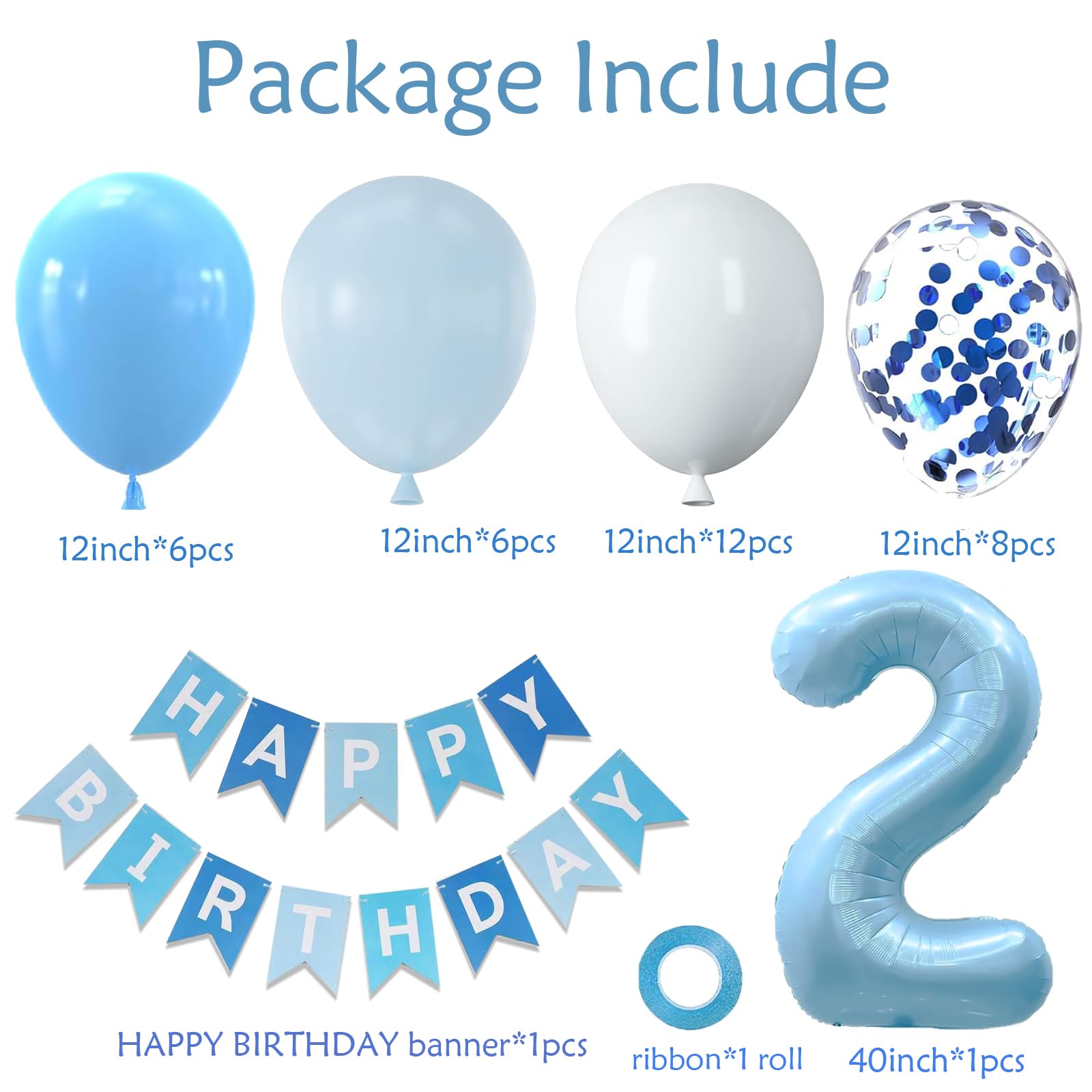 【VALUABLE PACK】40pcs 2nd birthday decorations boy include: 40inch blue 2 balloon,blue white HAPPY BIRTHDAY banner, 12inch balloons(blue) x 6pcs, 12inch balloons(white) x 12pcs, 12inch balloons(blue confetti ) x 8pcs and 1 roll ribbon.