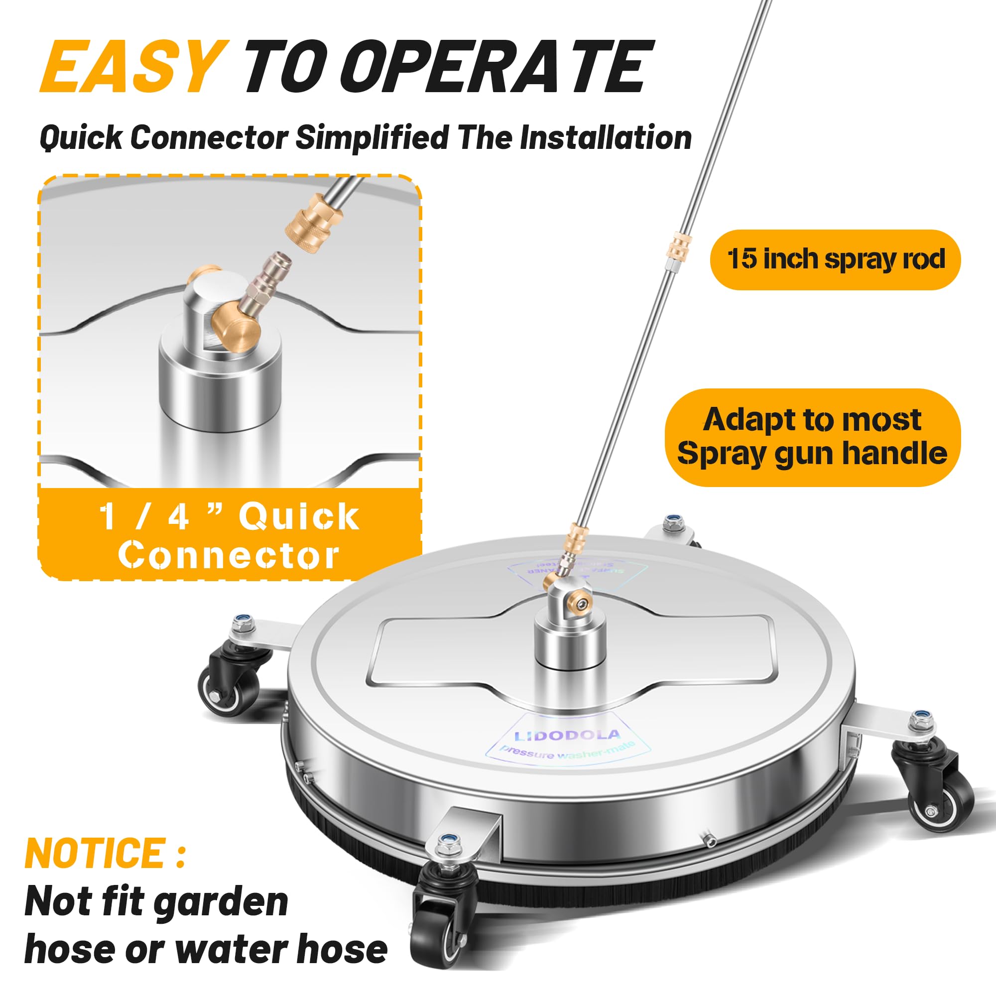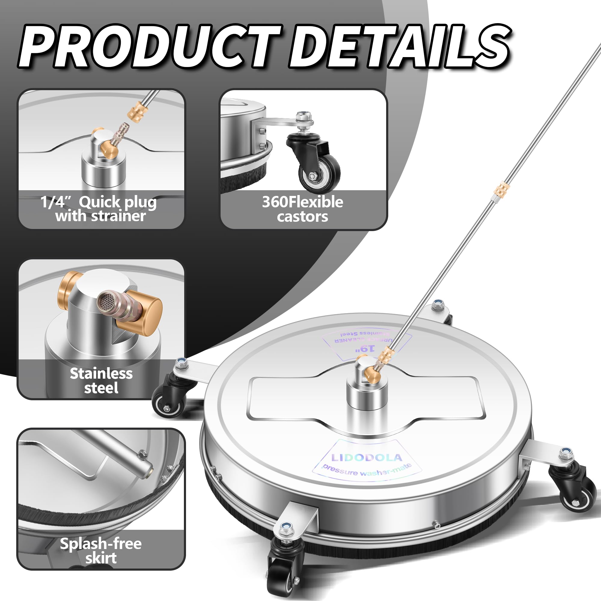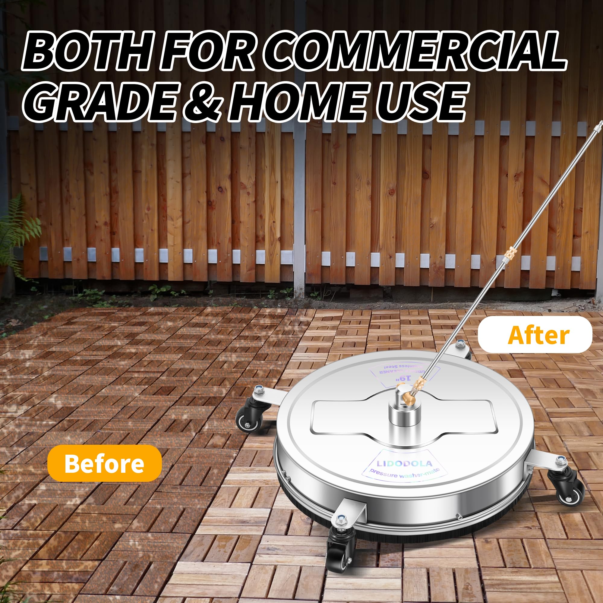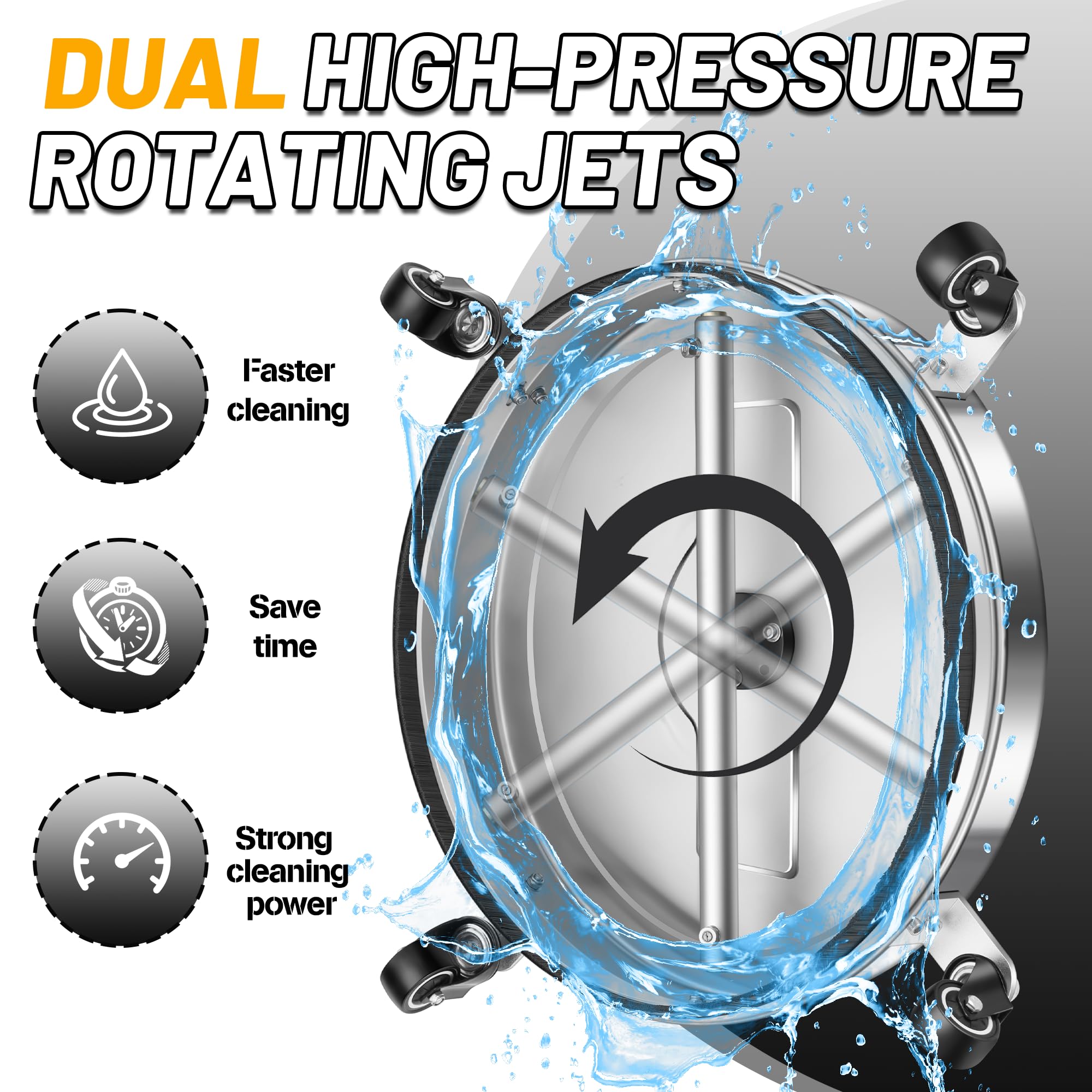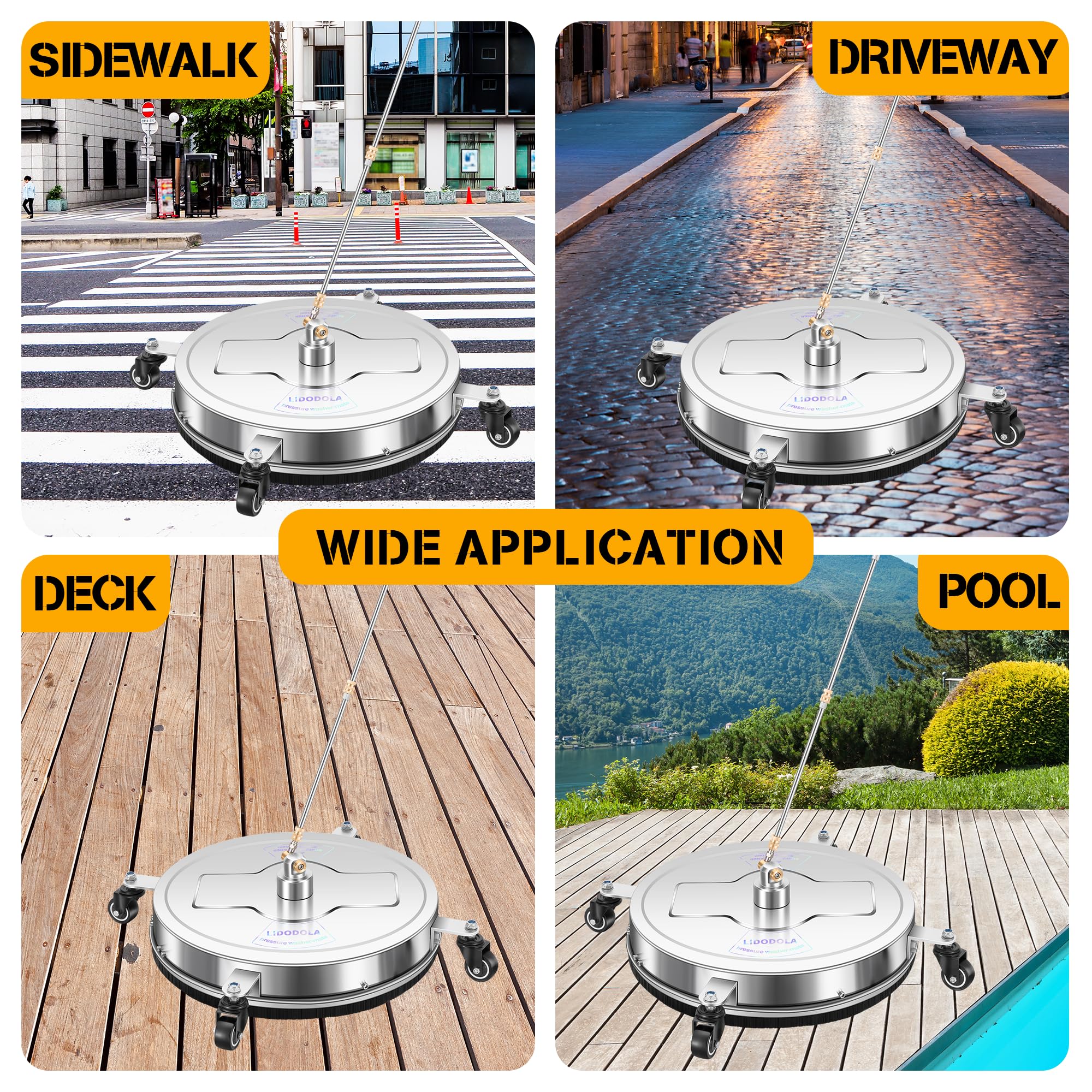 PROFESSIONAL CLEANING – The Lidodola surface cleaner achieves high-performance cleaning across a 19" wide area with dual spinning nozzles, delivering thorough removal of stubborn stains on driveways, decks, sidewalks, and other large surfaces.