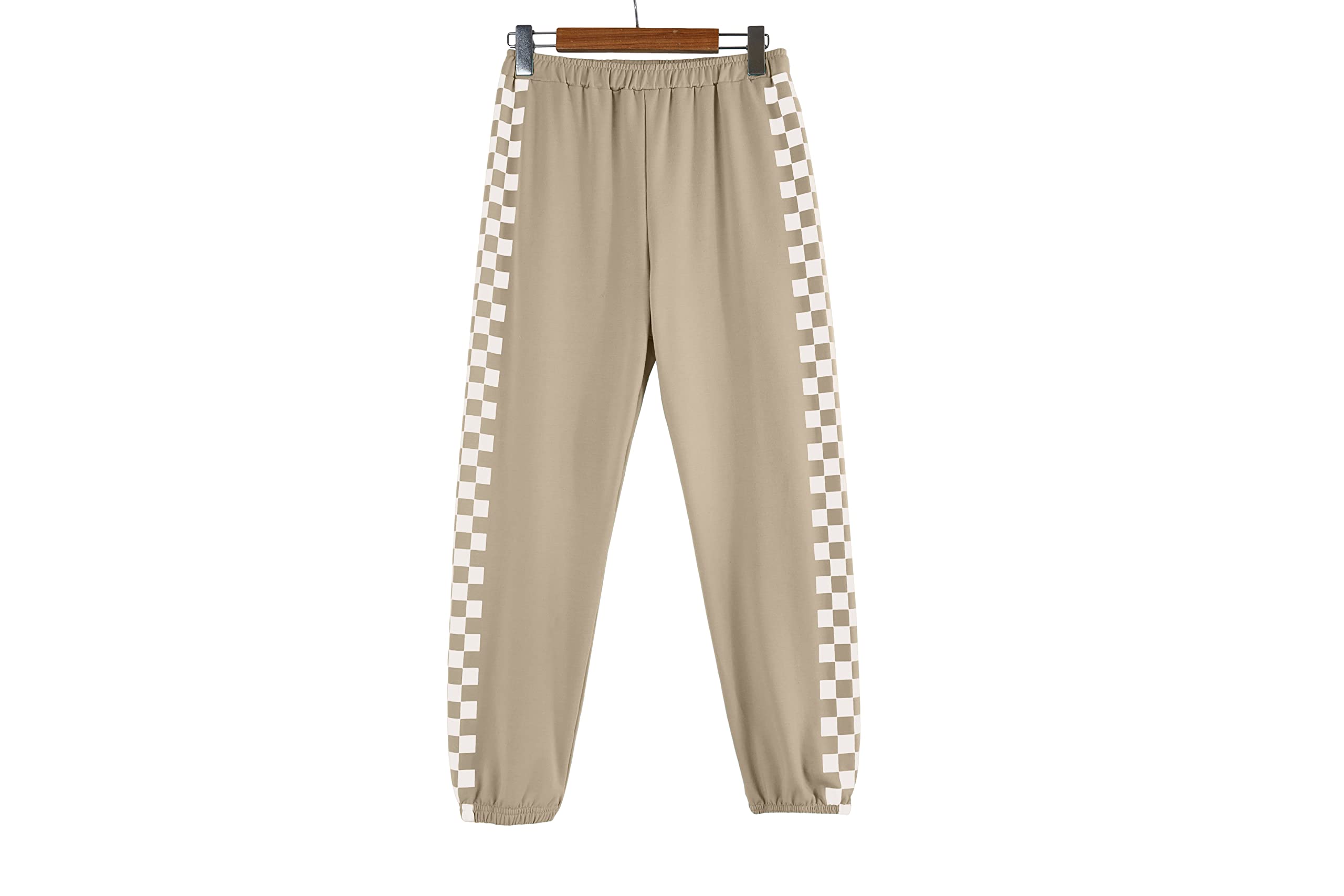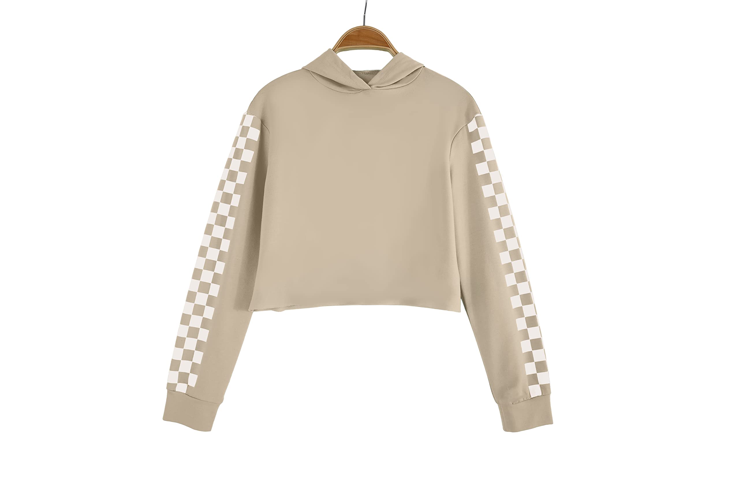 Features: crop top -- casual full sleeve top, check plaid shirt, hooded pullover sweatshirt, fitted; bottom -- high waisted, elastic waistband, baggy joggers, loose-fitting pant sets