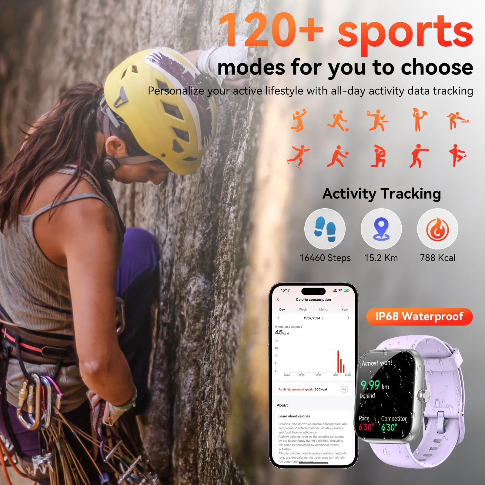 120+ Sports Modes & IP68 Waterproof: Sports watch covers 120+ activities like running, cycling, swimming, and yoga, tracking real-time stats (calories, distance, duration); IP68 waterproof rating withstands submersion up to 1.5 meters for 30 minutes, ideal for swimming, showers, or rain training (Note: High water temperatures affect water resistance)