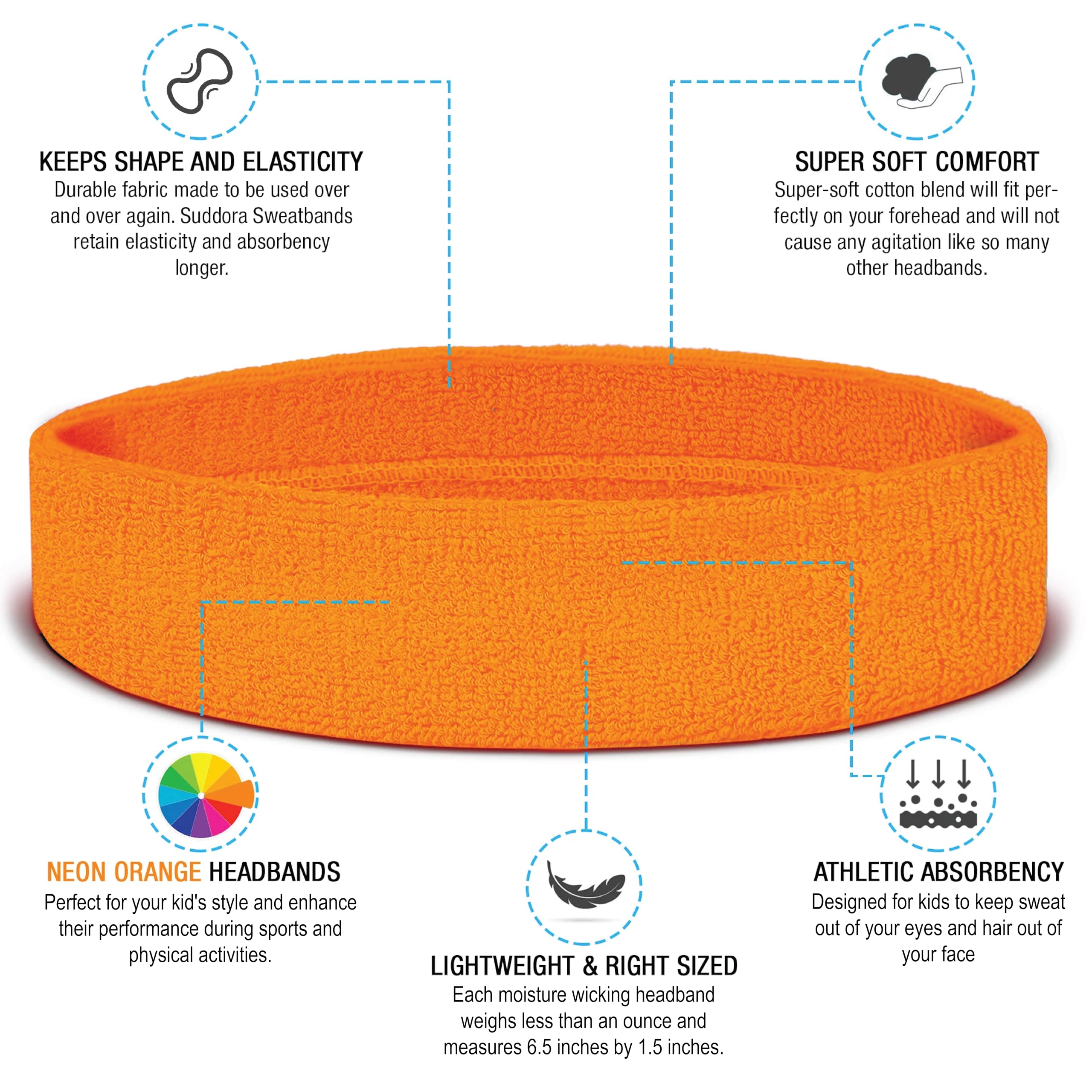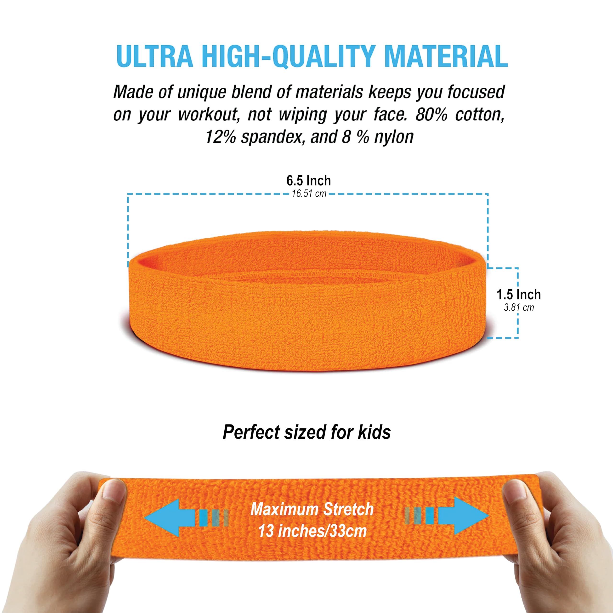 VERSATILE BANDS FOR A VARIETY OF USES: Our kids' headbands effectively keep hair off their faces and hands sweat-free, enabling them to maintain a solid grip on their racket, field hockey stick, bat, or ball. These head and wrist sweatbands are perfect for basketball, baseball, soccer, softball, and more. They also complement costumes and team uniforms splendidly.