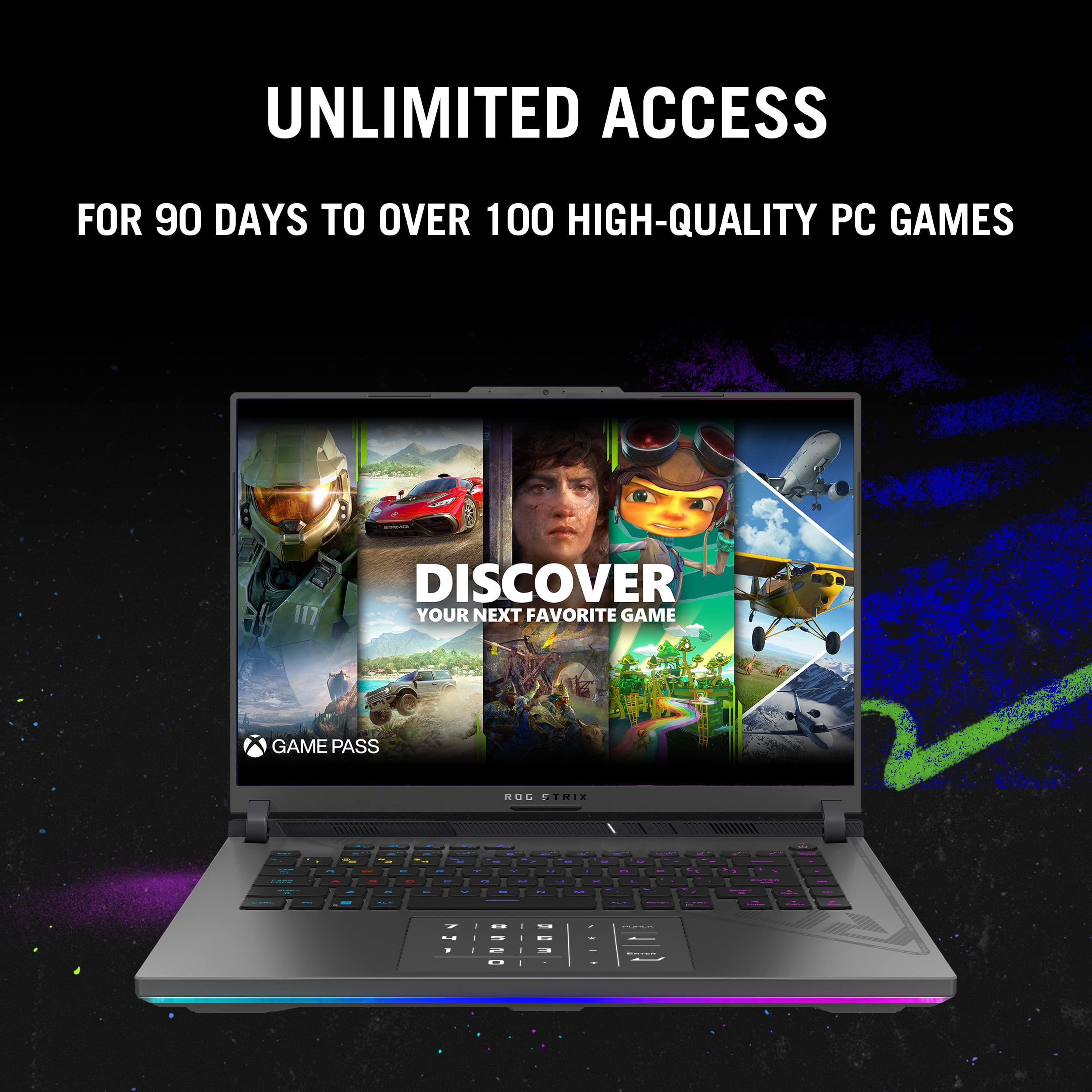 Raise your game and carry your squad with the new ROG Strix G16, a powerful gaming laptop that features Windows 11, a 13th Gen Intel Core processor, and an NVIDIA GeForce RTX 40 Series Laptop GPU. With DDR5-4800MHz memory and PCIe 4x4, this laptop is designed to provide lightning-fast performance and minimize loading times. The ROG Intelligent Cooling system with upgraded liquid metal on the CPU and Tri-Fan Technology, ensures that the laptop can handle the power it can deliver. The ROG Nebula Display guarantees a premium visual experience, and the MUX Switch with Advanced Optimus optimizes both gaming performance and battery life. The laptop's design is inspired by cyberpunk aesthetics and graffiti accents, and features unique elements such as a dot matrix design on the lid and cross-hatched vents.