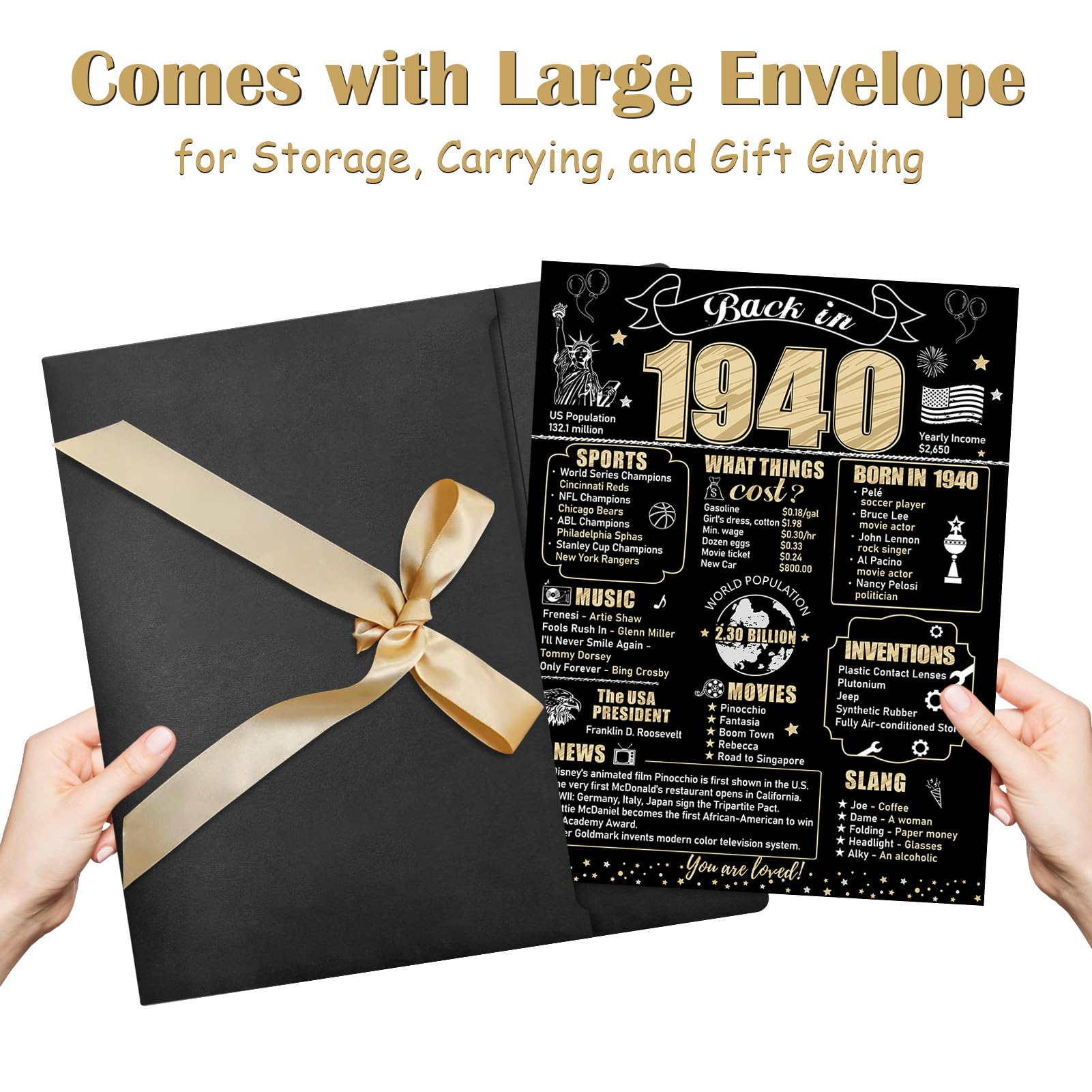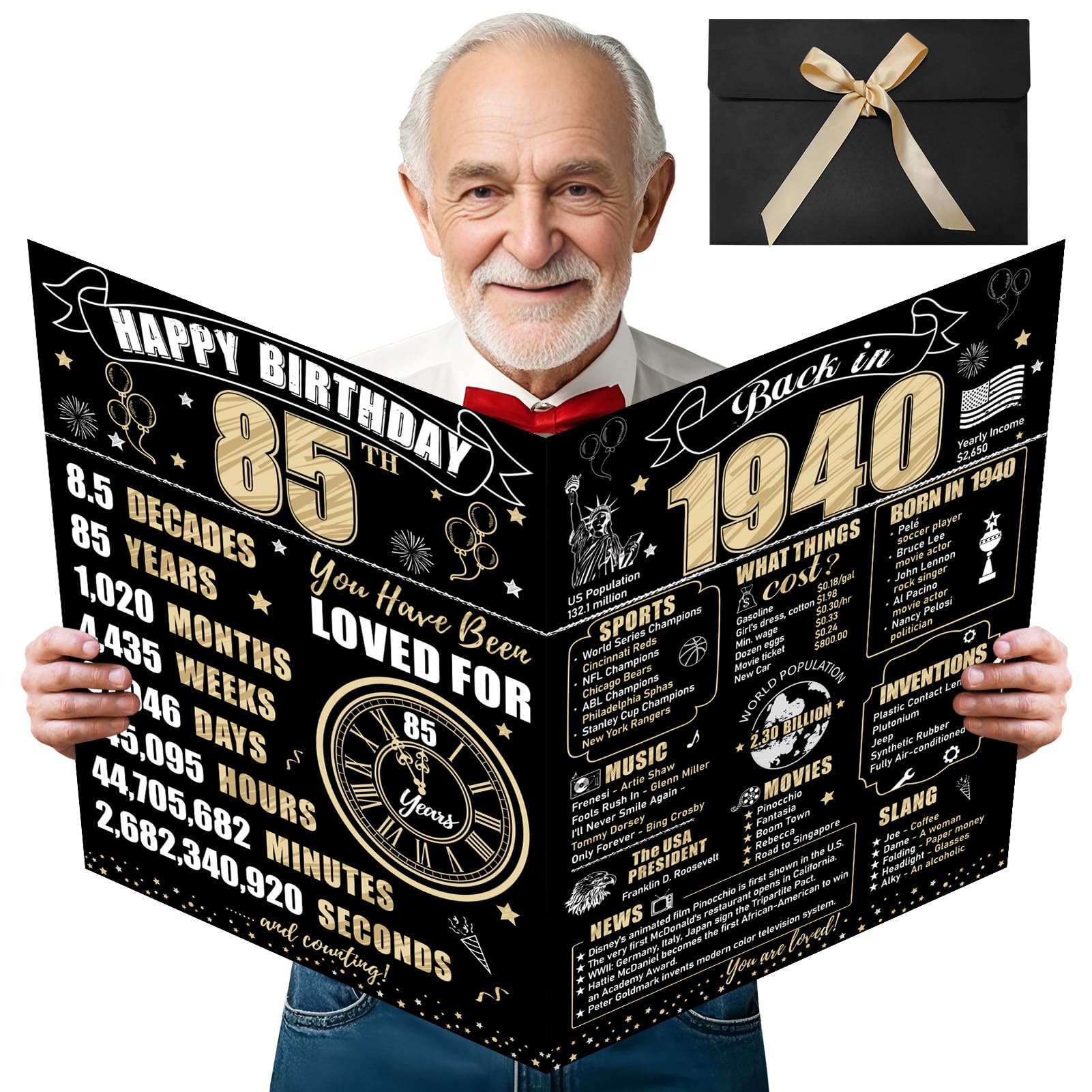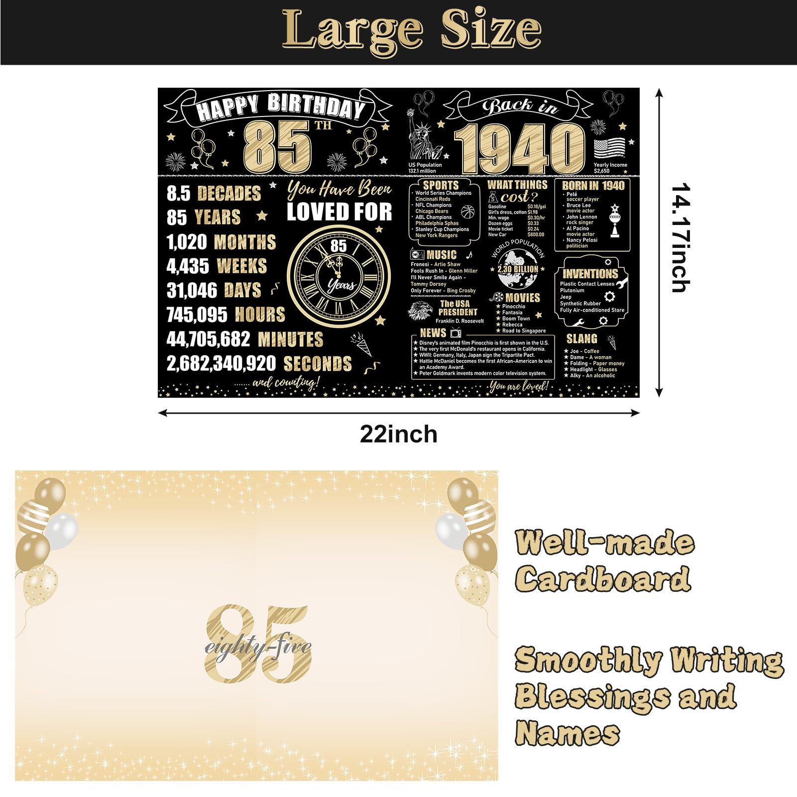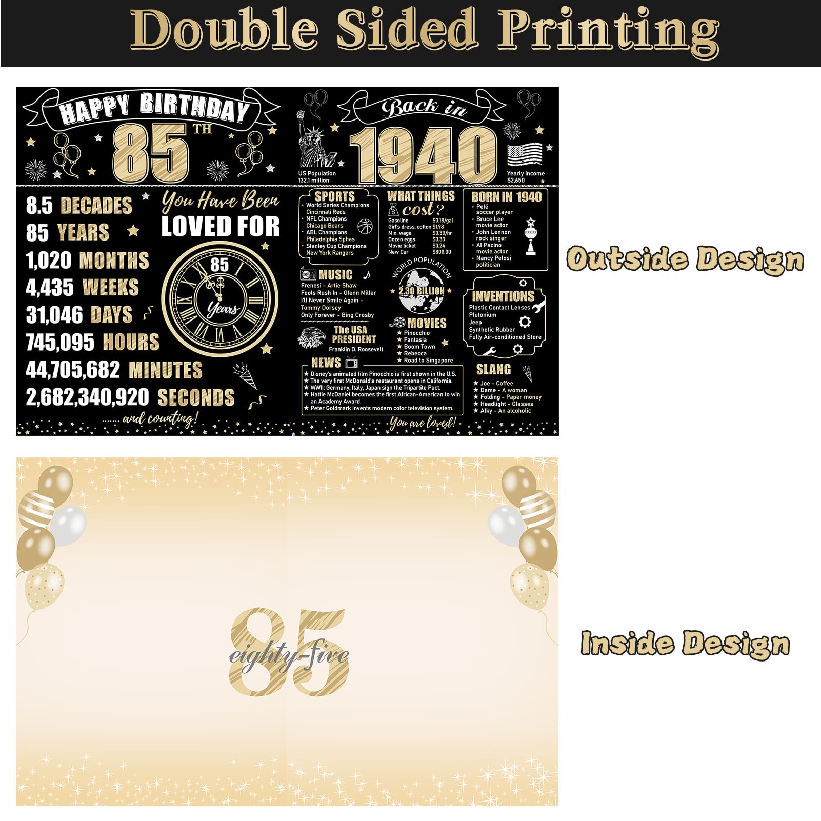 【Vintage 1940 85th birthday themed design】The double-sided design incorporates black and gold tones, featuring birthday elements like balloons and fireworks, commemorating significant events from 1940. It is both interesting and meaningful