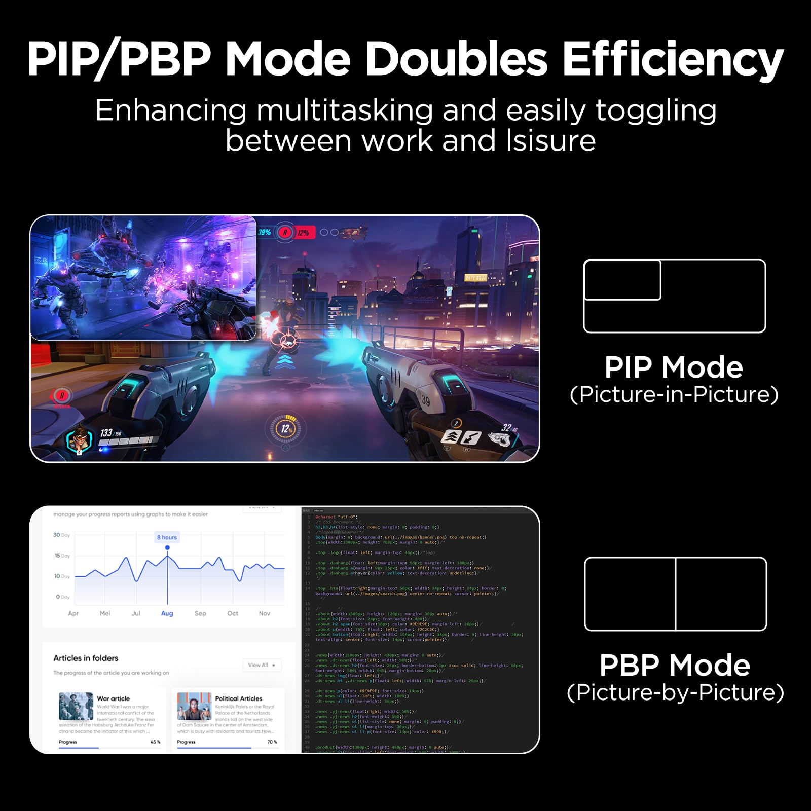 PIP PBP AND BLACK EQUALIZER: KOORUI 34e6uc have picture-in-picture and picture-by-picture modes, and black equalizer function which can enhanced visibility in dark scenes.It's the perfect tool for work and a must-have for gaming.