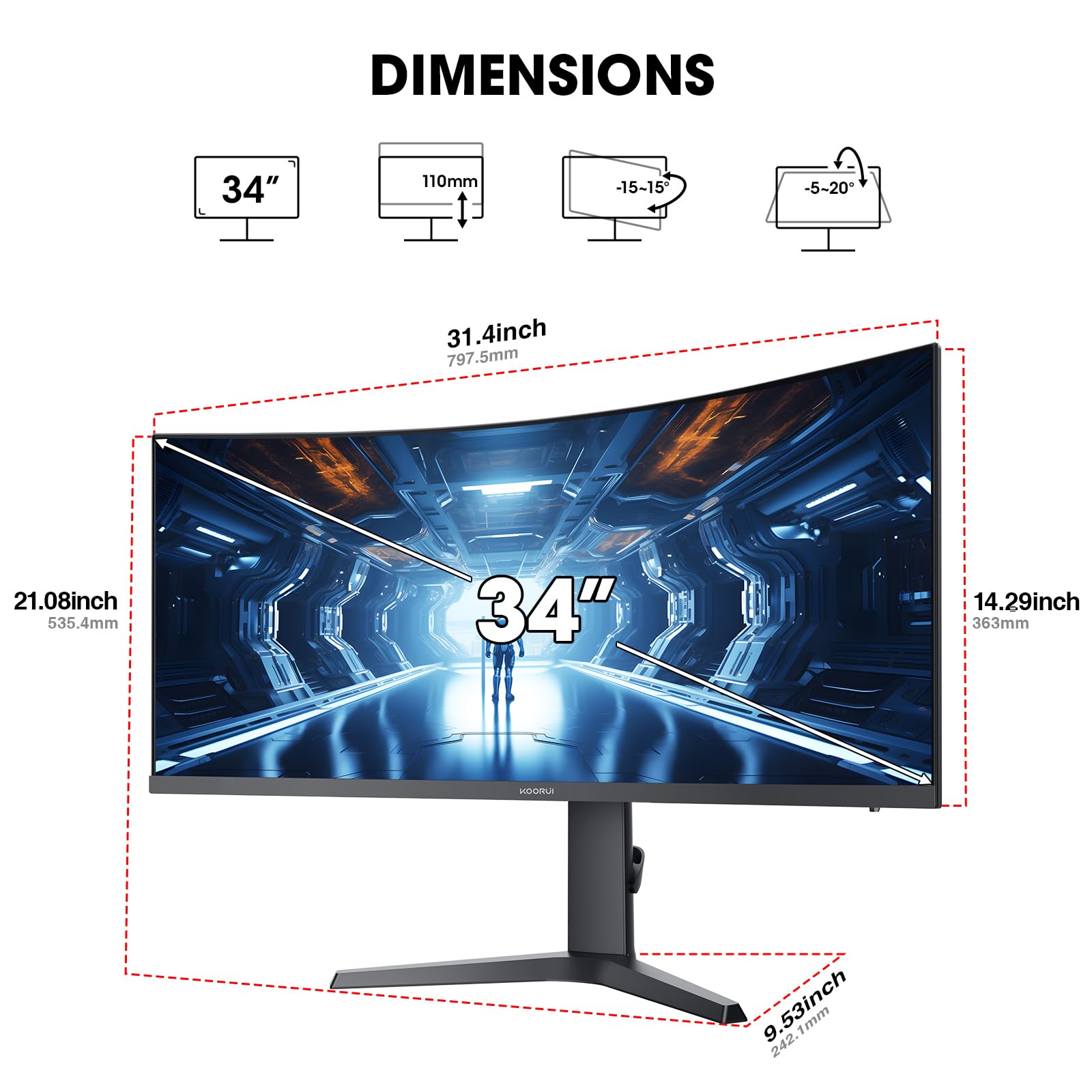 EAGLE WING DESIGN: The design of the 34 inch computer gaming monitor is inspired by an eagle spreading its wings. The ergonomically shaped stand enables the 180Hz Gaming Monitor to be tilted for -5~20°, swivel for -15~15°and height adjustment up to 110mm. The curved monitor 34 inch is VESA compatible 75x75mm and allows you to save more space in your environment.