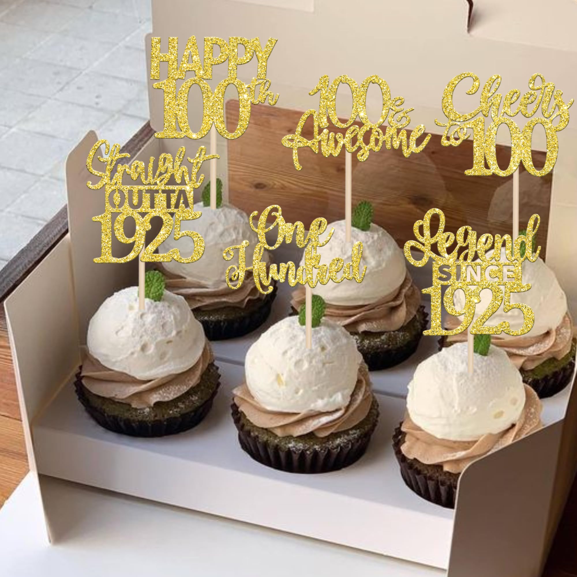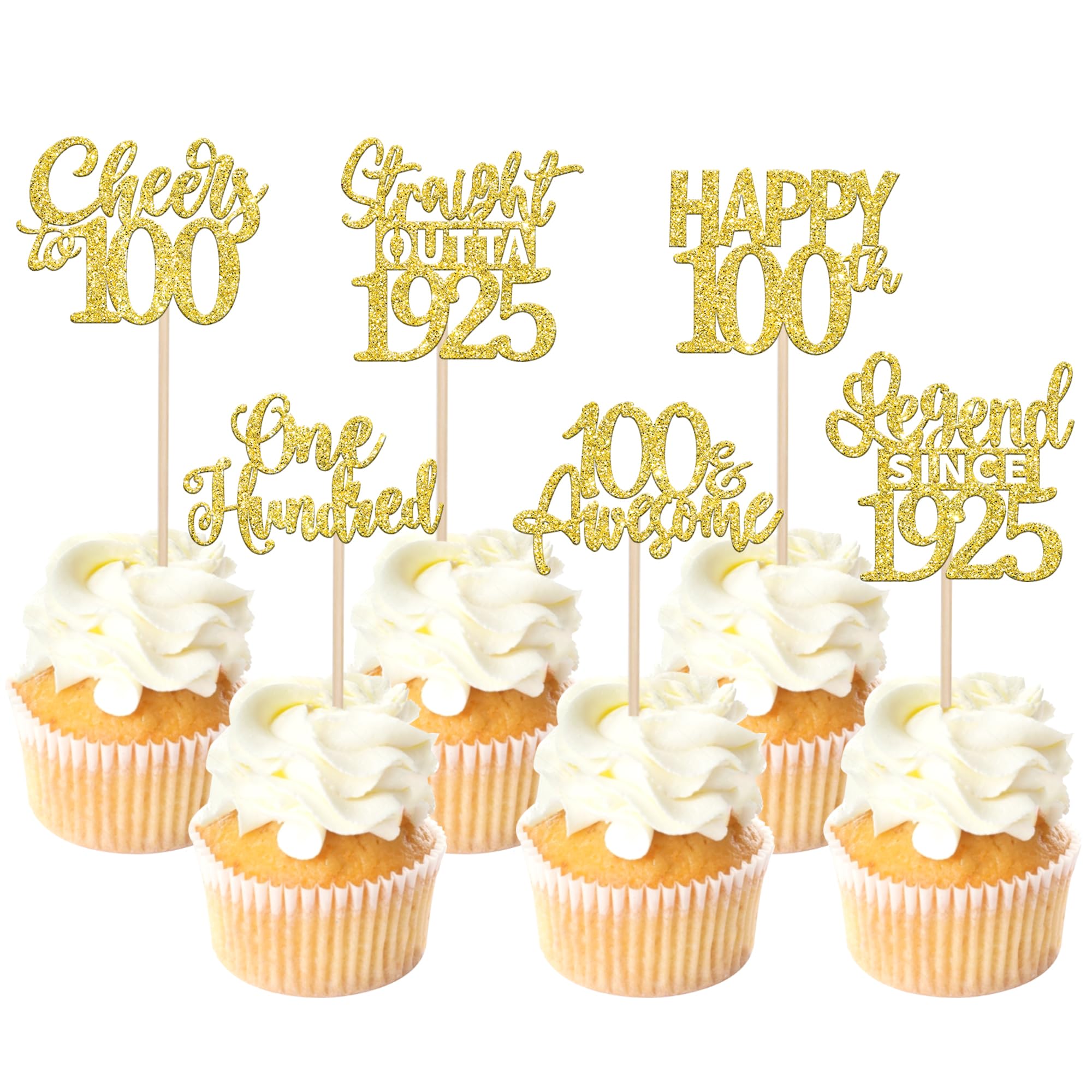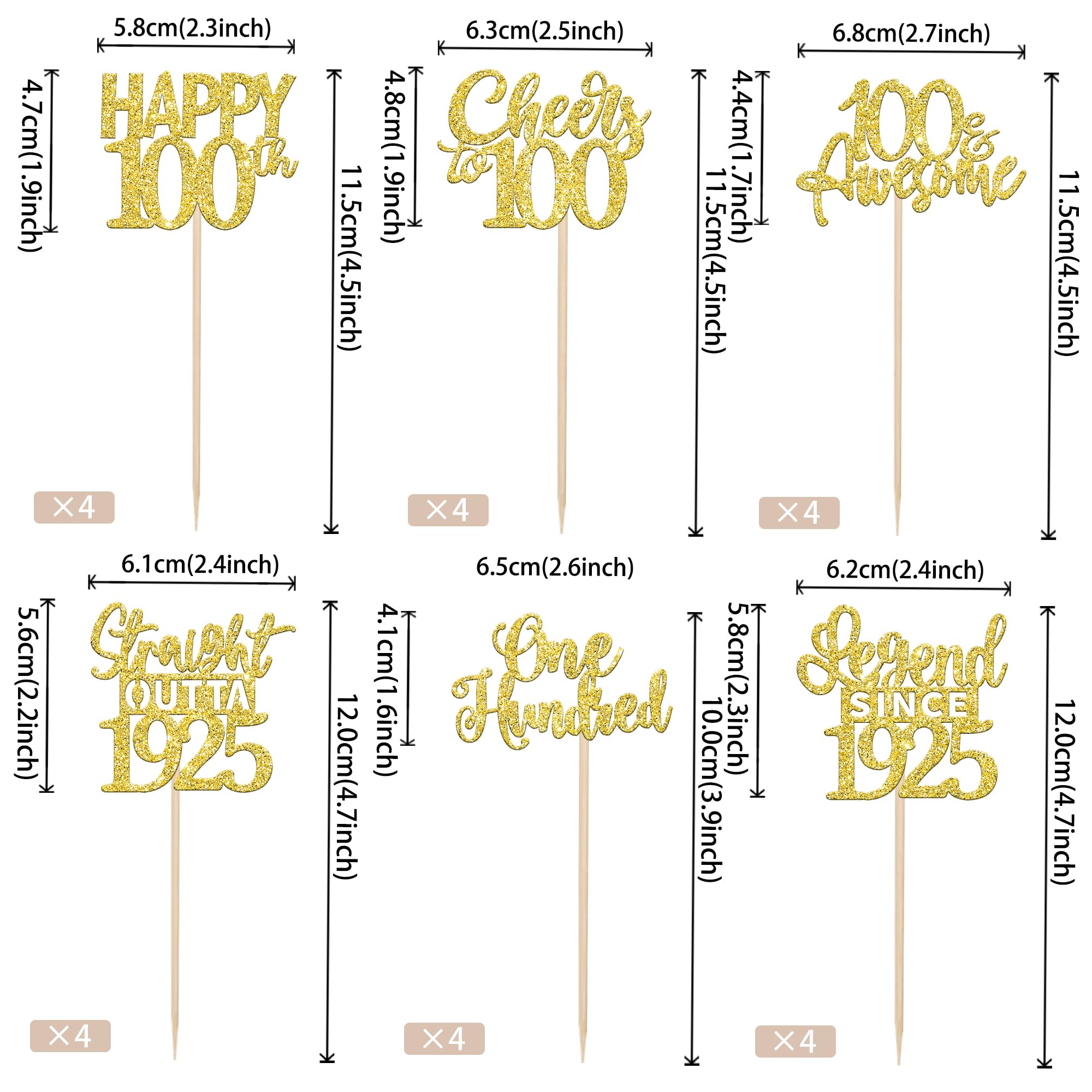 24PCS Happy 100th Birthday Cupcake Toppers One Hundred Straight Outta 1925 Cupcake Picks Cheers to 100 Birthday Decorations Lengend Since 1925 Cupcake Decorations for 100th Birthday Anniversary Party Cake Decorations Supplies Perfect for legend since 1925 theme party, 100th anniversary theme party,cheers to 100 years theme party, 100 awesome theme party cupcake decorations supplies. Pack of 24 pcs,4 pcs of each design. The size is 2.3*4.5/ 2.5*4.5/ 2.7*4.5/ 2.4*4.7/ 2.6*3.9/ 2.4*4.7 inch ( with stick ) Made of high quality paper card stock,thick and sturdy. These straight outta 1925 cupcake toppers are one side glitter, another side is white, and they are intended for decoration only, please do not put them in oven or microwave. If the item you received has any defects, please contact us immediately.we will deal with it within 24 hours.