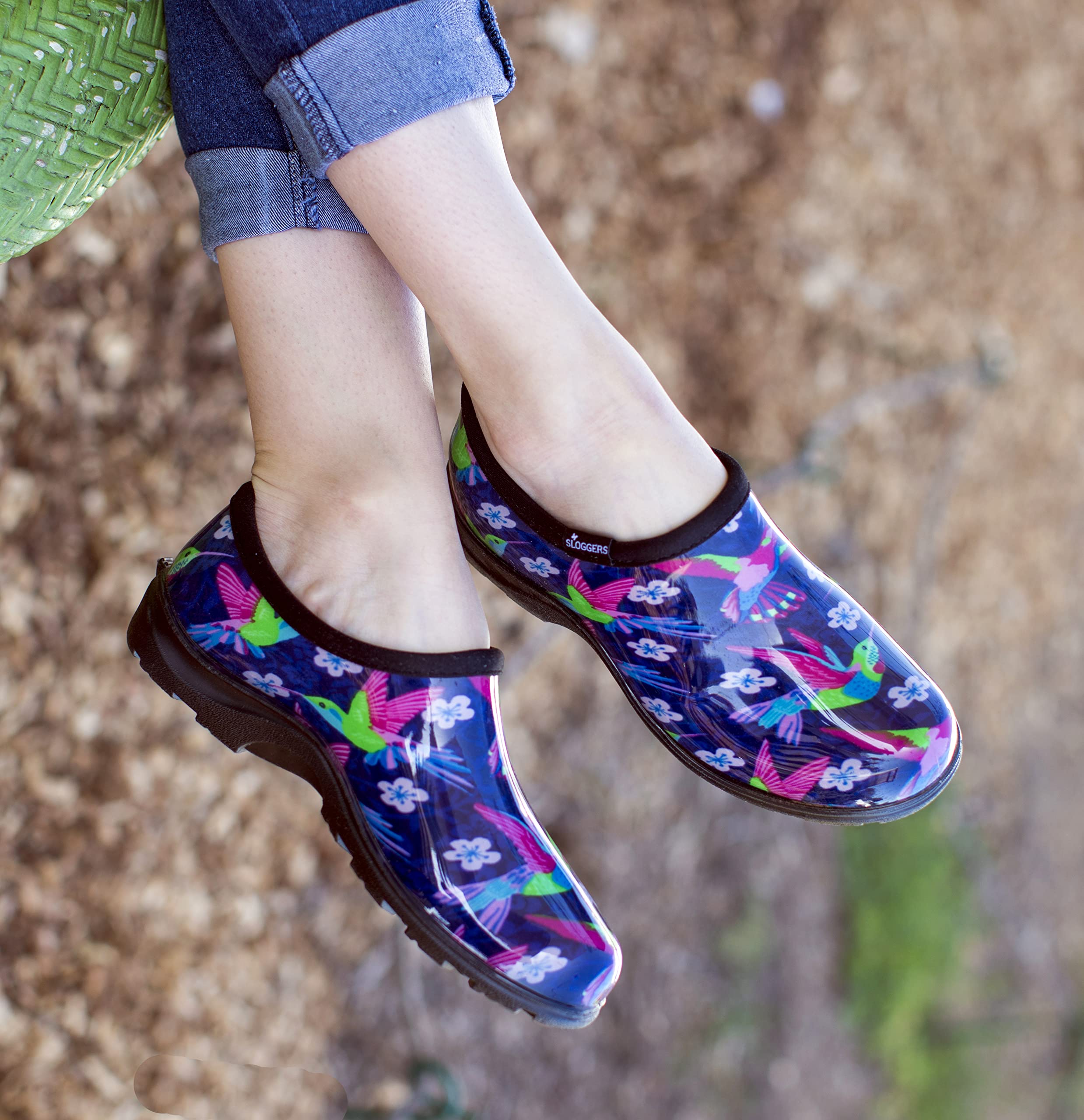 Description Product Description Designed with a honeycomb heel section that not only reduces weight, but also adds a spring to your step. Sloggers clogs, shoes, ankle boots and rain boots come with “All-Day Comfort” premium insoles to keep your feet supported all day. Sloggers signature deep lug tread provides the same stability and support as a real work boot. Made with 90% recycled material. Sloggers are easy to care for and clean. Hose them off or wash off in the sink. Remove insole to airdry. Amazon.com Cultivate all the enjoyment you can from your garden in the Midsummer garden shoe from Sloggers. Brilliant floral design meets mud- and puddle-proof construction so you can get out there after a refreshing spring shower and stay decidedly un-soggy. A low-cut ankle offers range of motion for easier kneeling and squatting as you work the soil. From the Manufacturer Women's Garden Shoe Midsummer, 6, (Black), Ea.