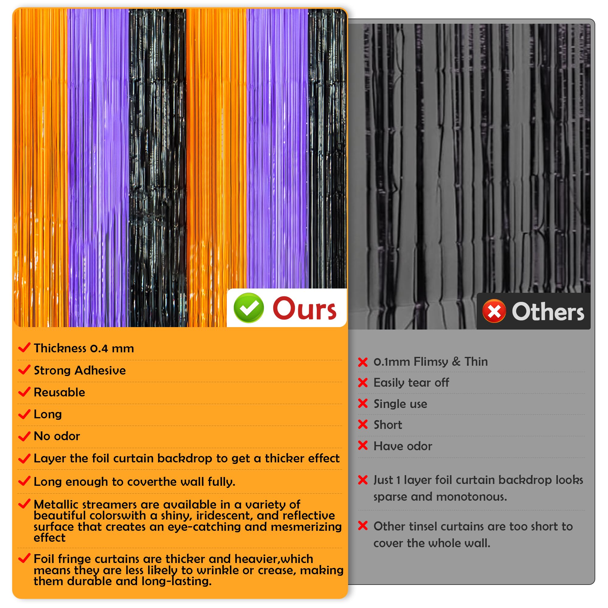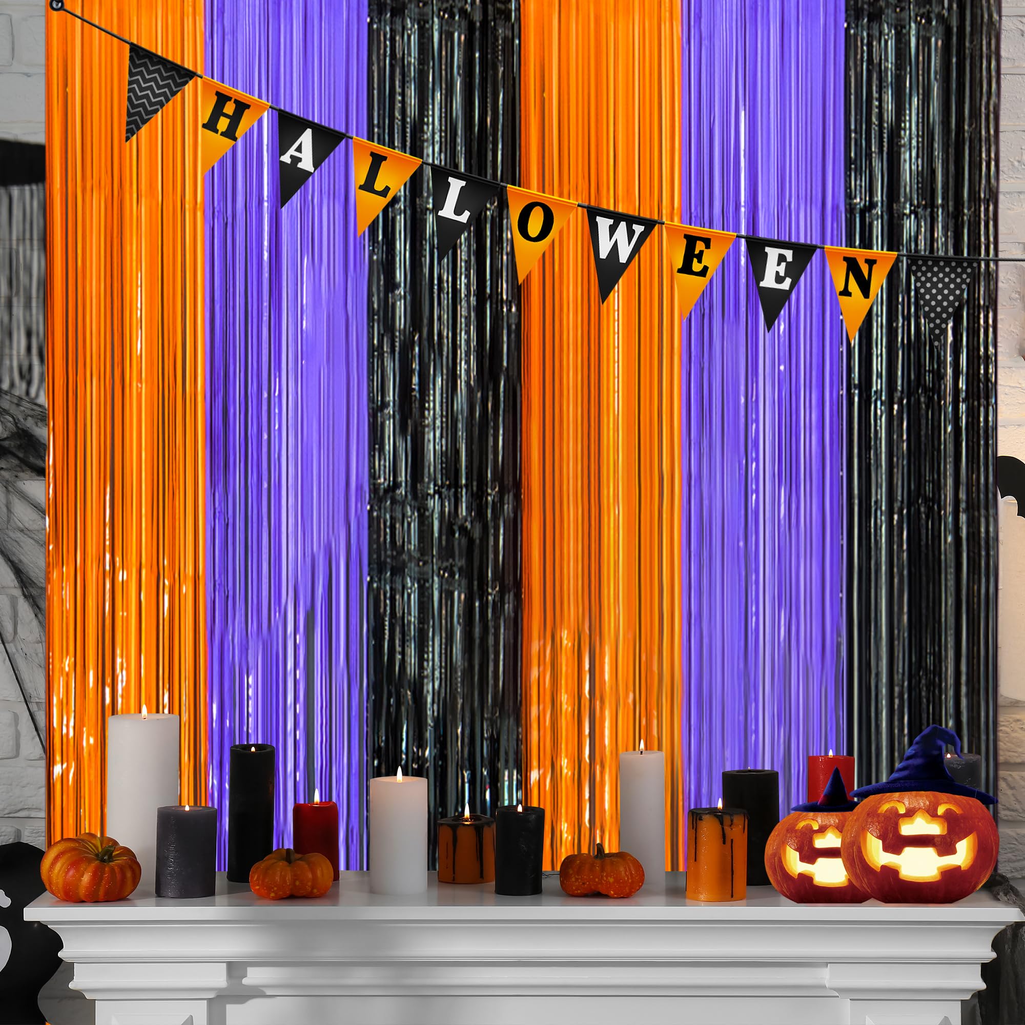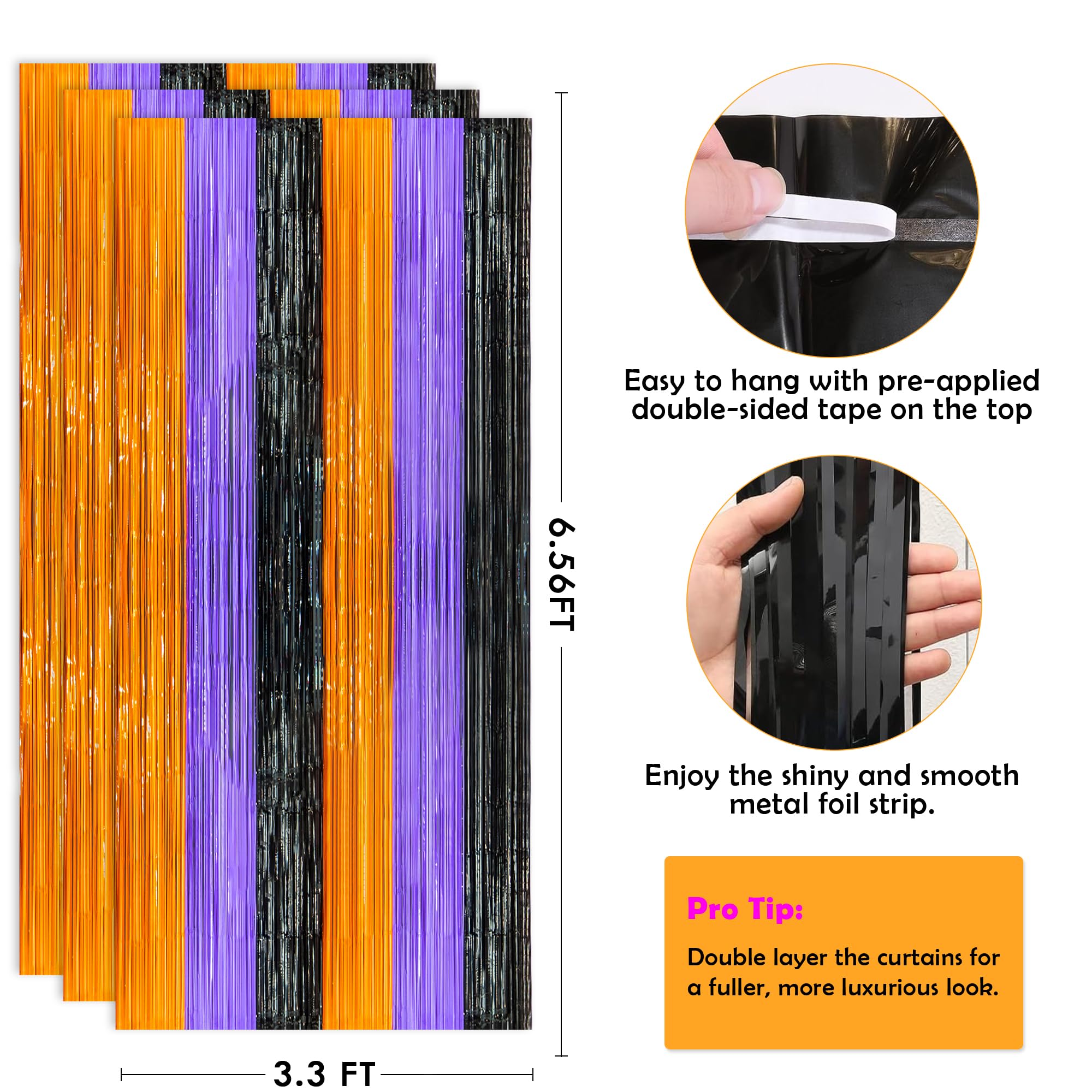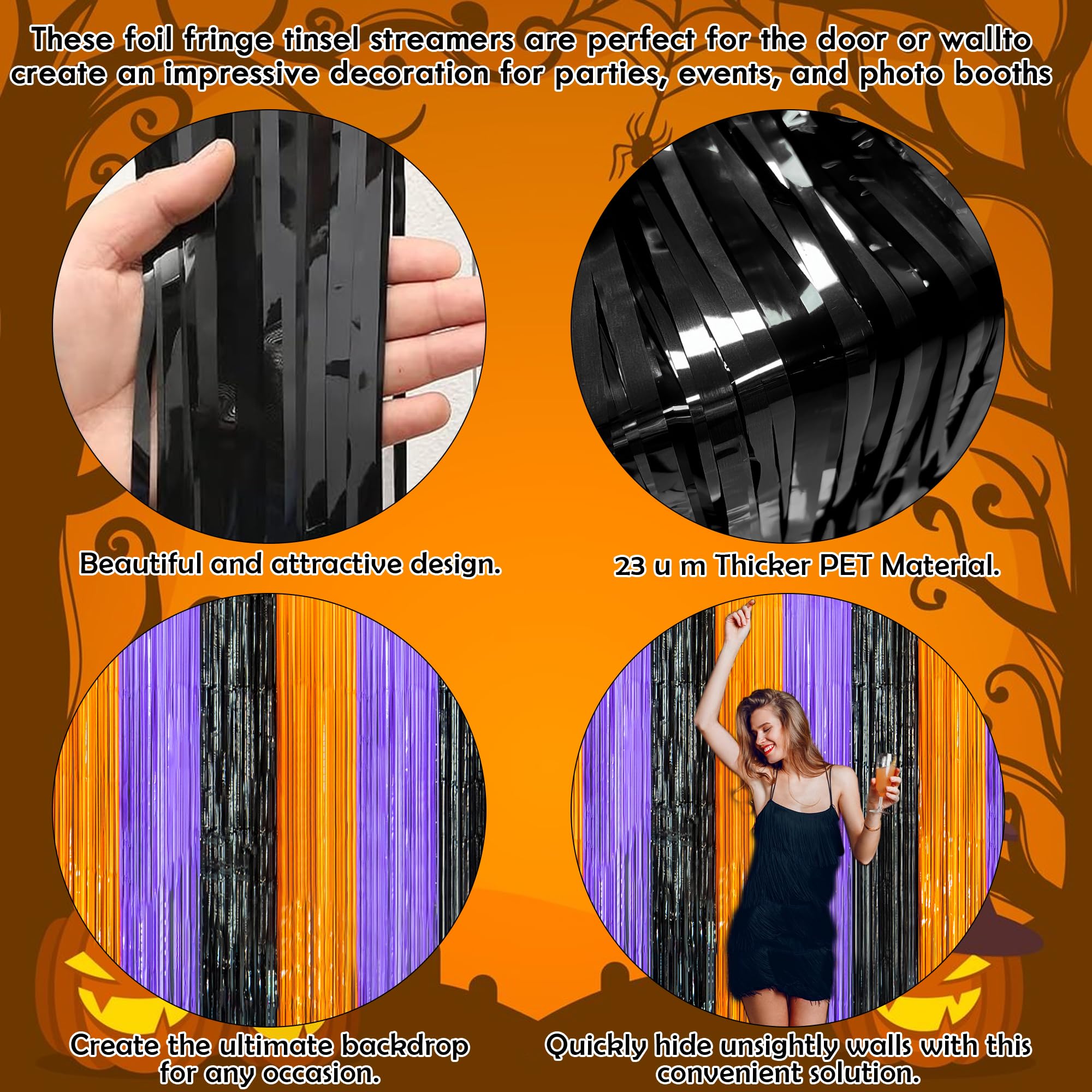 [Create an Unforgettable Halloween];Use these shiny halloween streamers backdrops to make your halloween party truly memorable. Hang them as a halloween backdrop or use them as an eye - catching entrance. Pair them with LED lights, balloons, and other halloween favors to enhance the spooky festive mood. Your guests will love the halloween atmosphere and cherish the memories of your amazing halloween event, whether it's for photoshoot with halloween backdrops for photoshoot or just to set the scene.