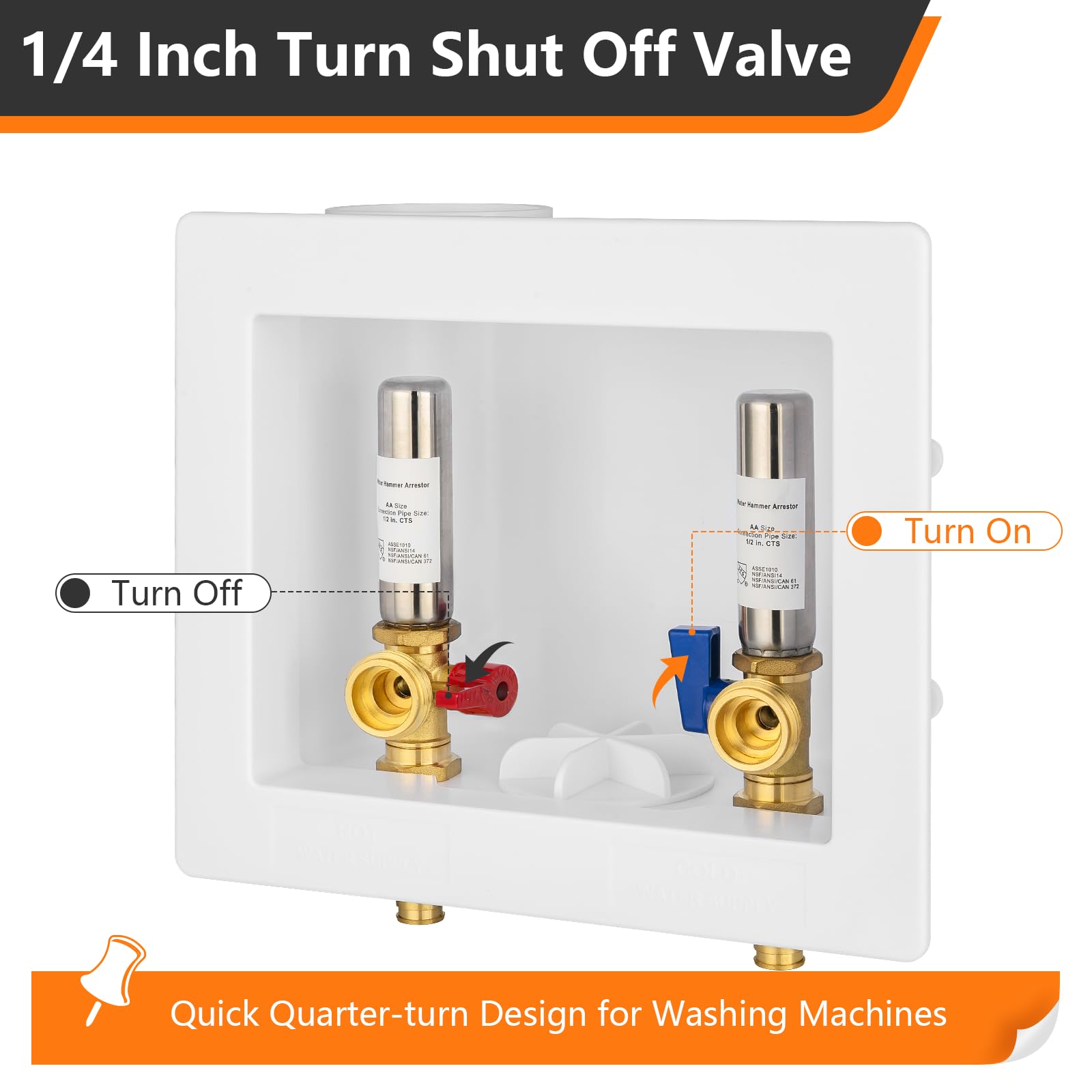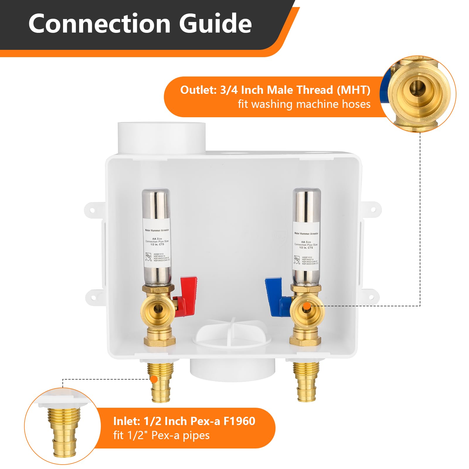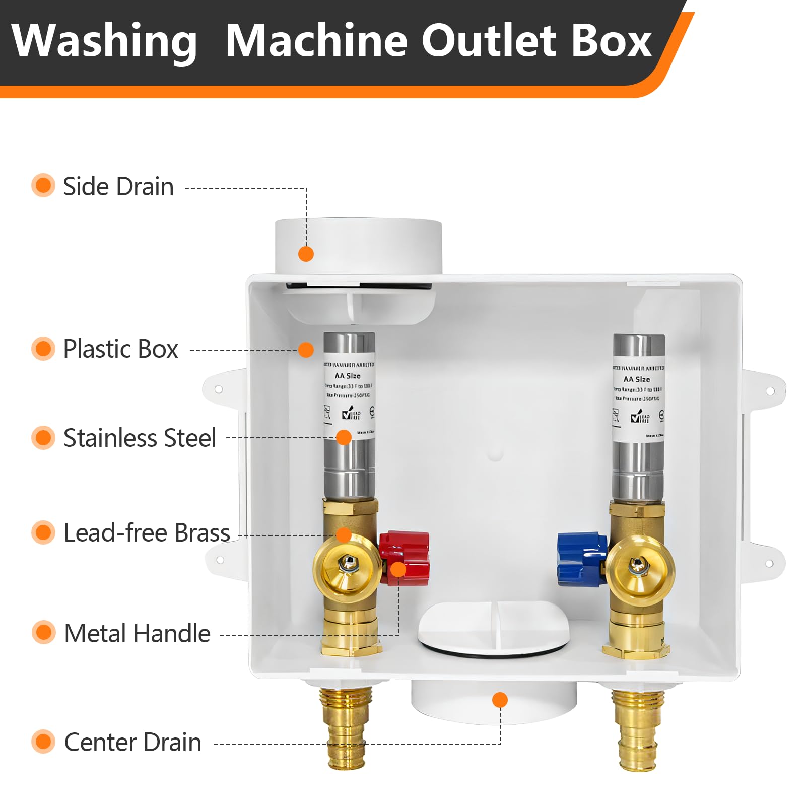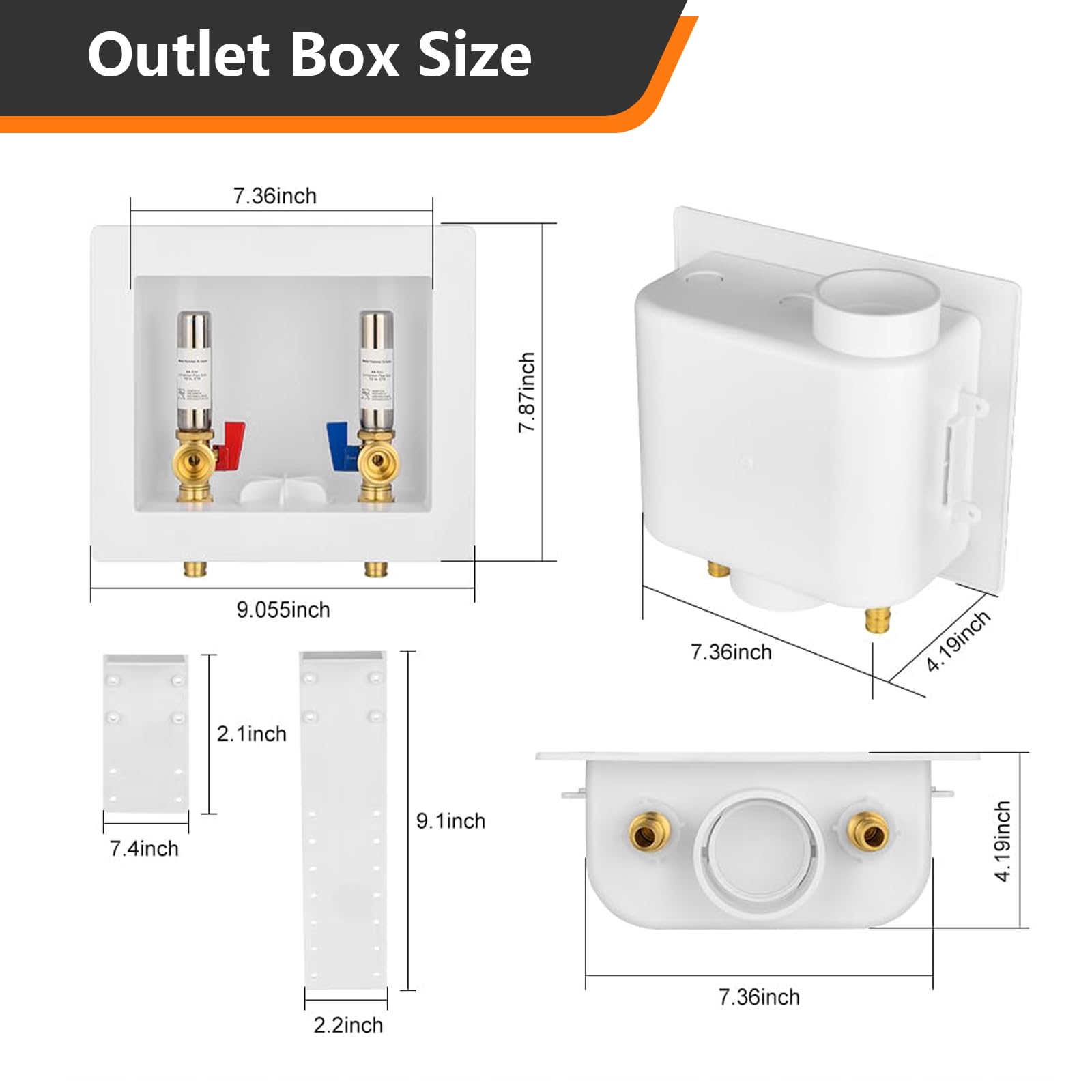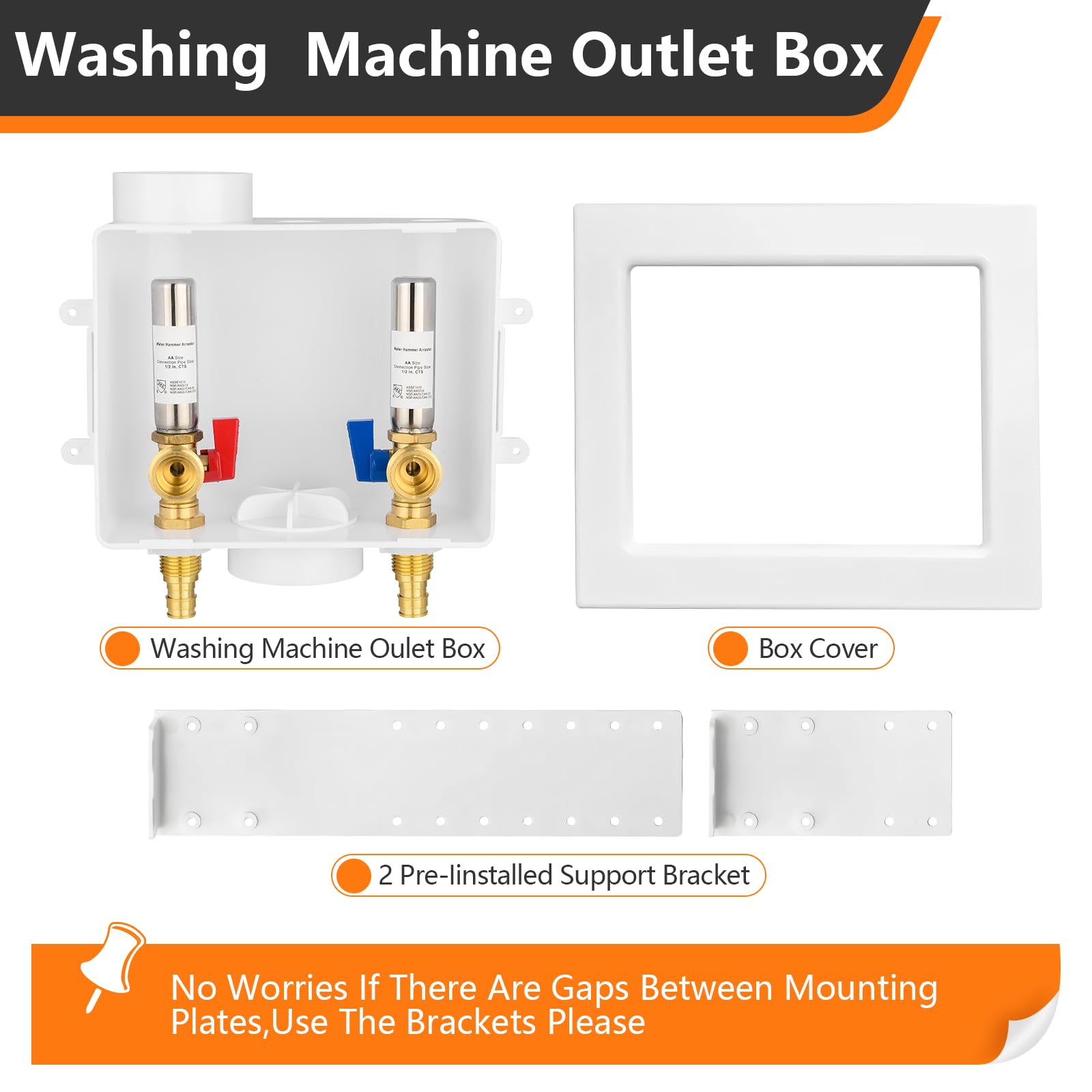 PACKAGE INCLUDE:1.washing machine outlet box,Equipped with a stainless steel water hammer arrestor. 2.pre-installed support brackets 3.protective box cover.