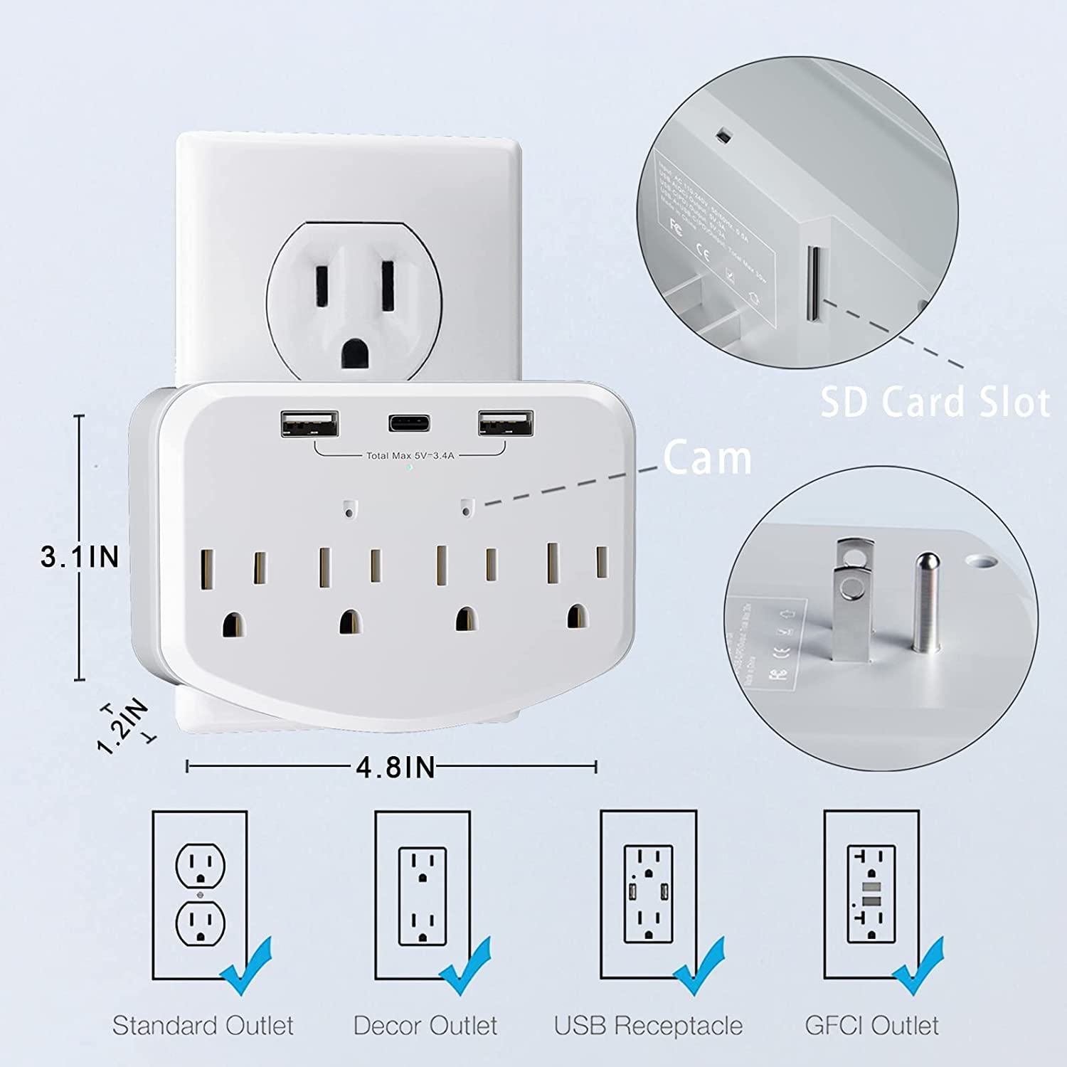 Update 4-in-1 function camera : The camera fits perfectly into the socket. 4 AC socket extenders (120V, 15A, 1200W), 3 USB PD fast charging ports (3.4A, 20W), 1700 Joule surge protectors and a mini camera, surface material flame retardant, heat resistant up to 248°F, can be used as sockets. (Do not use on high-power appliances, such as electric kettle)