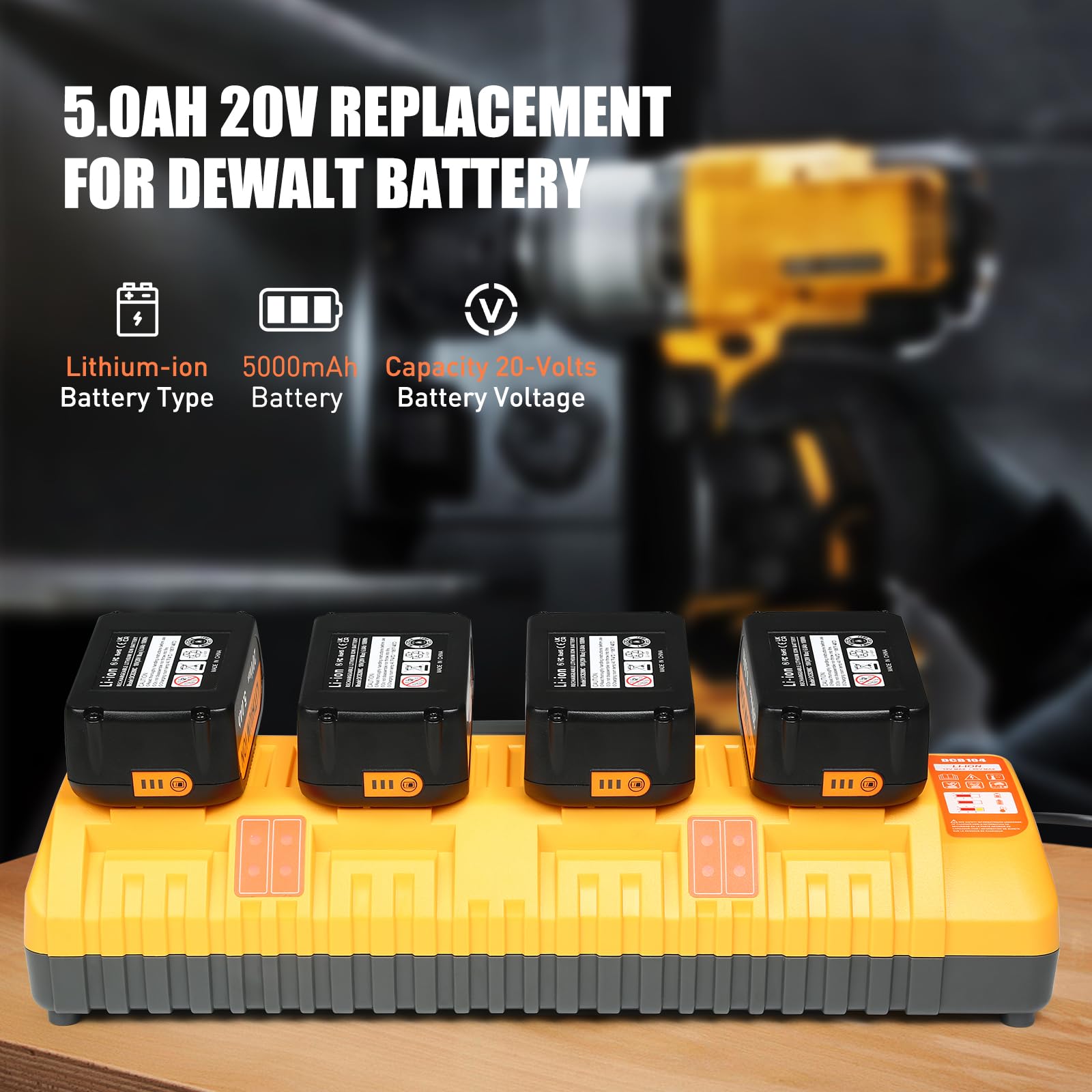 【Perfect Value Set】4x5000mAh 20V battery replacement and 1 x battery charger replacement. High efficiency charger for Dewalt DCB104 charger. High-capacity battery Replacement for dewalt 20v battery DCB200 DCB201 DCB203 DCB204 DCB206 DCB207 etc.