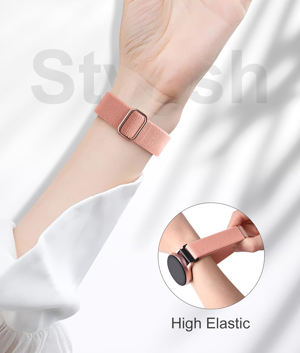 【Security & Easy to install】 Lerobo 20mm quick release watch bands with pins on both ends lock precisely and securely on the smart watch interface. And the elastic material band will let you feel like a scrunchie on wrist, comfortable to put on and easy to take off without any tool.