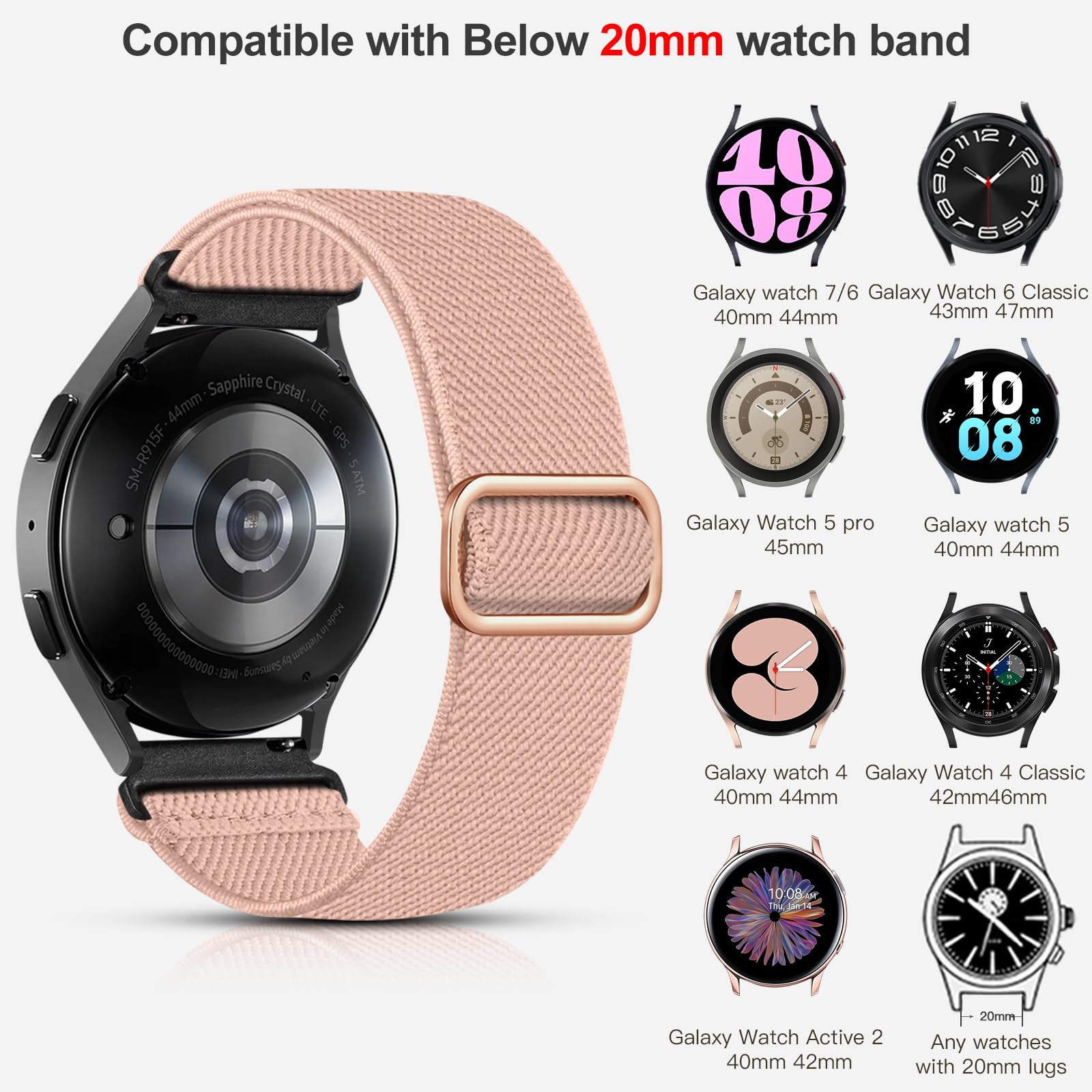 Description Lerobo Beaded Bracelet Compatible with Samsung Galaxy Watch Band 7/6/5/4 40mm 44mm Active 2 40mm 42mm/Watch 4 40mm 44mm 4 Classic 42mm 46mm Watch 5 Pro 45mm Band Women Girl, 20mm Watch Band Fashionable Elastic Watch Replacement Band Compatible Models: Compatible with Samsung Galaxy Watch 7/6/5/4 40mm 44mm Band Compatible with Samsung Galaxy Watch 6 Classic 43mm 47mm Band Compatible with Samsung Galaxy Watch 4 Classic 42mm 46mm Band Compatible with Samsung Galaxy Watch 5 pro 45mm Band Compatible with Samsung Galaxy Watch Active 2 40mm 42mm Band Compatible with Any watches with 20mm lugs Please cheack it carefully before order. Why Do You Choose Lerobo Watch 6 bands for galaxy? 1.The unique and fashionable design makes your watch for galaxy looks very cute, and you can choose different colors to match suitable clothes and decorations. 2.Our watch bands for samsung 7 are very comfortable to wear, even if your skin is easily sensitive, you don't have to worry about allergies. Even in hot summer, the watch 4 band for samsung is very comfortable and breathable to wear. 3.We have two sizes to choose from, you can choose the size that suits you.Due to its elastic design, installing the the watch 5 band for samsung is very convenient and will not take you a long time. 4.Our brand Lerobo has always focused on the watch bands career, and our products are very popular among consumers and have gained recognition from those in need. Our watch band quality has been inspected by consumers in the market, so you can purchase with confidence. 5.Shop with confidence—our smart watch bands come with friendly 24/7 support and a 12-month warranty, ensuring your peace of mind. Upgrade your watch for samsungh today and enjoy the perfect blend of style, comfort, and functionality!