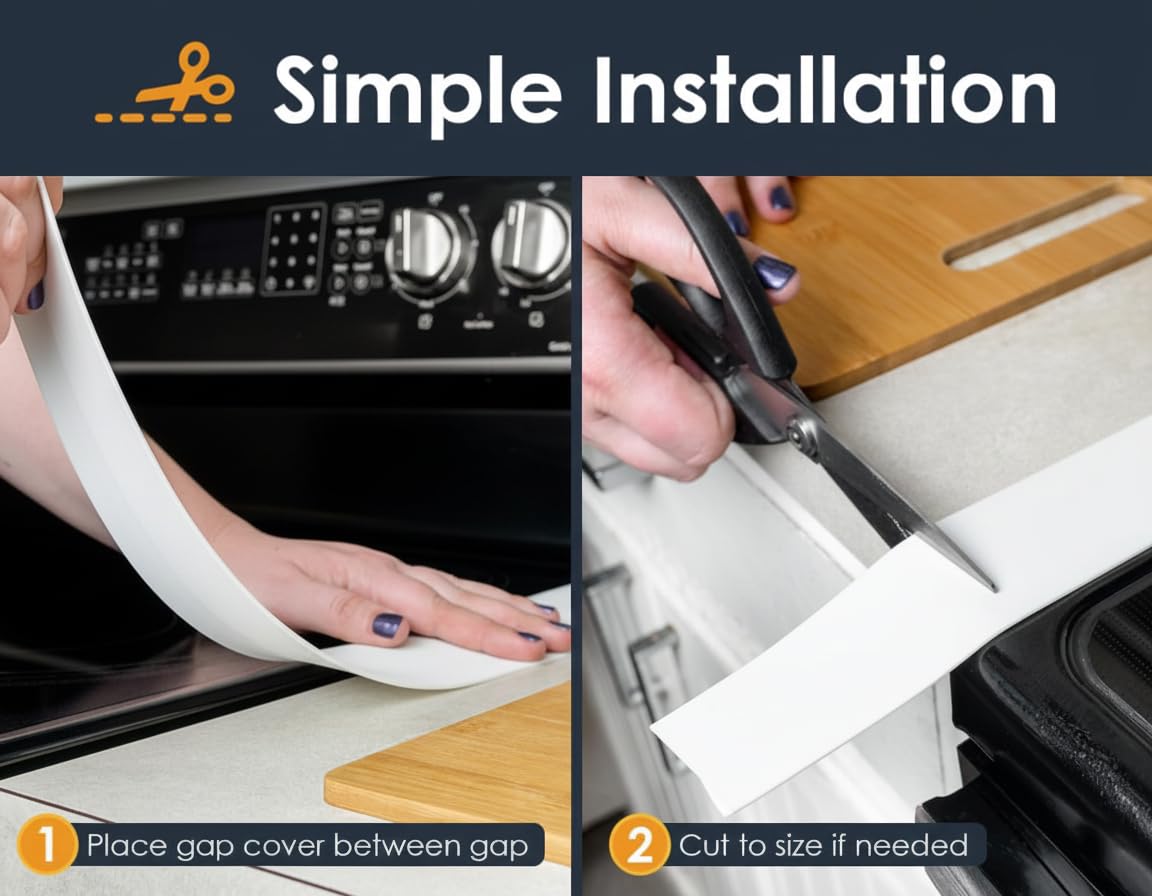 SIMPLE TO INSTALL: Our universal 25 inch stove gap guard sit perfectly in place on all stovetops. The non-slip flexible silicone conforms to your stove and counter surfaces and adapts to any uneven spaces. Easily customize to your stove by cutting to size using scissors