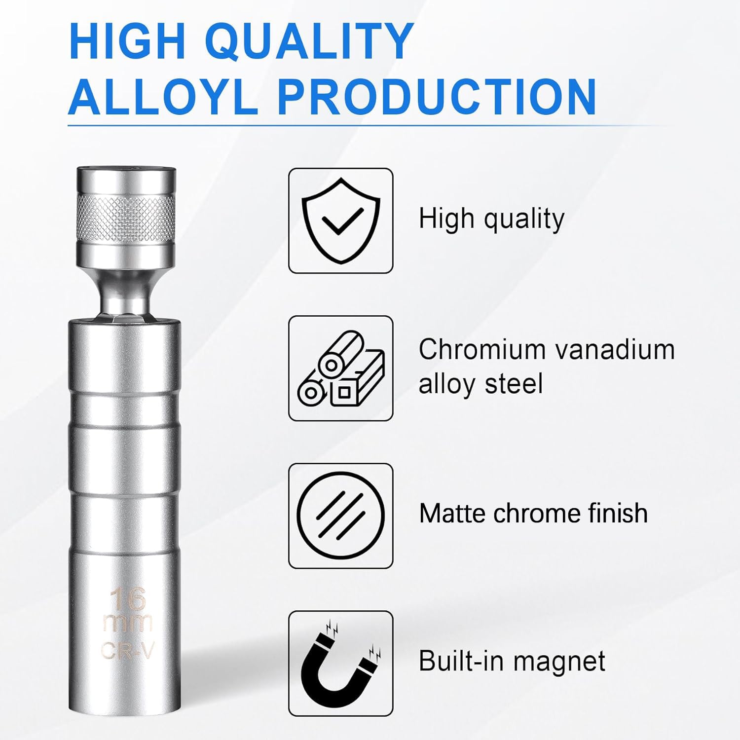 Specifications: 16mm Swivel Magnetic Spark Plug Socket Set, 3/8 Inch Drive Thin Wall Socket, Walls 2mm Thinner Than Standard Spark Plug Sockets, allowing you to better use and work in narrow or inaccessible places.