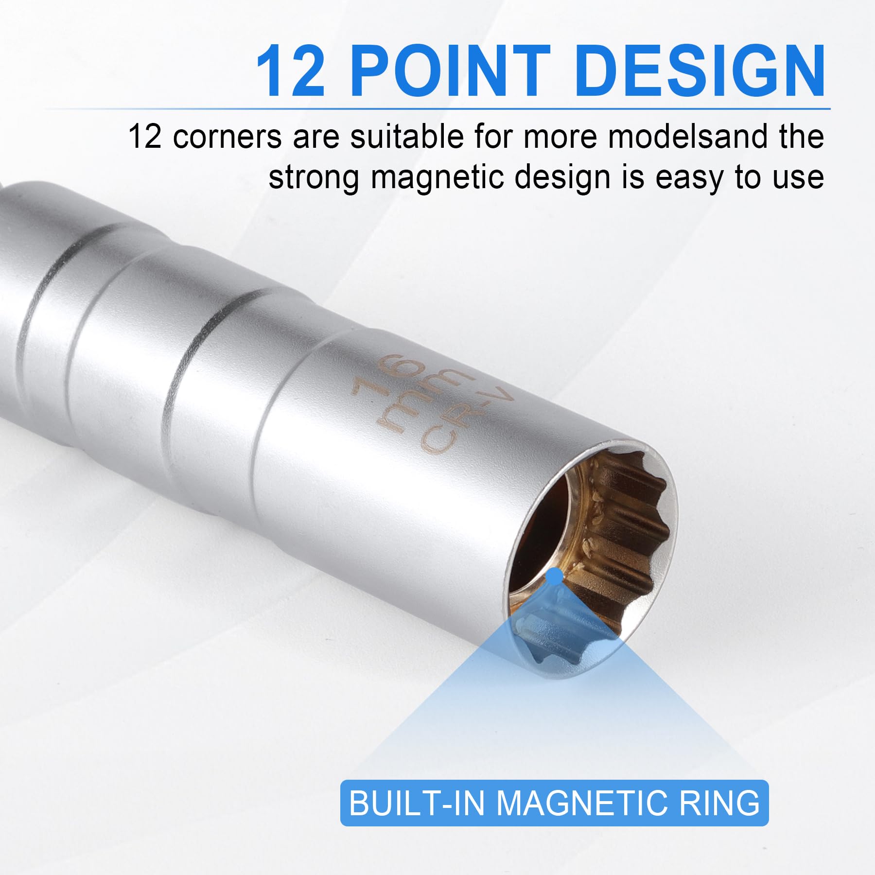 Design: 16mm thin wall spark plug socket has a built-in magnet, it can fix and protect the spark plug well, thereby minimizing damage.