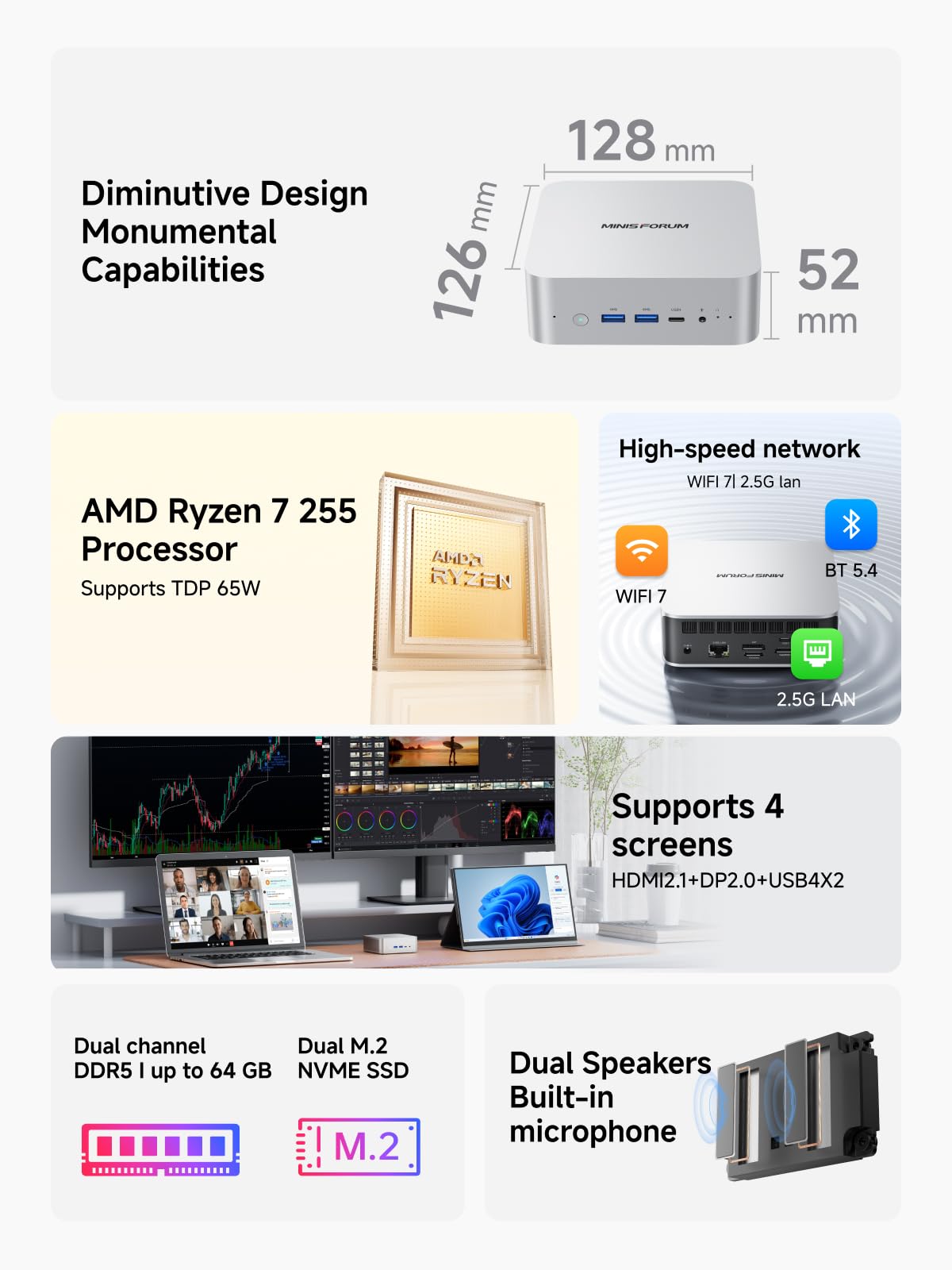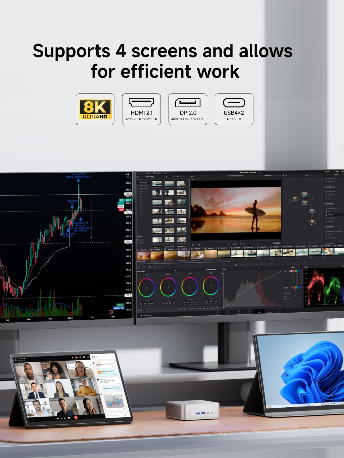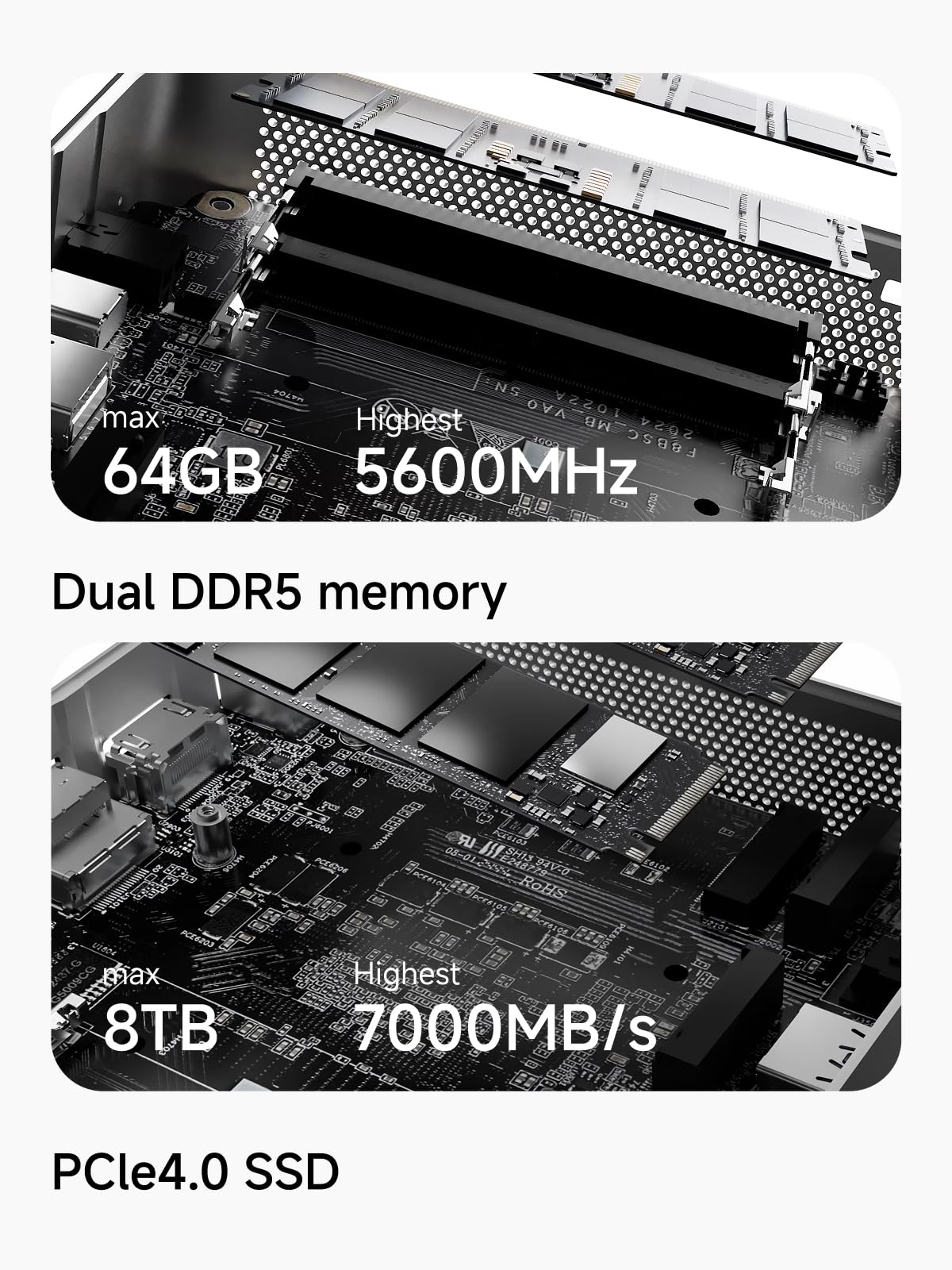 【High-speed memory &Extended Storage】: AI X1-255 Barebone mini pc supports DDR5 SODIMM, up to 5600 MT/s, up to 64 GB; dual M.2 2280 PCIe4.0×4 slots, each can be installed with up to 4 TB SSD, meeting the needs of large-capacity data processing and high-speed reading and writing, and faster startup and application loading.