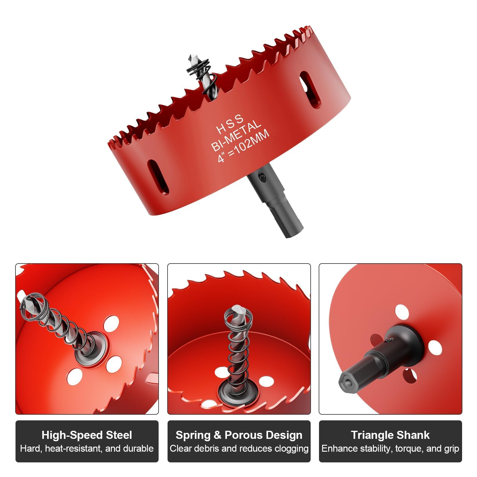 Ease to Use & Secure Clamping: The hole saw surface has clear size markings, allowing you to quickly select the desired hole saw model and get to work swiftly; The triangular shank design offers high compatibility, suitable for most standard drill chucks, especially handheld and bench drills; It facilitates quick and easy installation, preventing slipping, and ensuring a more stable grip that can withstand higher drilling torque, giving you peace of mind during use