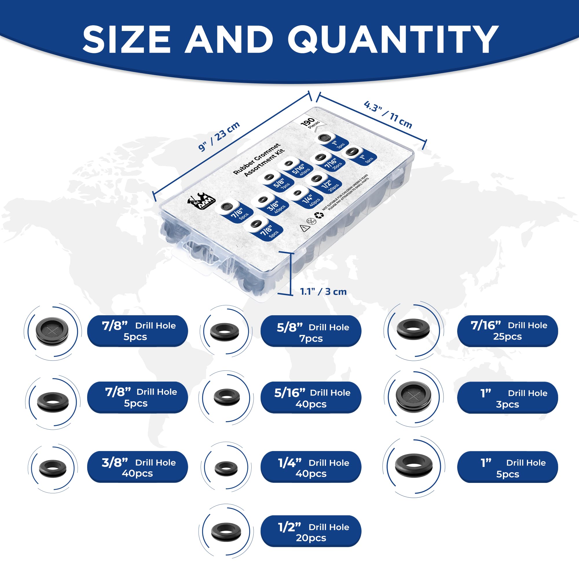 Vast & unique range: Grommets kit offering total 190 pcs with a variety of sizes. kit covers uniquely 3pcs 1", 5pcs 7/8" of closed grommets & 5pcs 1", 25pcs 7/16",20pcs 1/2" 40pcs 5/16", 40pcs 1/4", 7pcs 5/8" 40pcs 3/8", 5pcs 7/8" of wire grommets