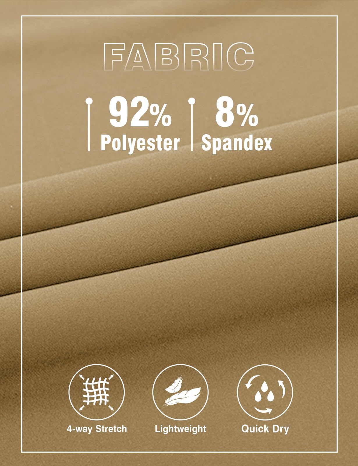 Quick Dry Fabric: Lightweight, breathable, moisture wicking, soft to skin, keeps you cool and comfortable