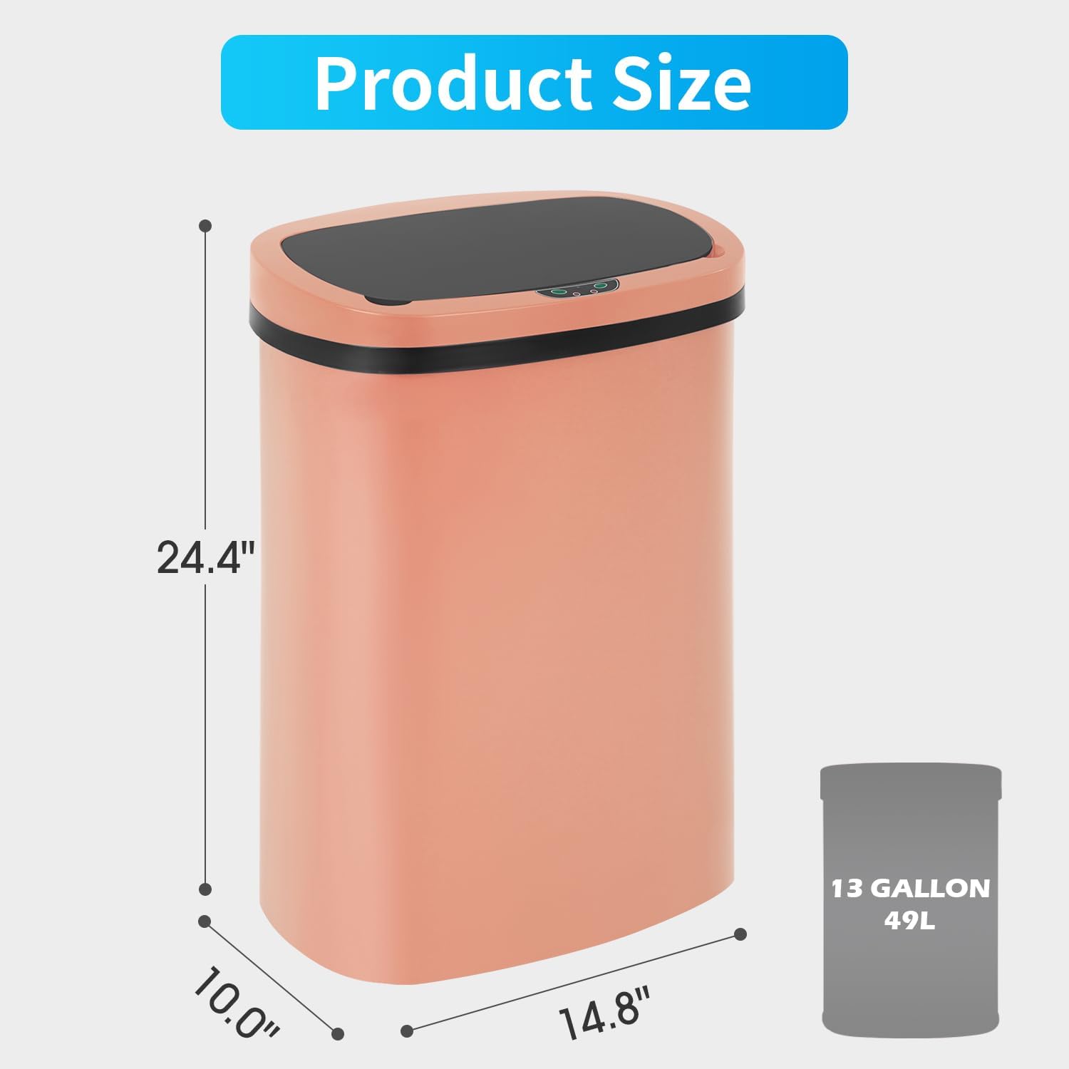 -- About Our Trash Can: -- This plastic trash can is without an inner bucket. The 13 gallon trash can without an inner bucket will be shorter and small than the mainstream 13 gallon trash can with an inner bucket on the market. If you like our automatic trash can style, please reconsider whether you can accept its short size before you buy it