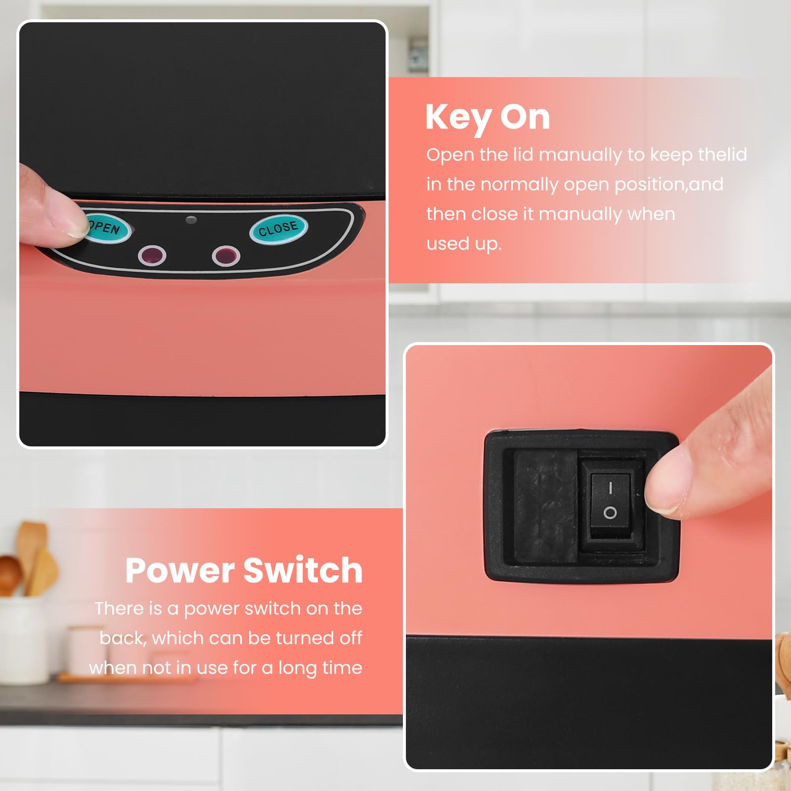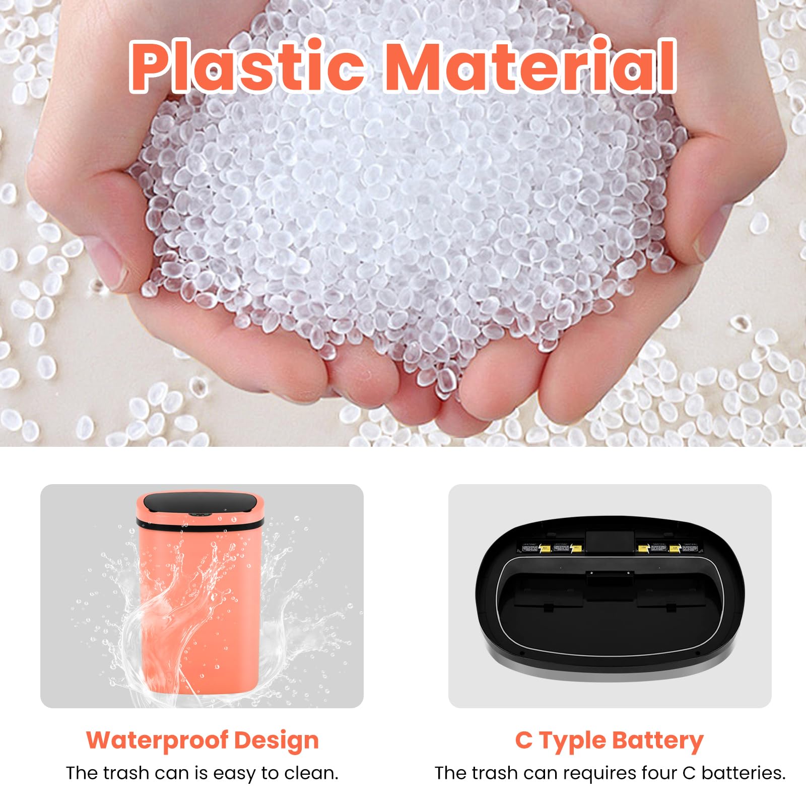 -- Our Trash Can Usage Tips: -- Our trash cans require four C type batteries. There is a power switch on the back of the lid so you can turn off the power when you don't use it for a long time. It can be used anywhere in your home, and of course in your office. We hope this trash can will bring a different experience to your life