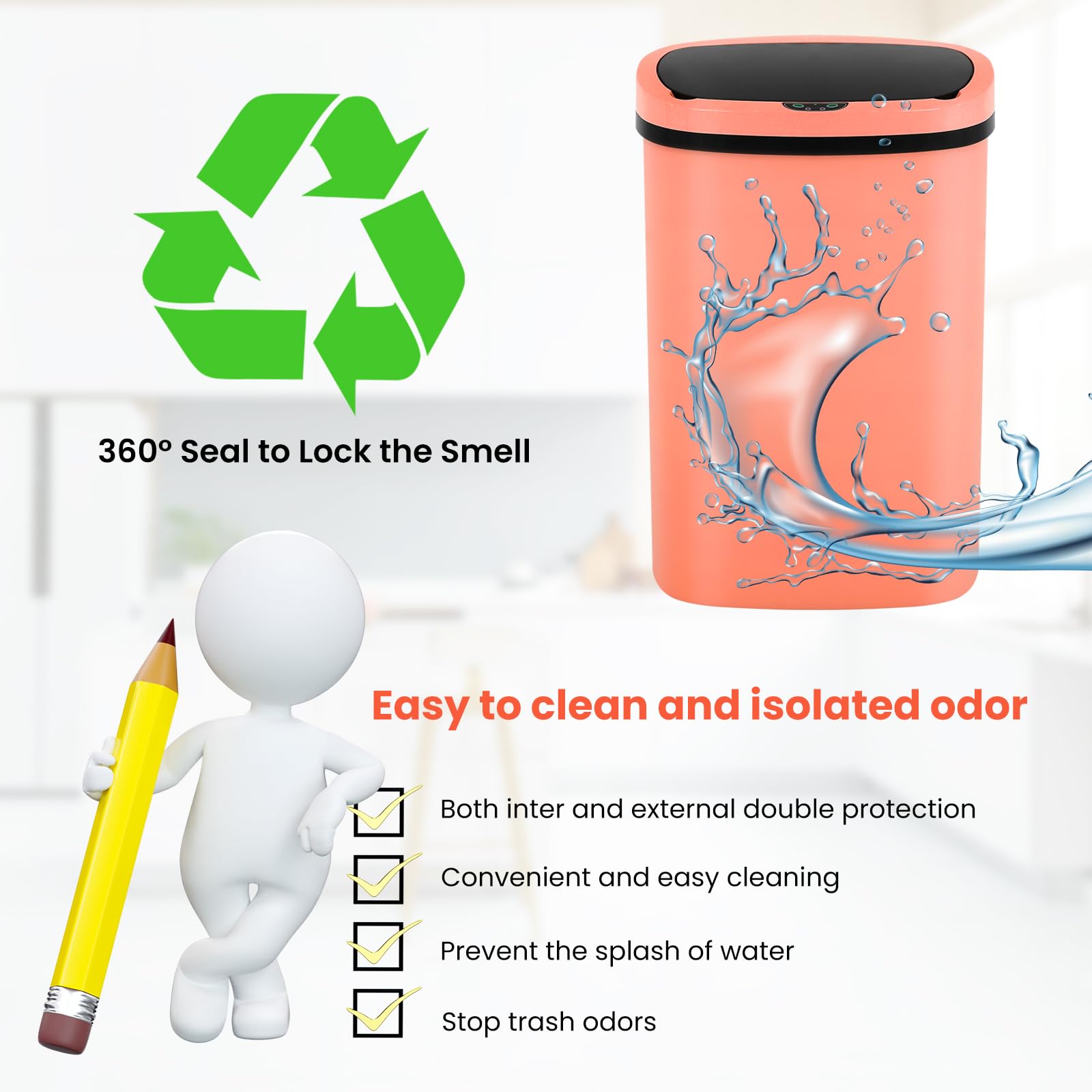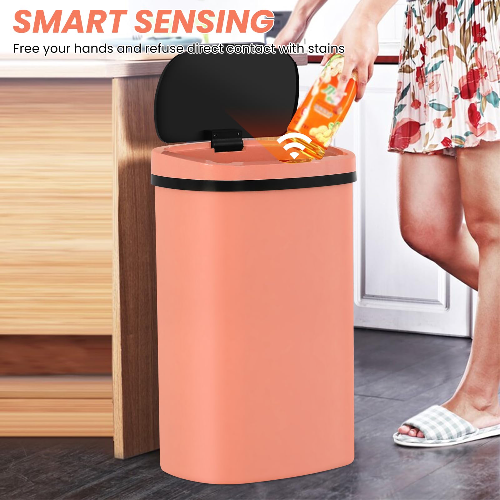 -- No Touch, More Hygienic: -- This automatic trash can is designed to be very user-friendly, you can throw the trash into the can without touching it, very clean and hygienic. This garbage can has an infrared sensor. You can trigger the sensor to open the lid by the proximity range of 6" of the sensor. The response time is about 0.8S. When the lid is opened, it will open for 7S and then close