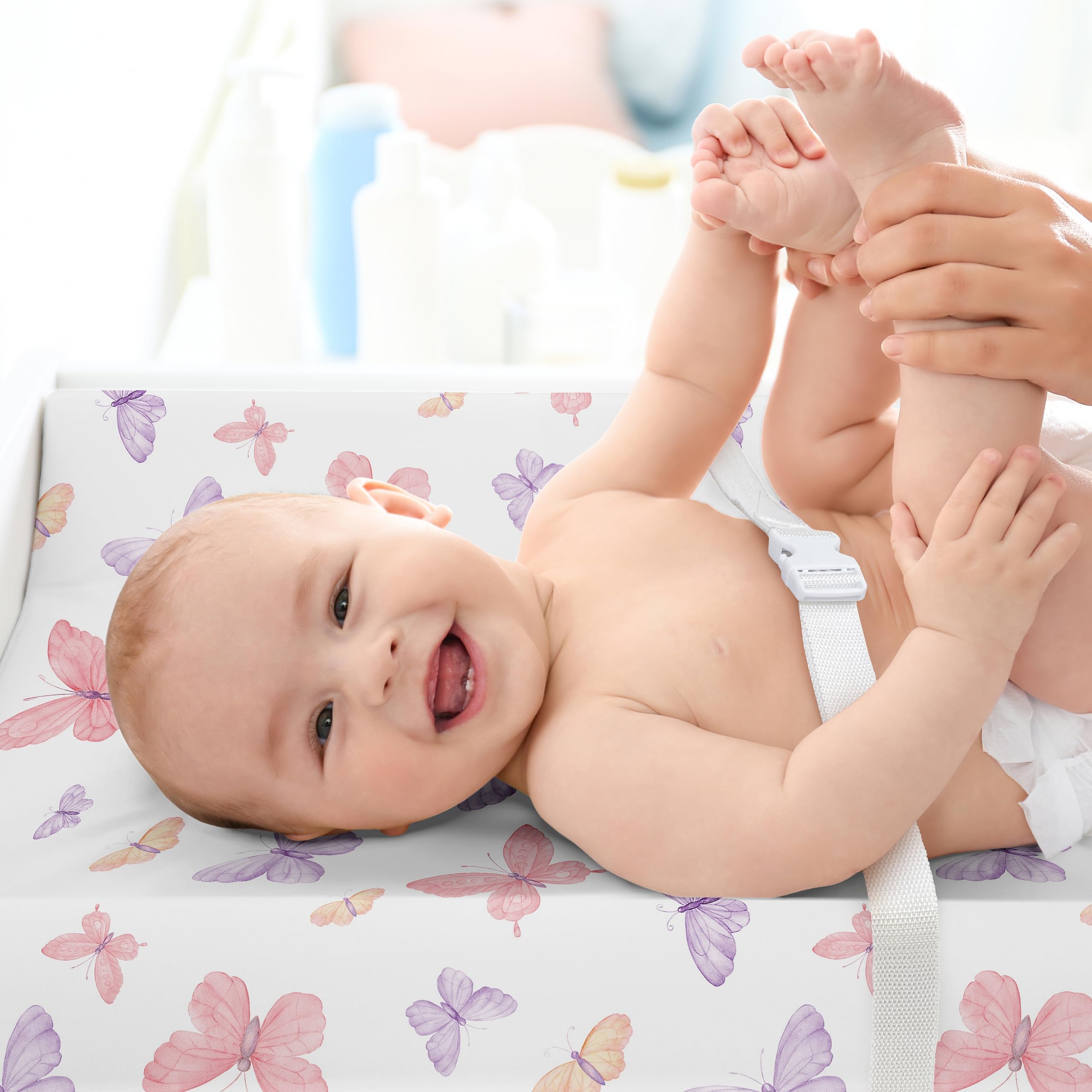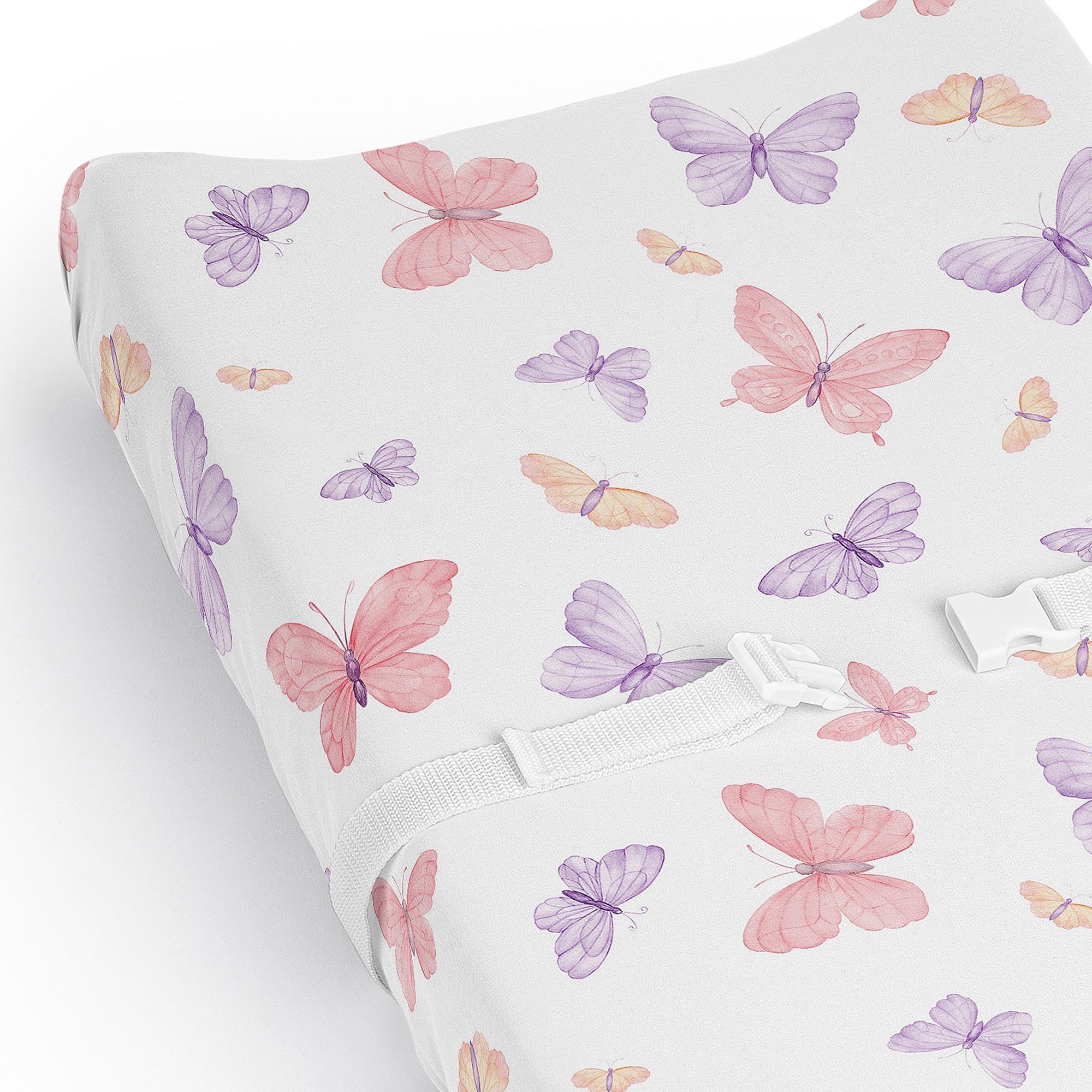 This brushed microfiber diaper pad cover sheet features an exclusive design of a blush pink, purple lavender and yellow shabby chic colorful pastel lilac watercolor butterfly pattern.
