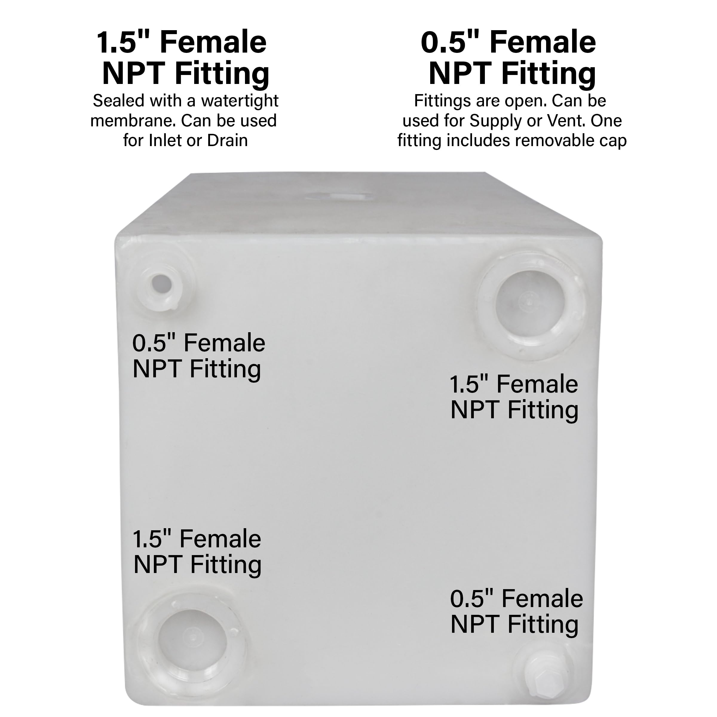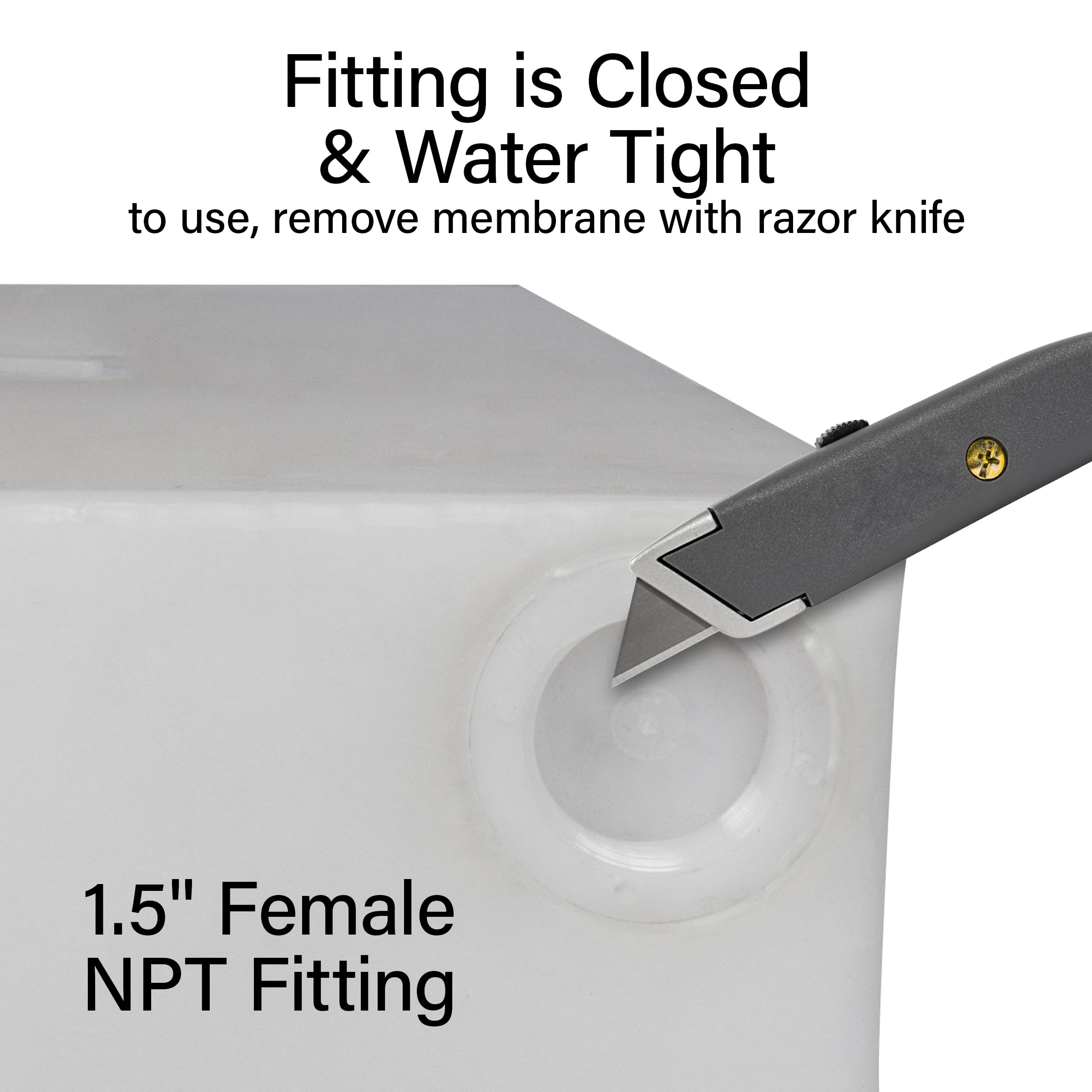 EASY TO INSTALL WATER STORAGE TANK: Fitting locations allow multiple options for installation of the 19 gallon water tank; Built-in fittings include (TWO) 1.5" balloon style threaded female NPT standard and (TWO) 0.5" threaded female NPT standard
