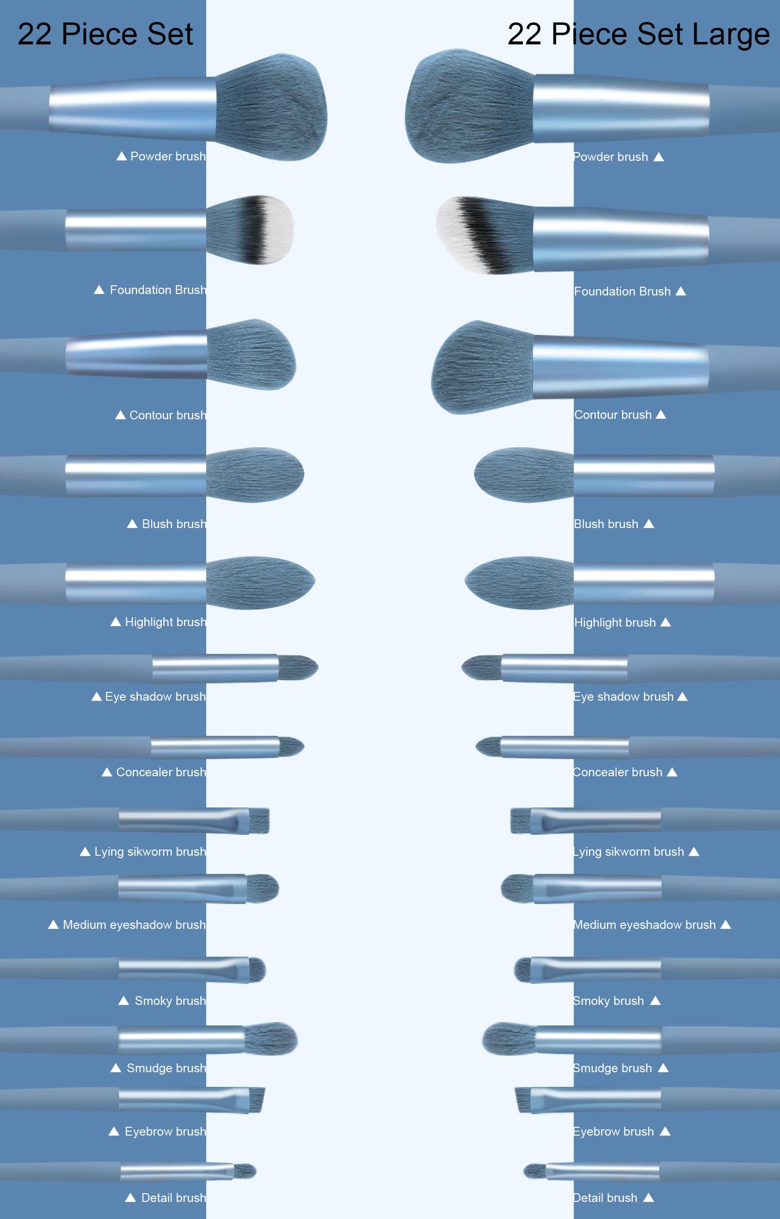 We have made combination Kit to meet various makeup needs.Make your makeup more convenient,Every beauty lovers should have a makeup kit such like this!!! Note: This set have two sizes(22 Piece Set and 22 Piece Set Large). Compare their differences see picture 4. The Regular brushes are suitable for beginners, The Large brushes are more suitable for professionals Please confirm your size before placing an order. Tips: If the logistics squeeze or packaging causes the bristles of the brush crooked, you can wash it and then use a hair dryer to straighten the bristles, so that the bristles will return to straight and even become more fluffy and good looking!