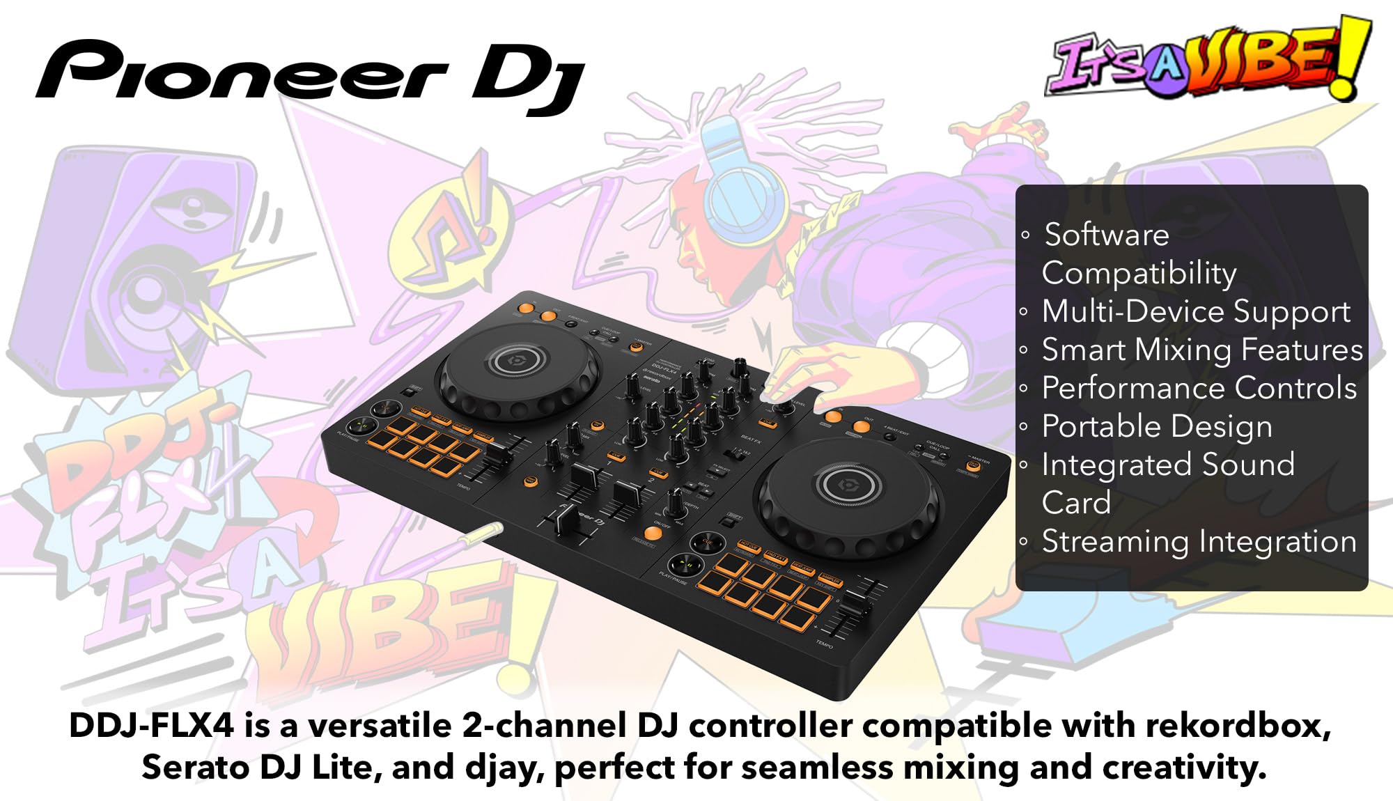USER FRIENDLY PORTABLE DESIGN: The layout of the controls on the DDJ-FLX4 makes it easy to learn to DJ and is inherited from professional Pioneer DJ products; Everything is simple to use and neatly arranged, which also makes the controller compact enough to take anywhere you want to practice or perform