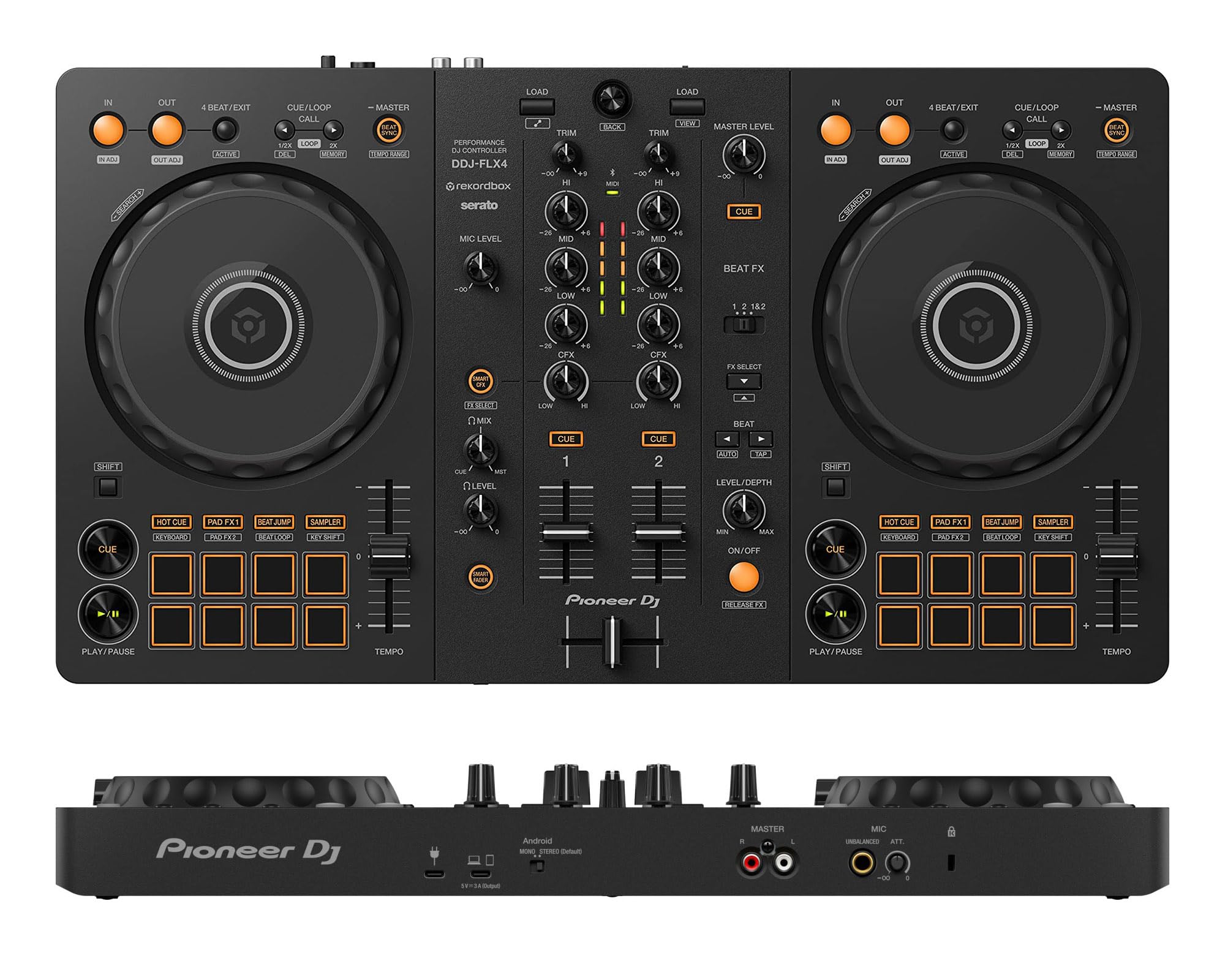 USB AUDIO OUTPUT: The DDJ-FLX4 makes it simple if you’re keen to MC or sing over the top of your sets because it mixes the audio for you; So, you can connect the controller to a single device and hear the sound of your mix together with the sound from the microphone as long as you don’t have a Bluetooth device connected