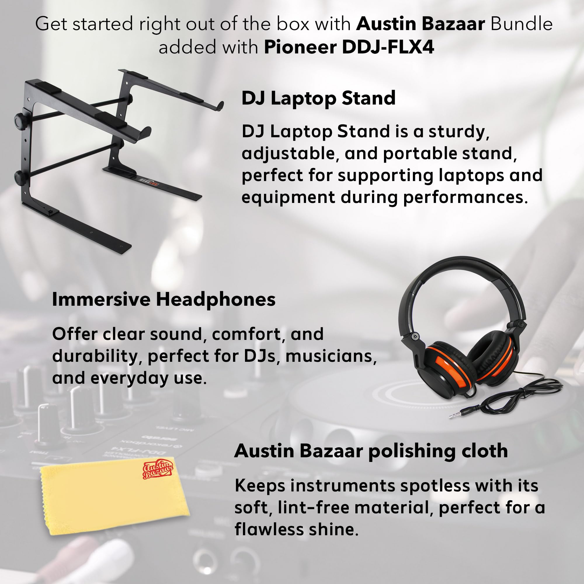 EVERYTHING YOU NEED IN ONE BOX: Austin Bazaar bundles your instrument with necessary accessories; This bundle contains a DJ laptop stand and a pair of headphones so you can begin using your instrument immediately; Keep your controller in mint condition with the included Austin Bazaar polishing cloth