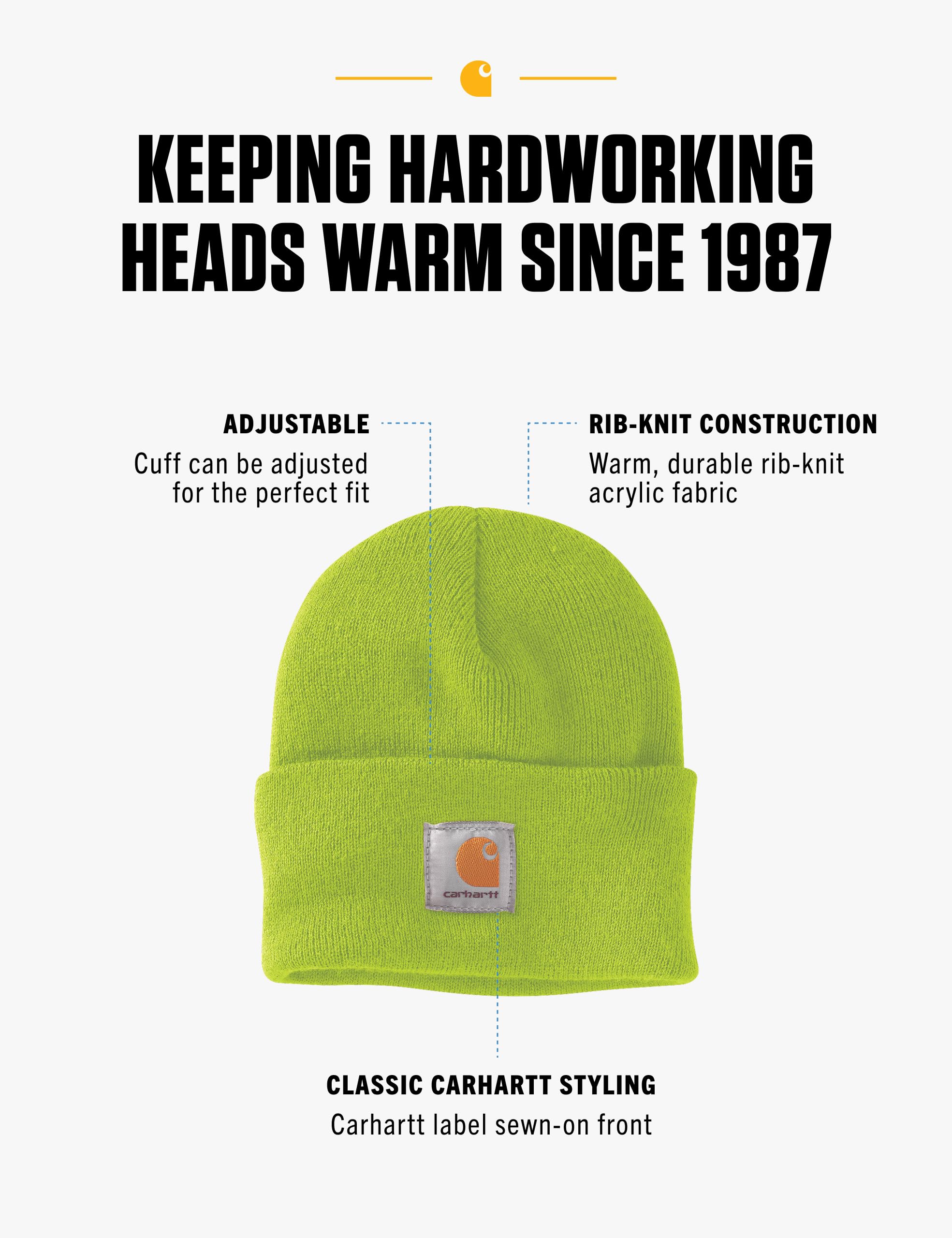 Description A cold-weather Carhartt classic that's been keeping hardworking heads warm since 1987. This men's acrylic watch hat is made of stretchy rib knit that's soft to the touch and finished with a Carhartt patch on the front.