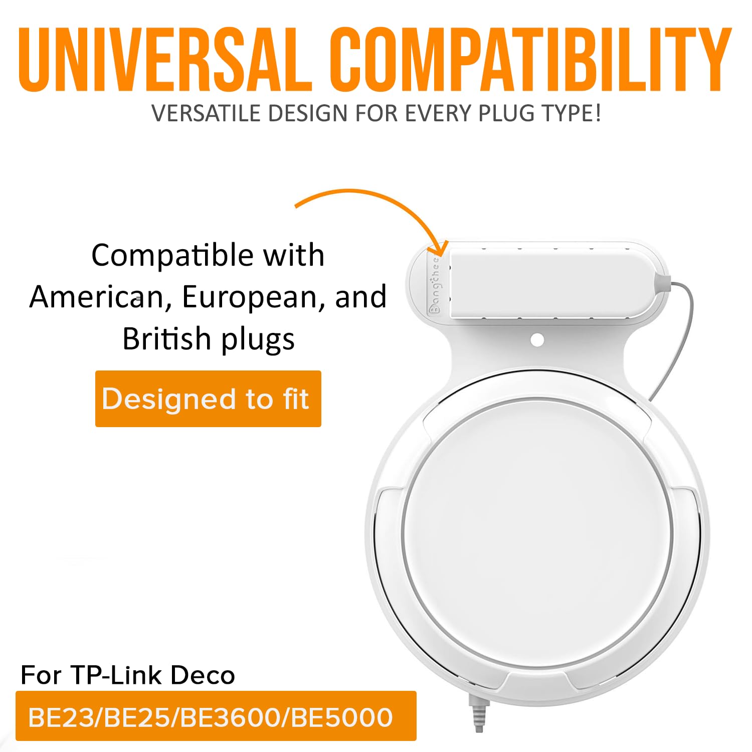 Concealed Cable Management & Customized Bracket: Get rid of tangled cables and complicated setup with our Wi-Fi wall mounting brackets. It is specially designed for the TP-Link Deco BE23/BE25/BE3600/BE5000 WiFi 7 system, allowing easy installation on any standard household power outlet—no drilling or screws required. With cable management tracks on the back, you can neatly hide power and Ethernet cables, keeping your space organized and clutter-free.