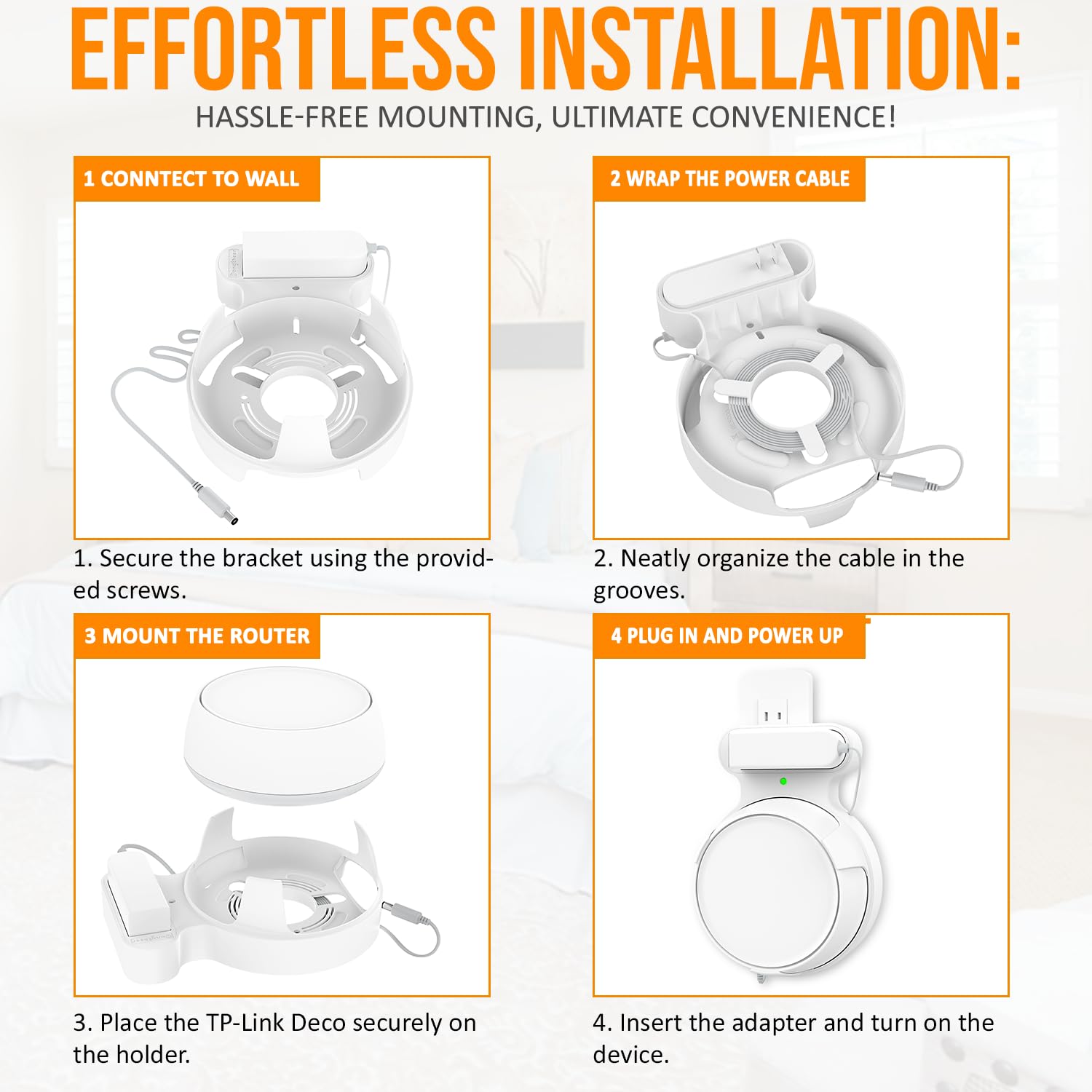 Clean & Efficient Cable Management: say goodbye to messy cables and hello to a neat and organized living space. Our wall-mounted cable organizer offers a dedicated area for your Deco BE23/BE25/BE3600/BE5000 WiFi 7 system router, keeping power and Ethernet cables tidy. By hiding cables behind the bracket, you can maintain a clean space and maximize the functionality of your room. It's time to declutter and create a visually pleasing setup that complements your home.