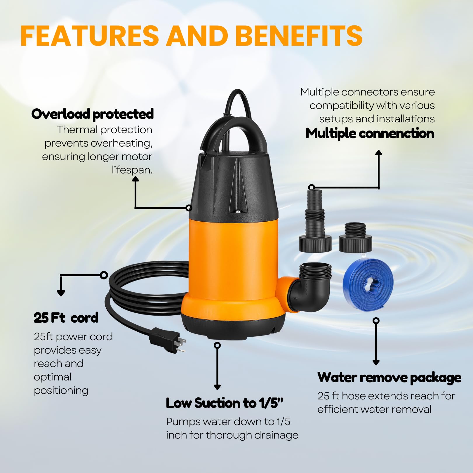 PORTABLE UTILITY PUMP: The 25ft. cable length allows for convenient water pumping in various applications. With a lightweight of just 10.8lbs, super quiet operation, and a convenient handle, it's the perfect solution for use around the house.