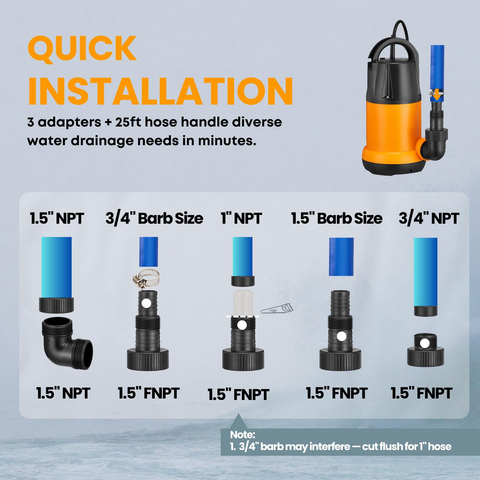 LOW SUCTION: This water pump can suction water as low as 1/5 inch. The outlet is 1 1/2 inches in diameter and comes with 2 adapters, compatible with 1'' and 1.5'' NPT threads as well as 3/4'' and 1'' barb fittings, ensuring versatile connectivity options.