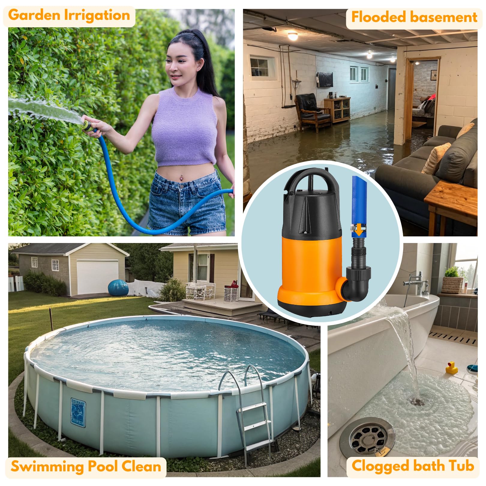 POWERFUL WATER PUMP: High-efficiency submersible water pump with 1 1/2HP power motor. Draining water up to 4000 Gallons Per Hour( 66 gallons per minute) at 5ft.. and has a max. lift capacity of 31 feet.