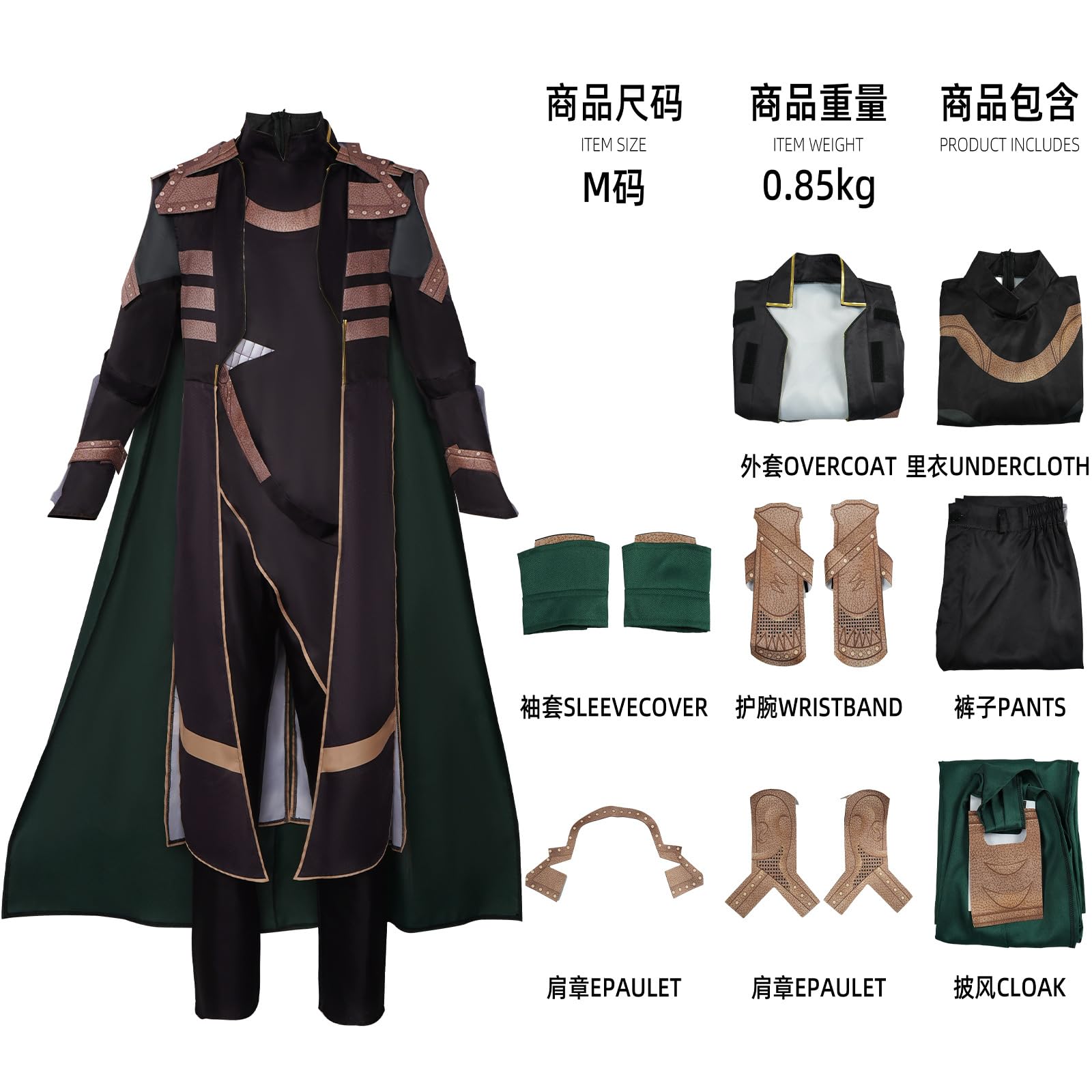 Description Loki Cosplay Top Jacket Robe Pants Battle Uniform Greeen Loki Costume Cape Cloak Halloween Outfits Mens Size Chart: X-Small: Height 165cm/65in, Chest 86-89cm/33-35in, Waist 71-74cm/28-29in, Hip 81-86cm/32-34in, Shoulder Width 44cm/17.3in Small: Height 170cm/67in, Chest 92-97cm/36-38in, Waist 76-79cm/30-31in, Hip 90-95cm/35-37in, Shoulder Width 46cm/18.1in Medium: Height 175cm/69in, Chest 99-104cm/39-41in, Waist 81-86cm/32-34in, Hip 97-102cm/38-40in, Shoulder Width 48cm/18.9in Large: Height 180cm/71in, Chest 107-112cm/42-44in, Waist 89-94cm/35-37in, Hip 105-110cm/41-43in, Shoulder Width 50cm/19.7in X-Large: Height 185cm/73in, Chest 114-119cm/45-47in, Waist 97-99cm/38-39in, Hip 112-117cm/44-46in, Shoulder Width 52cm/20.5in XX-Large: Height 190cm/75in, Chest 122-127cm/48-50in, Waist 104-109cm/41-43in, Hip 119-125cm/47-49in, Shoulder Width 54cm/21.3in XXX-Large: Height 195cm/77in, Chest 127-135cm/50-53in, Waist 112-117cm/44-46in, Hip 125-132cm/49-52in, Shoulder Width 56cm/22in
