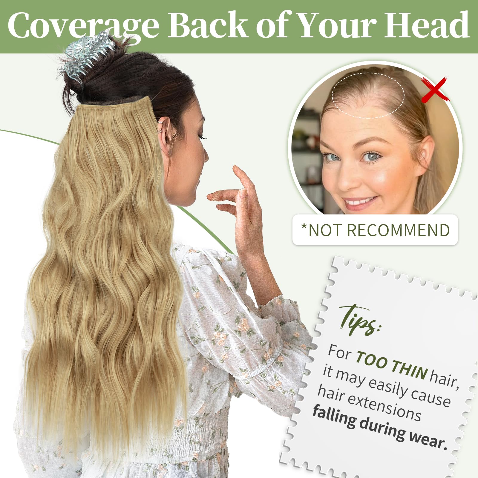 Easy to Apply: 1. Position the wire hair extensions over your head like a headband. 2. fix the 4 clips in your hair. 3. Use your own hair to hide the wire. Taking less time for instantly thicker and longer hair in few minutes.