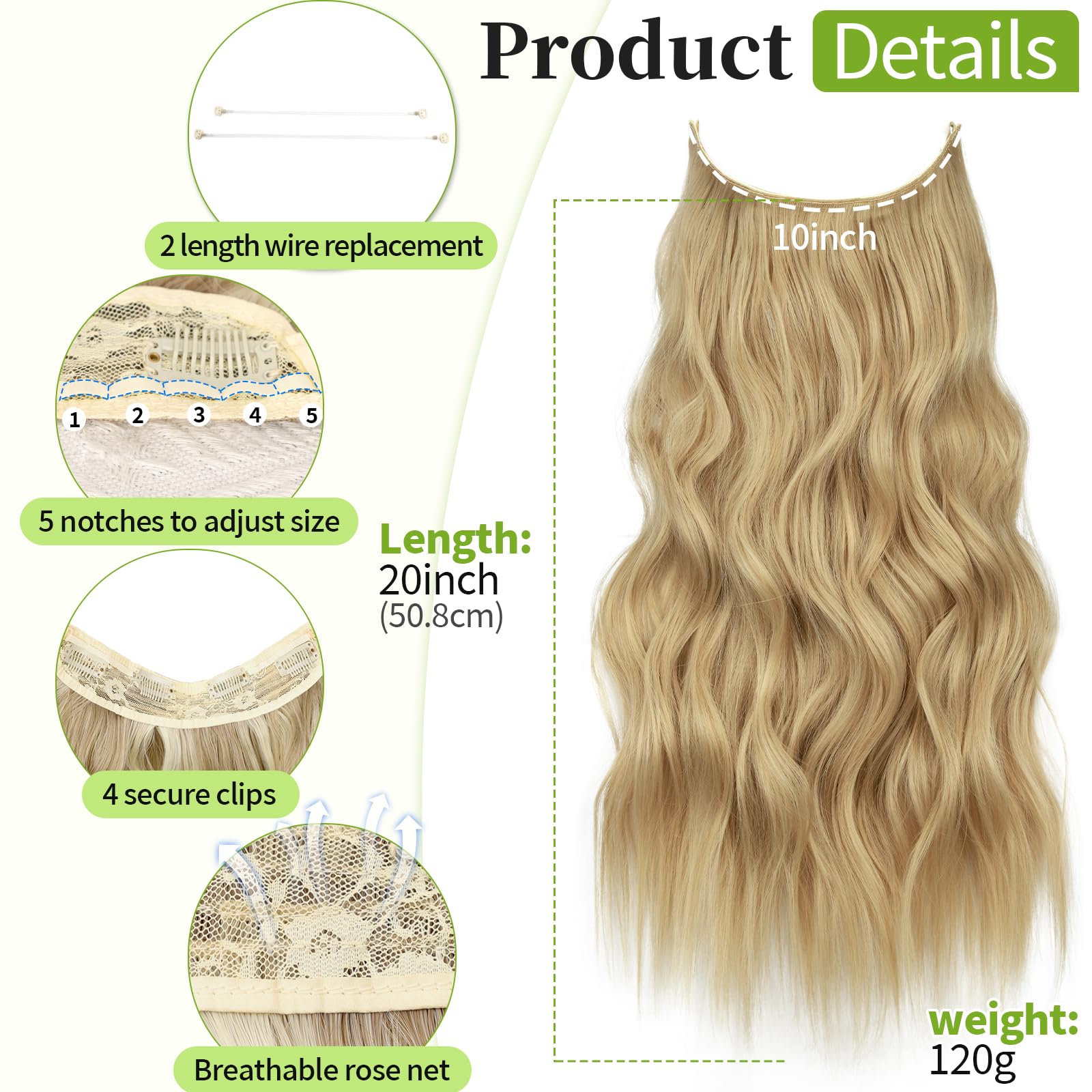 Specification: Each pack includes: 1 piece of 4 clips in wefts; 2 wires in different length for replacement; adjustable hooks get the most suitable size. Upgraded wire is thicker and more elastic, not easy to break and not cause any pressure on the scalp.